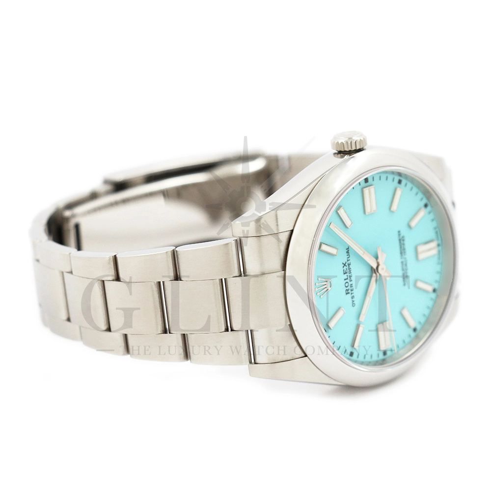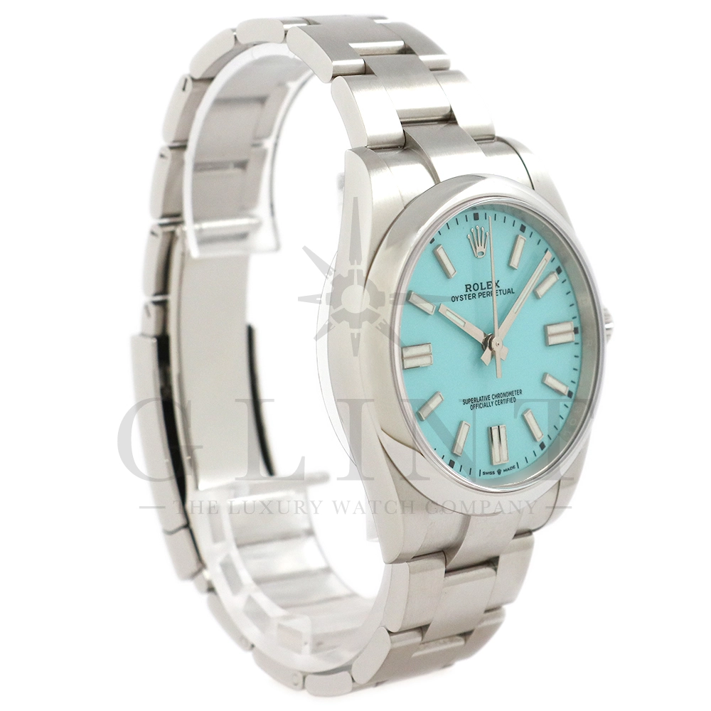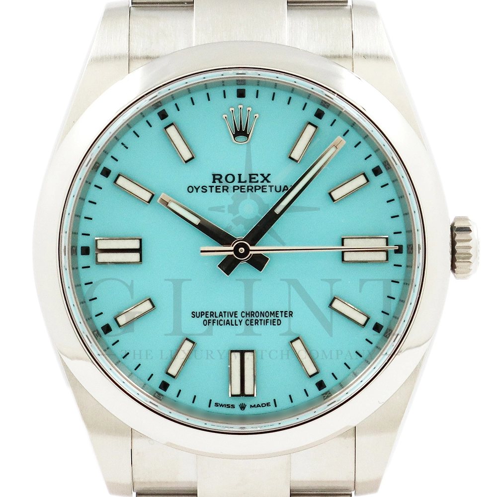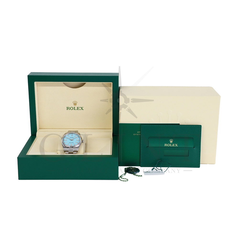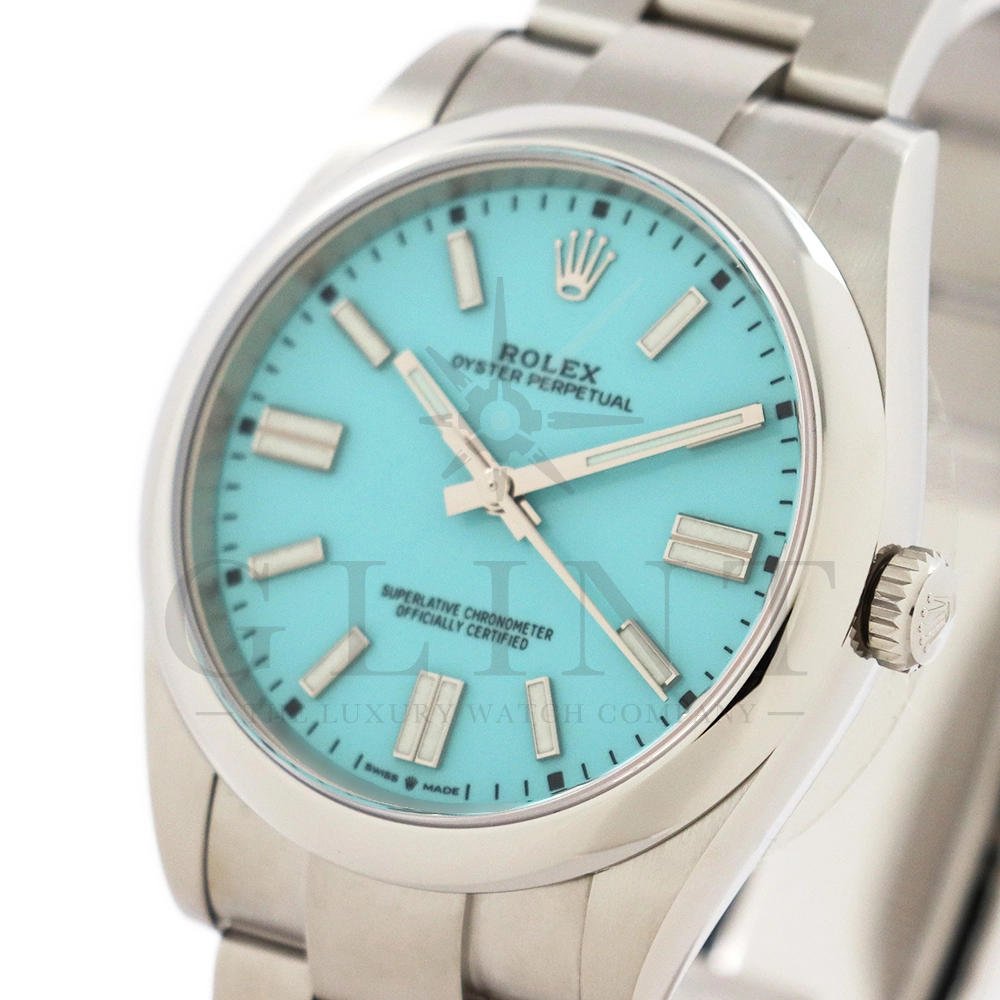 こちらはオイスターパーペチュアル 41です。前作114300の39mmから41mmへとサイズアップし、文字盤のカラー展開が7色にも渡る幅広いラインナップとなった124300。文字盤には7色の中でも最も注目度が高いターコイズブルーを採用しており、とても発色が良く腕元を華やかに演出してくれるでしょう。ムーブメントは特許申請済みの耐磁性に優れたブルーパラクロムヒゲゼンマイを使用したキャリバー3230を搭載しており、パワーリザーブは70時間を誇ります。現行のオイスターパーペチュアルはサイズとカラー共にとても豊富な展開になっており、自分に合ったサイズとカラーをご選択が可能な為、男女ペアルックで付けたい方にもぜひお勧めしたいモデルです。