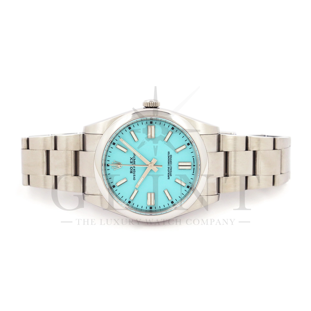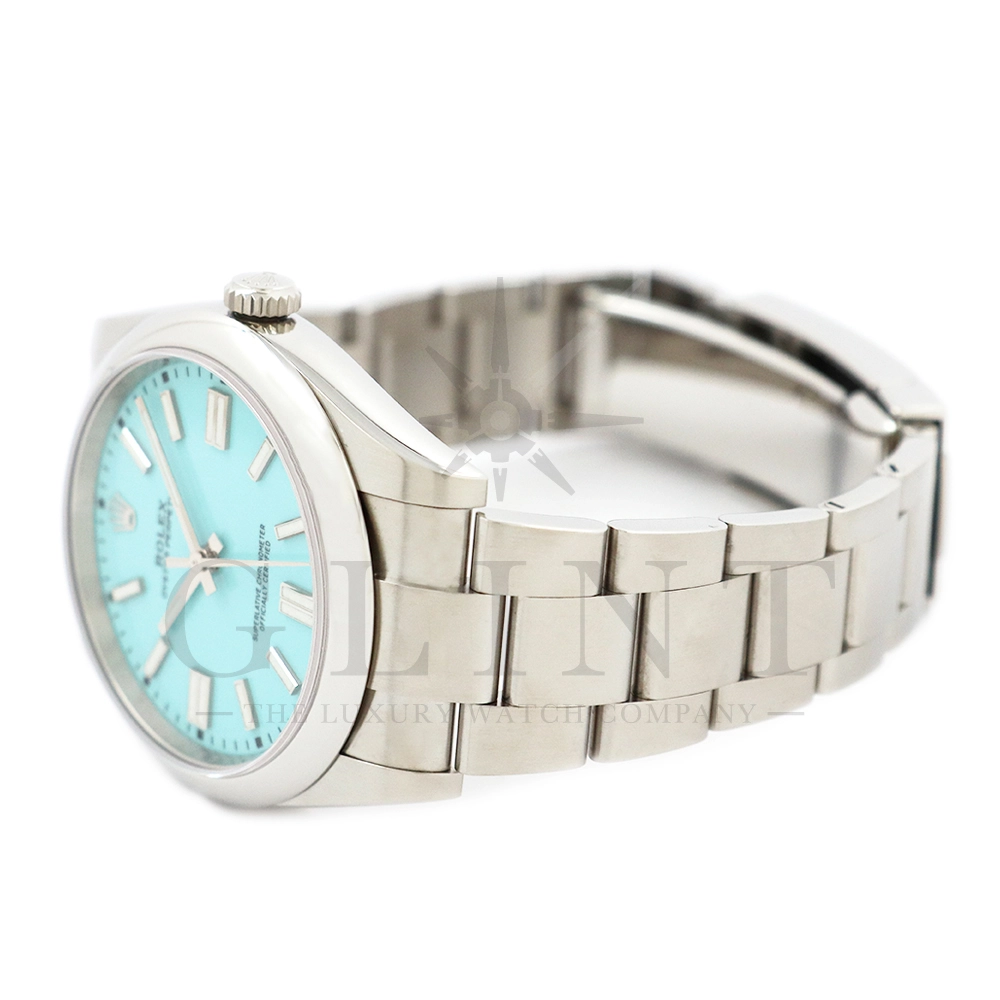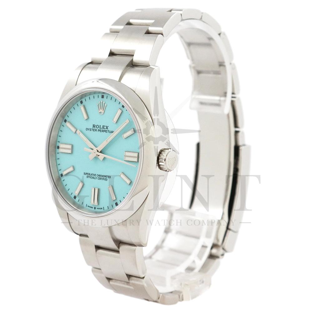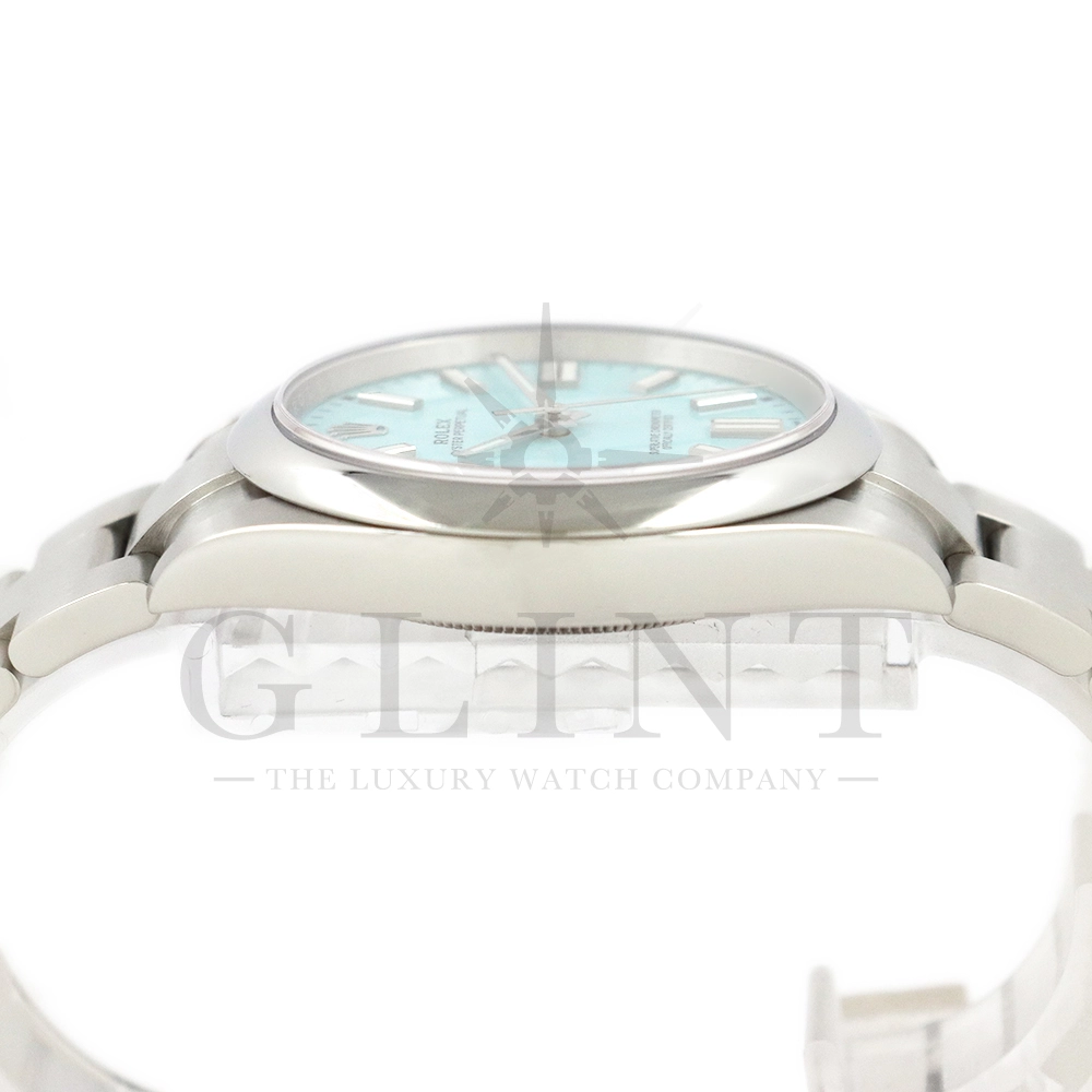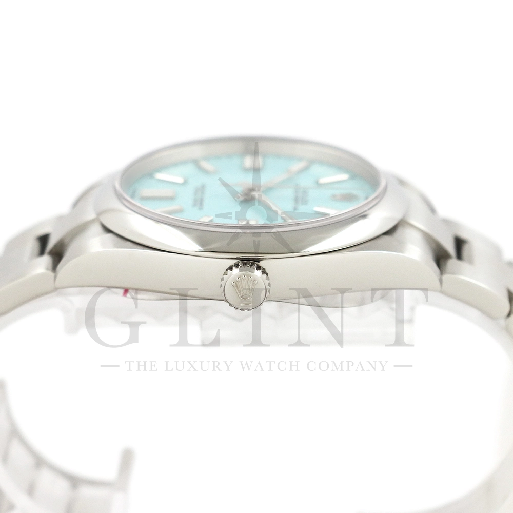 こちらはオイスターパーペチュアル 41です。前作114300の39mmから41mmへとサイズアップし、文字盤のカラー展開が7色にも渡る幅広いラインナップとなった124300。文字盤には7色の中でも最も注目度が高いターコイズブルーを採用しており、とても発色が良く腕元を華やかに演出してくれるでしょう。ムーブメントは特許申請済みの耐磁性に優れたブルーパラクロムヒゲゼンマイを使用したキャリバー3230を搭載しており、パワーリザーブは70時間を誇ります。現行のオイスターパーペチュアルはサイズとカラー共にとても豊富な展開になっており、自分に合ったサイズとカラーをご選択が可能な為、男女ペアルックで付けたい方にもぜひお勧めしたいモデルです。