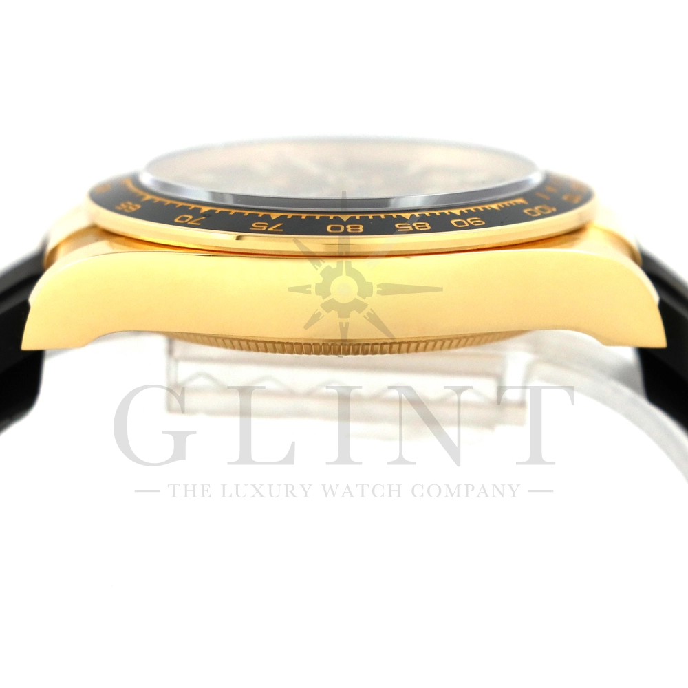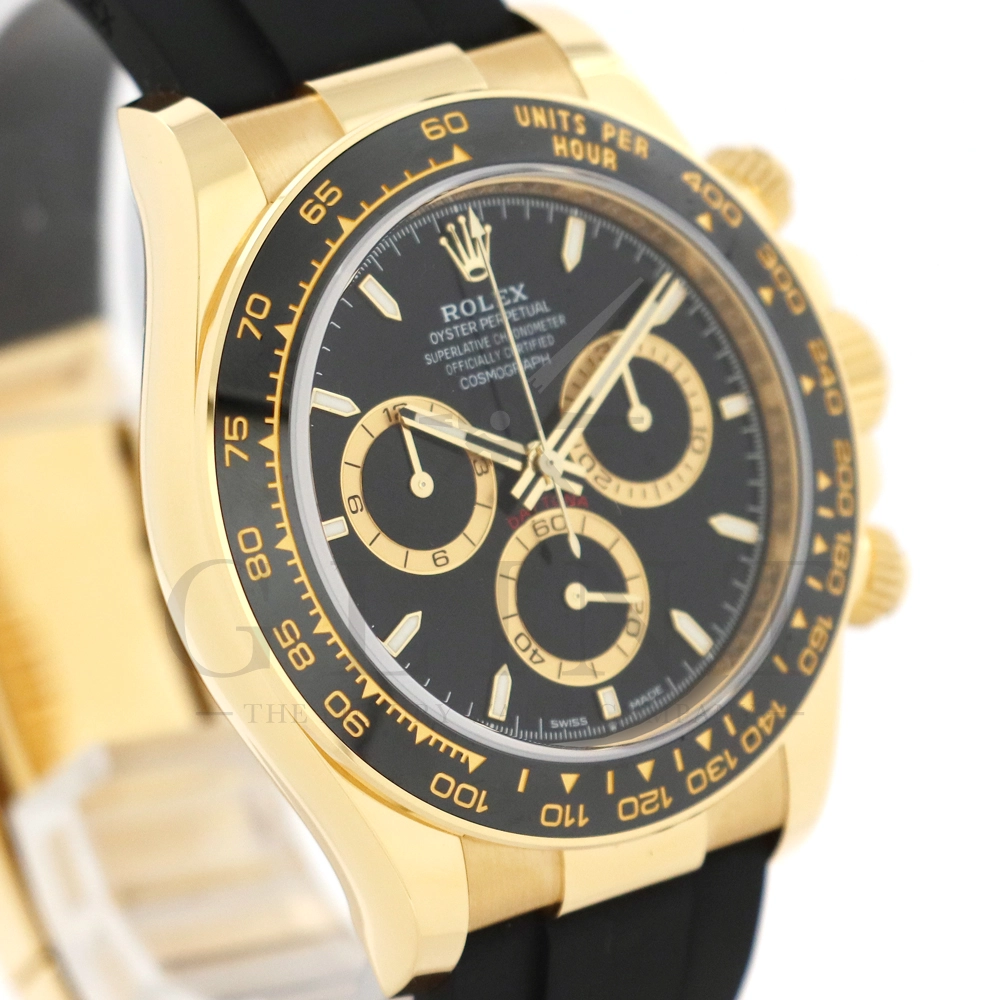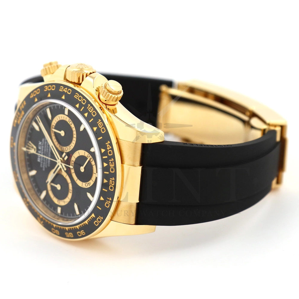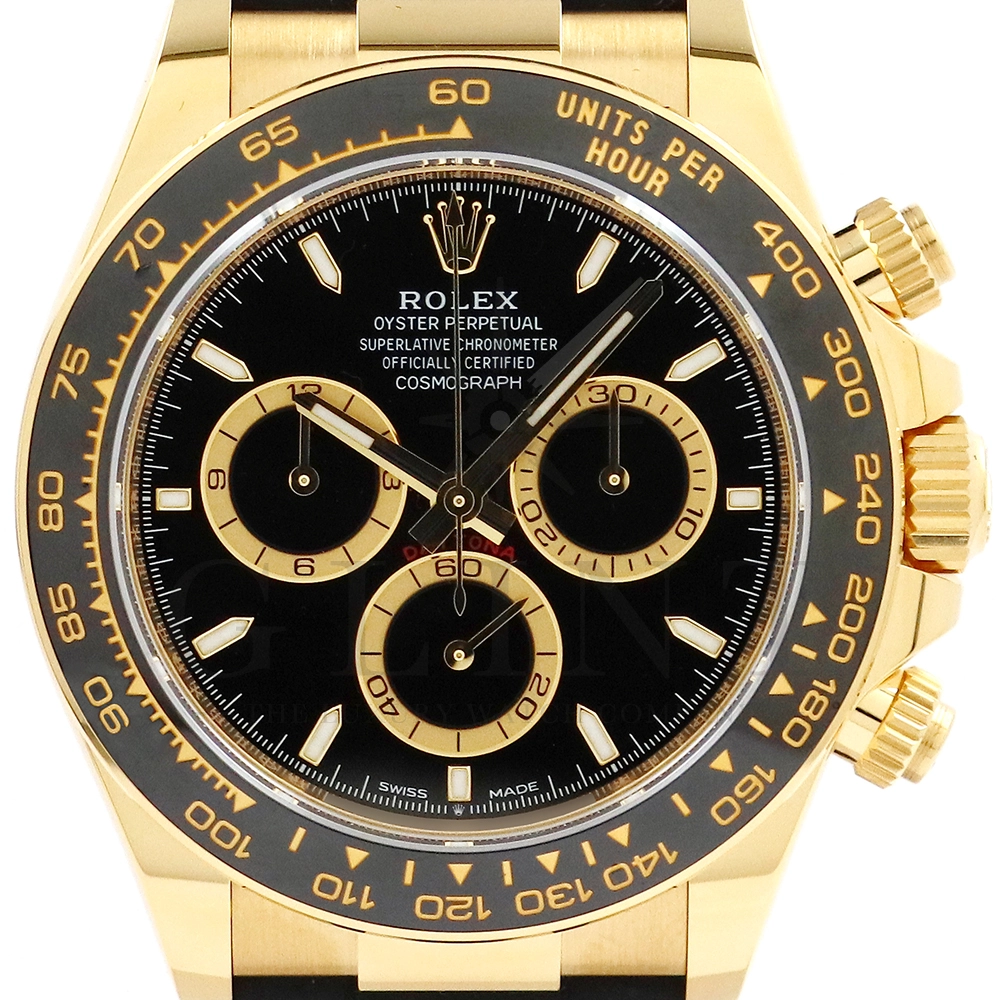 こちらはロレックス デイトナです。コスモグラフ デイトナ誕生60周年を迎えた2023年に新モデルとして生まれ変わりました。ダイアルのアワーマーカーとカウンター目盛り等のグラフィックバランスが一新され、自社開発・製造の新ムーブメントCal.4131を搭載。エネルギーロスを低減するクロナジー エスケープメント、耐衝撃性に優れるパラフレックス ショック・アブソーバ等の革新技術が採用されております。18Kイエローゴールドのケースに文字盤は精悍なブラックダイヤル、インダイヤルには鮮やかなイエローゴールドカラーとなっており、全体的にまとまった印象を与えてくれるでしょう。また、バックルもグライドロックエクステンションシステムが搭載された事で容易にサイズを調整できる事で実用性が高まりました。さらに進化したデイトナは必ずや所有者を満足させることは間違いありません。