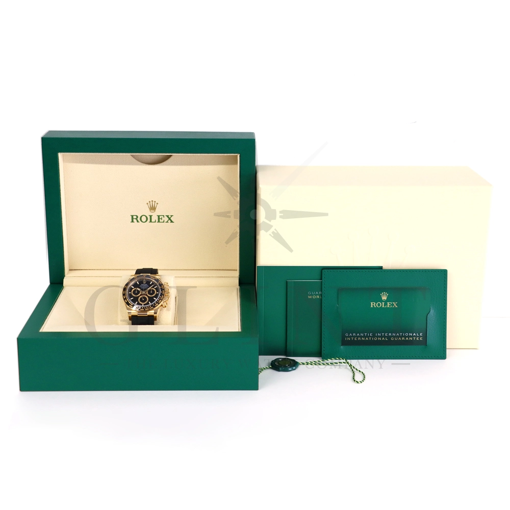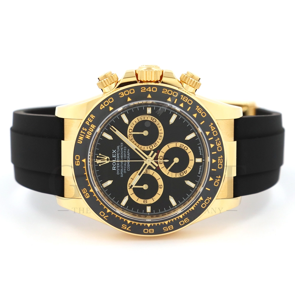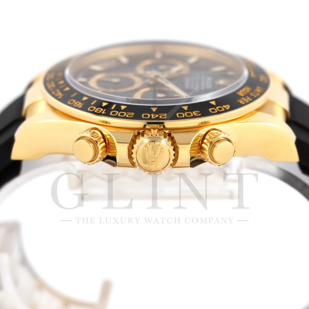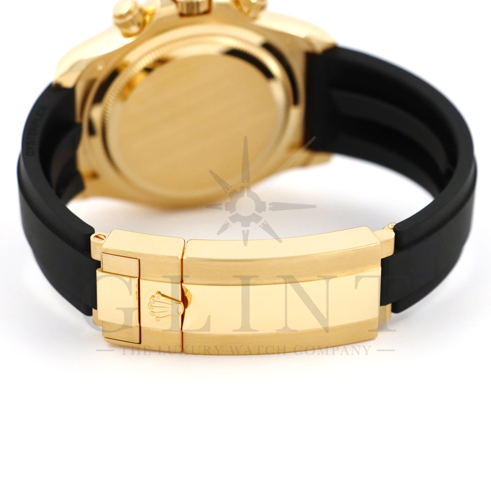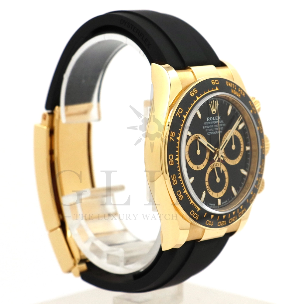 こちらはロレックス デイトナです。コスモグラフ デイトナ誕生60周年を迎えた2023年に新モデルとして生まれ変わりました。ダイアルのアワーマーカーとカウンター目盛り等のグラフィックバランスが一新され、自社開発・製造の新ムーブメントCal.4131を搭載。エネルギーロスを低減するクロナジー エスケープメント、耐衝撃性に優れるパラフレックス ショック・アブソーバ等の革新技術が採用されております。18Kイエローゴールドのケースに文字盤は精悍なブラックダイヤル、インダイヤルには鮮やかなイエローゴールドカラーとなっており、全体的にまとまった印象を与えてくれるでしょう。また、バックルもグライドロックエクステンションシステムが搭載された事で容易にサイズを調整できる事で実用性が高まりました。さらに進化したデイトナは必ずや所有者を満足させることは間違いありません。