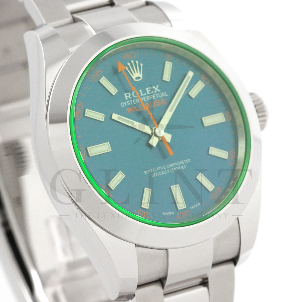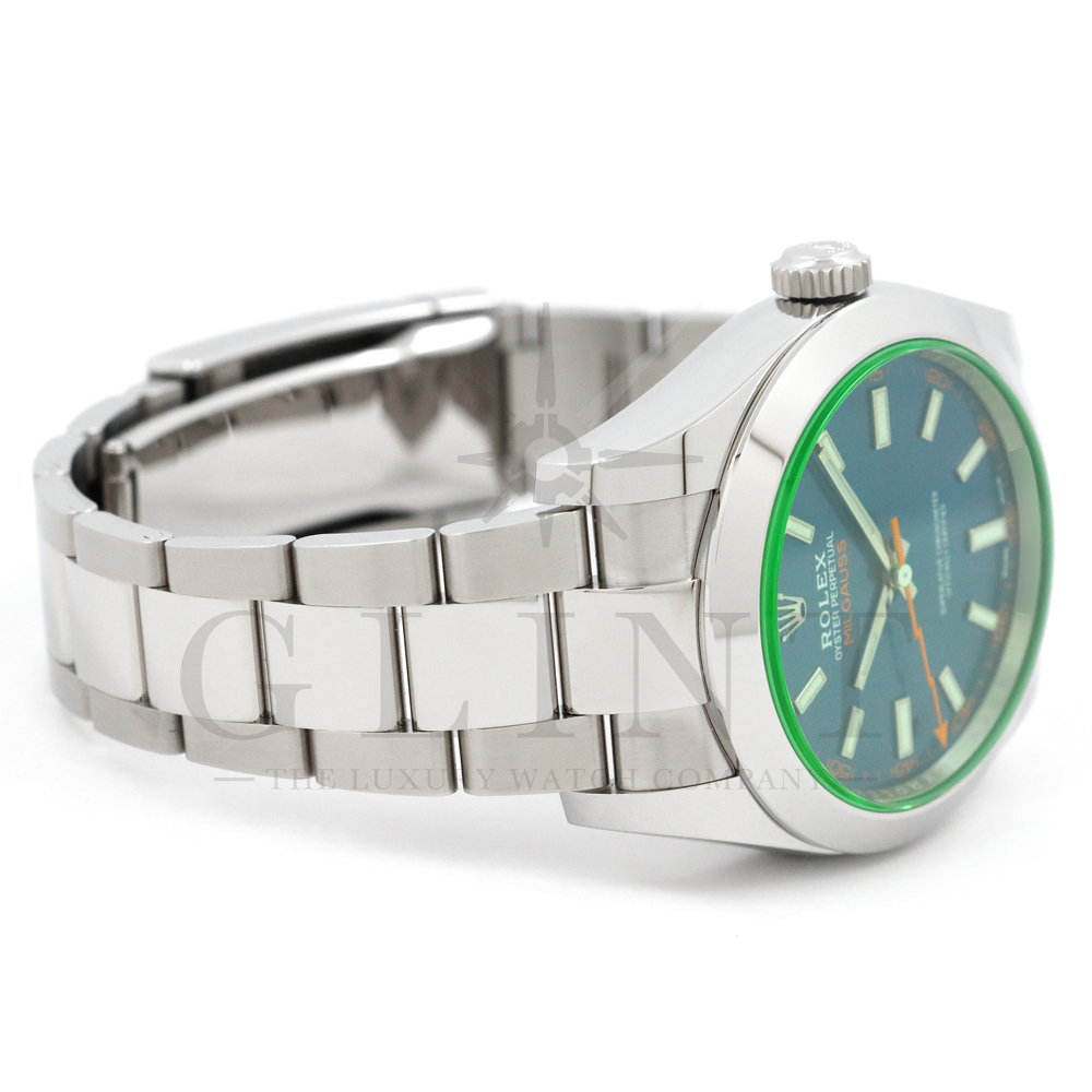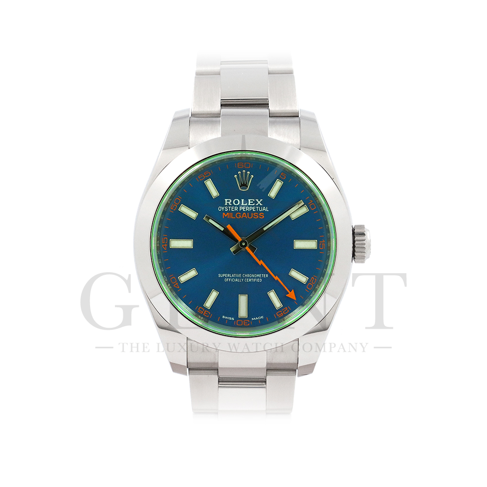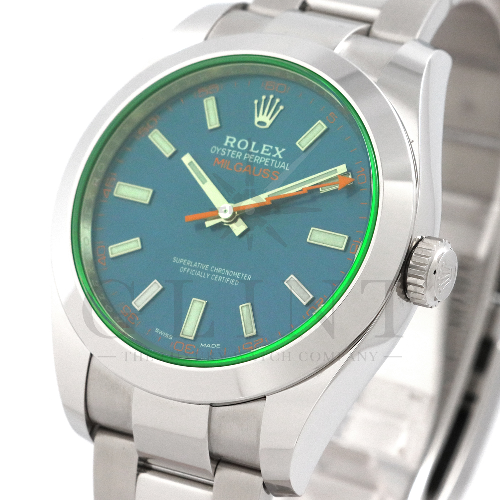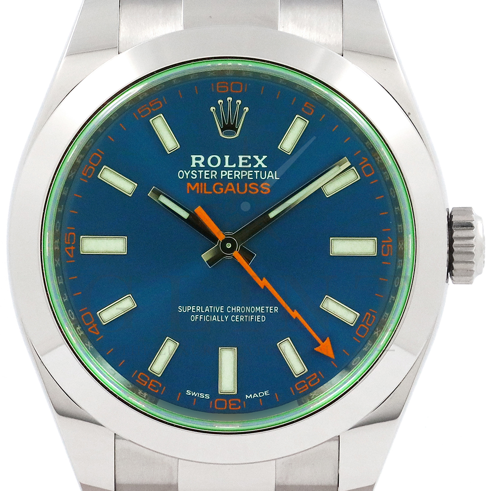 こちらはロレックス ミルガウスです。初代モデルを彷彿とさせるイナズマ針(秒針)と2代目のシンプルなフォルムを継承し、2007年に復活を遂げた耐磁時計ミルガウス。磁気を遮断するための軟鉄製インナーケースが内蔵されており、裏蓋の外周部分には「ROLEX」、「MILGAUSS」、そして王冠マークが刻印され、機能やデザインをはじめ、総合的に特殊な仕様のミルガウスは他のモデルとの差別化が図られております。また、116400GVの風防となるサファイアクリスタルのみロレックスのコーポレートカラーであるグリーンを使用しており、唯一無二の特別感を感じさせてくれるでしょう。2014年より新たに加わったZブルーダイヤルは美しい色合いでグリーンカラーのサファイアクリスタルガラスとのコントラストは絶妙です。随所にロレックスのこだわりが感じられるモデルと言えるでしょう。