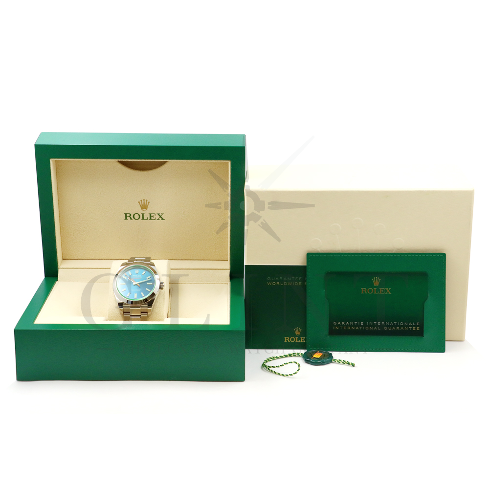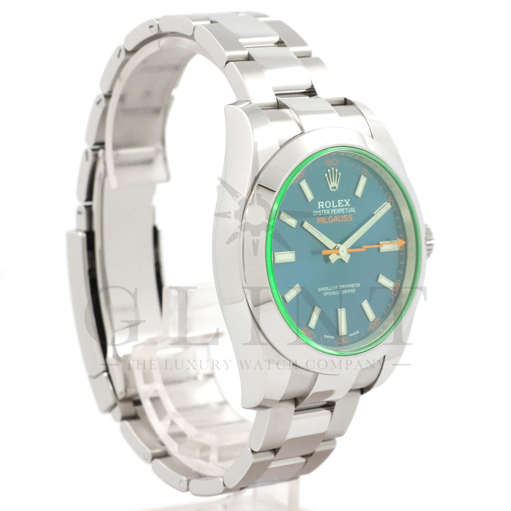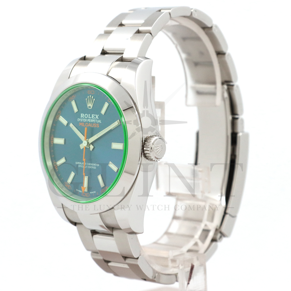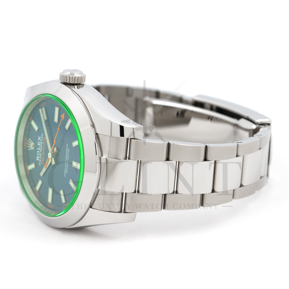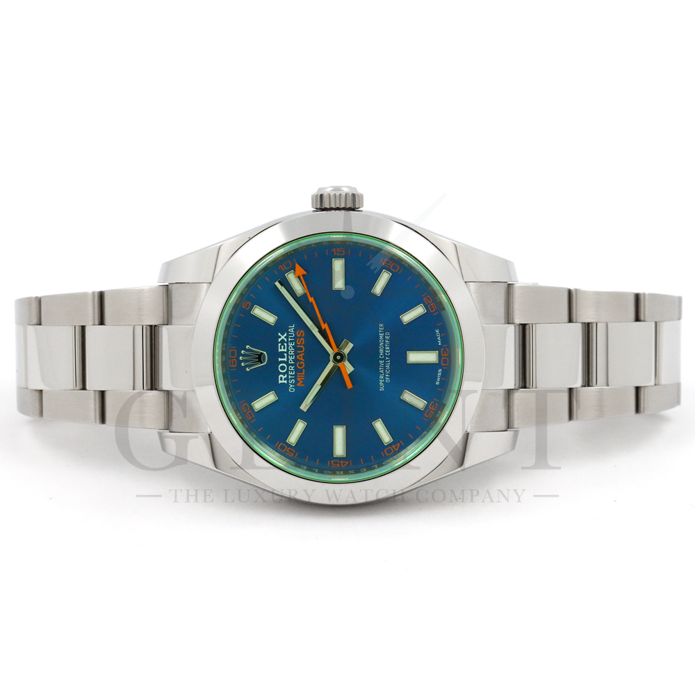 こちらはロレックス ミルガウスです。初代モデルを彷彿とさせるイナズマ針(秒針)と2代目のシンプルなフォルムを継承し、2007年に復活を遂げた耐磁時計ミルガウス。磁気を遮断するための軟鉄製インナーケースが内蔵されており、裏蓋の外周部分には「ROLEX」、「MILGAUSS」、そして王冠マークが刻印され、機能やデザインをはじめ、総合的に特殊な仕様のミルガウスは他のモデルとの差別化が図られております。また、116400GVの風防となるサファイアクリスタルのみロレックスのコーポレートカラーであるグリーンを使用しており、唯一無二の特別感を感じさせてくれるでしょう。2014年より新たに加わったZブルーダイヤルは美しい色合いでグリーンカラーのサファイアクリスタルガラスとのコントラストは絶妙です。随所にロレックスのこだわりが感じられるモデルと言えるでしょう。
