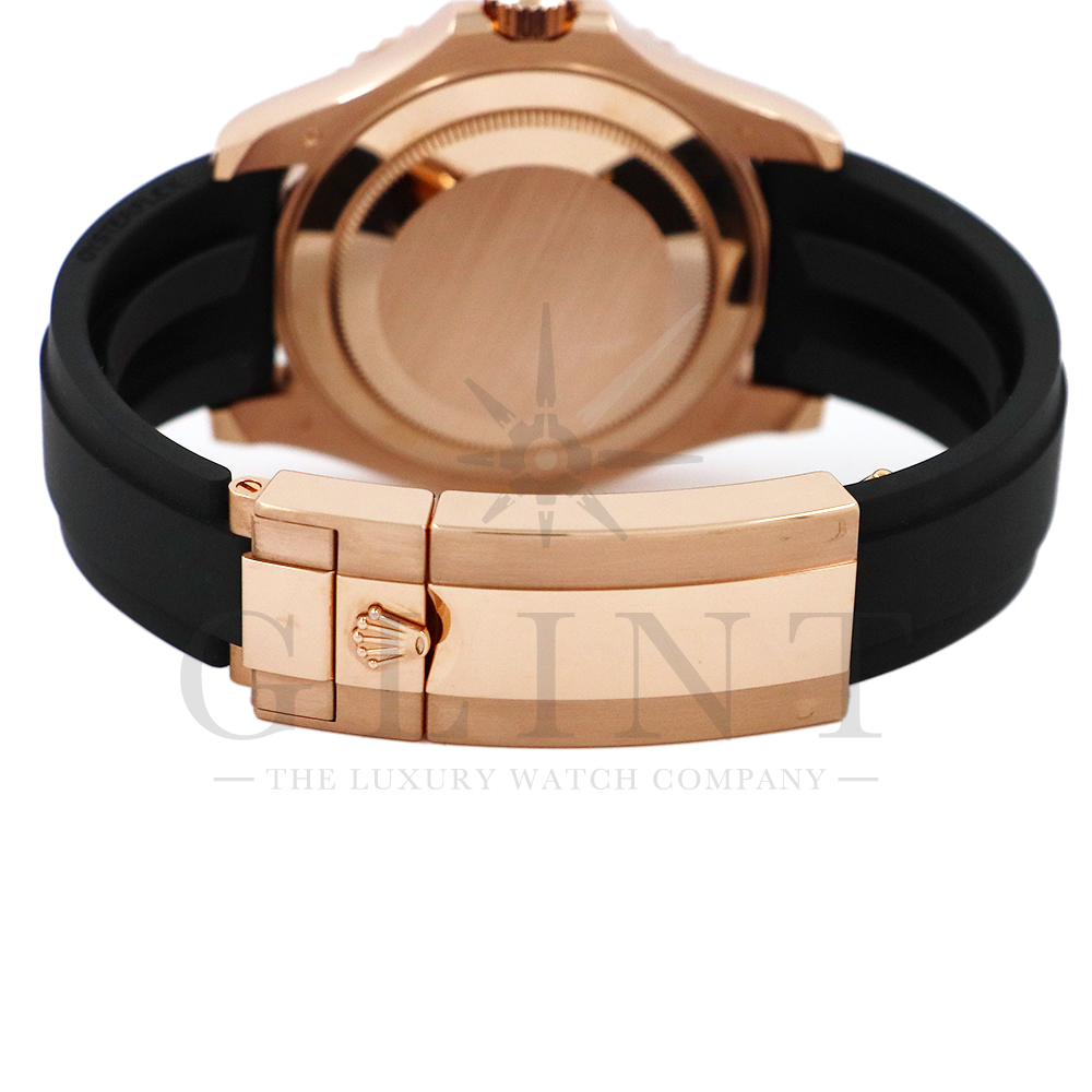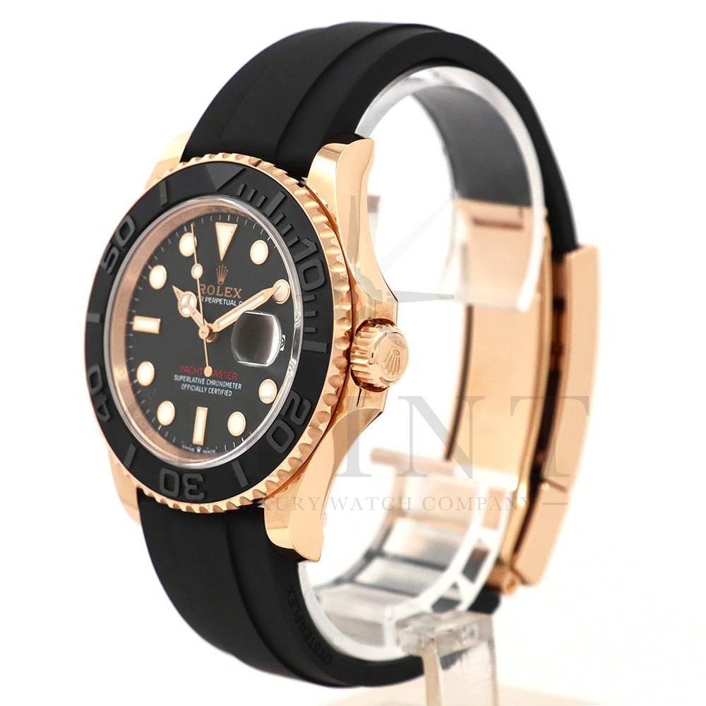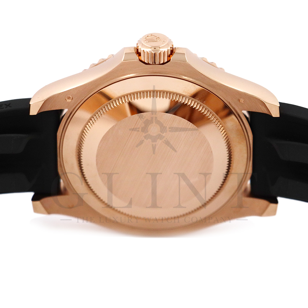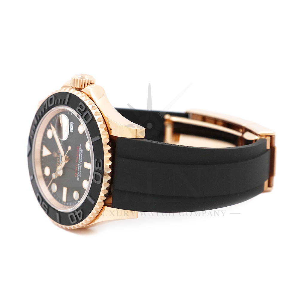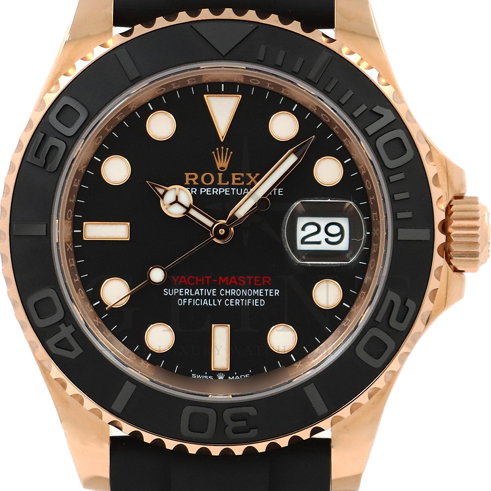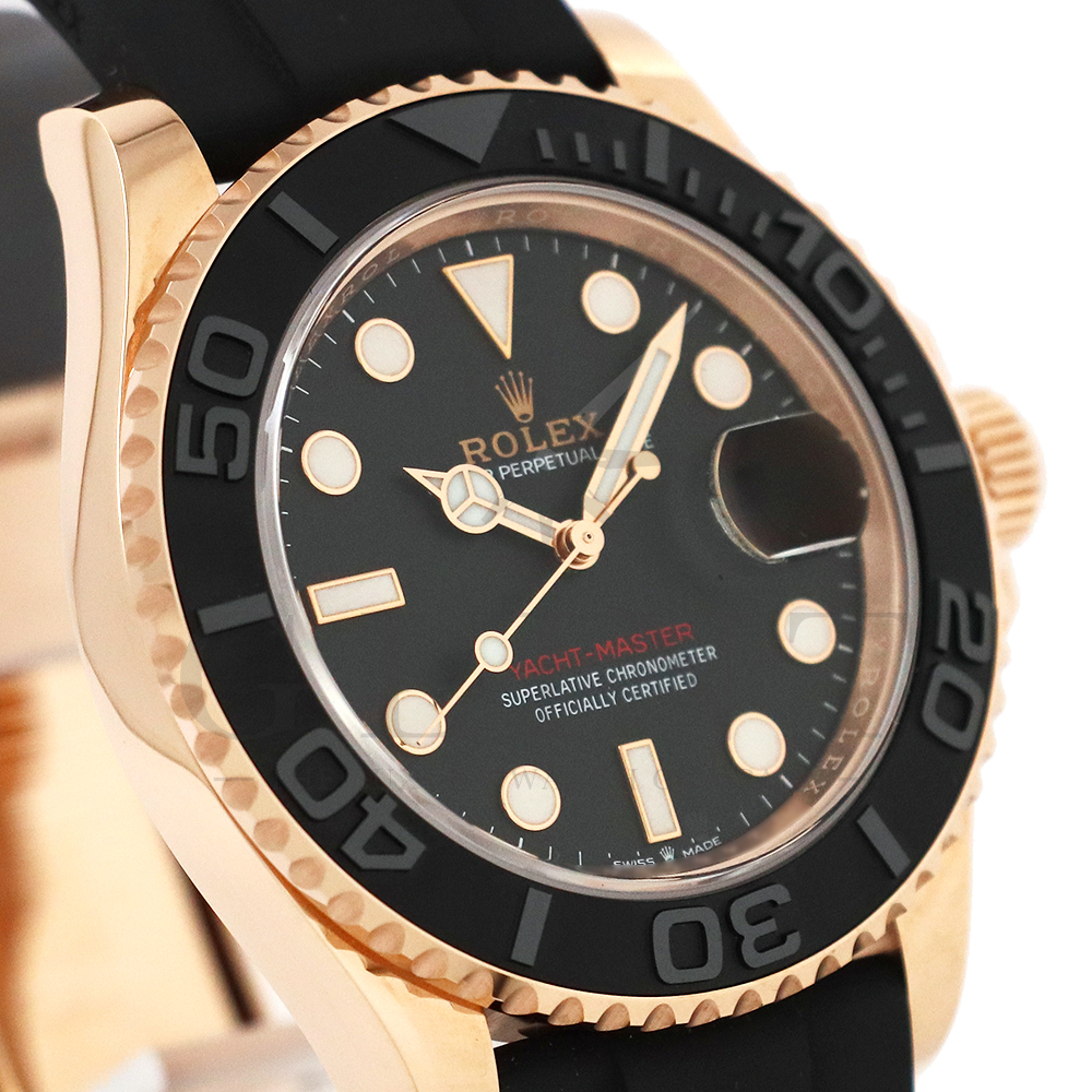 こちらはヨットマスター40 126655です。2019年に発表されたエバーローズゴールドモデルのヨットマスター。以前のモデルからは6時位置に王冠マークが足され、キャリバーがCal.3135からCal.3235に変更。また、バックルにはサブマリーナーなどで採用されているグライドロックシステムが搭載され、ブレスレットの調整が容易になりました。ブレスレットにはオイスターフレックスを採用し、軟性のあるチタン・ニッケル合金製ブレードを、しなやかで装着感に優れるエラストマー(人工ラバー)で覆っており、極めて高い耐久性と装着感を実現しております。従来のヨットマスターとは一線を画した高級感を味わえる一本です。