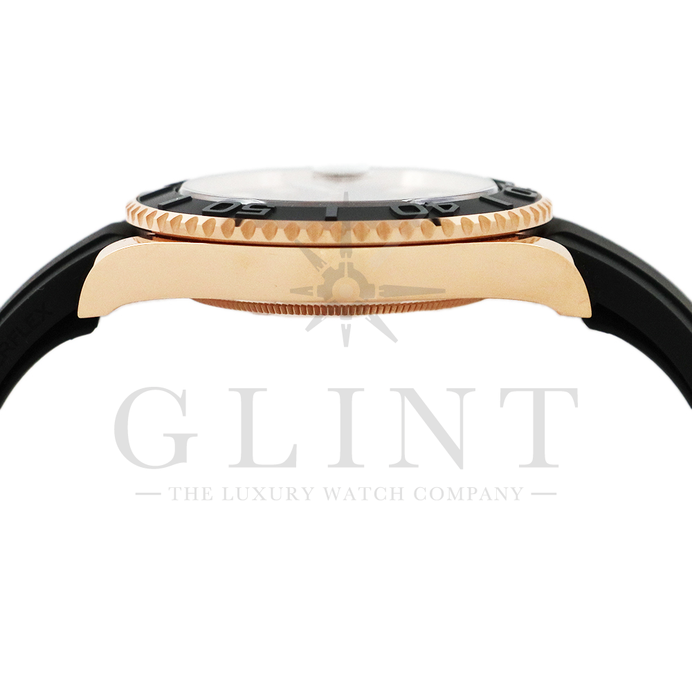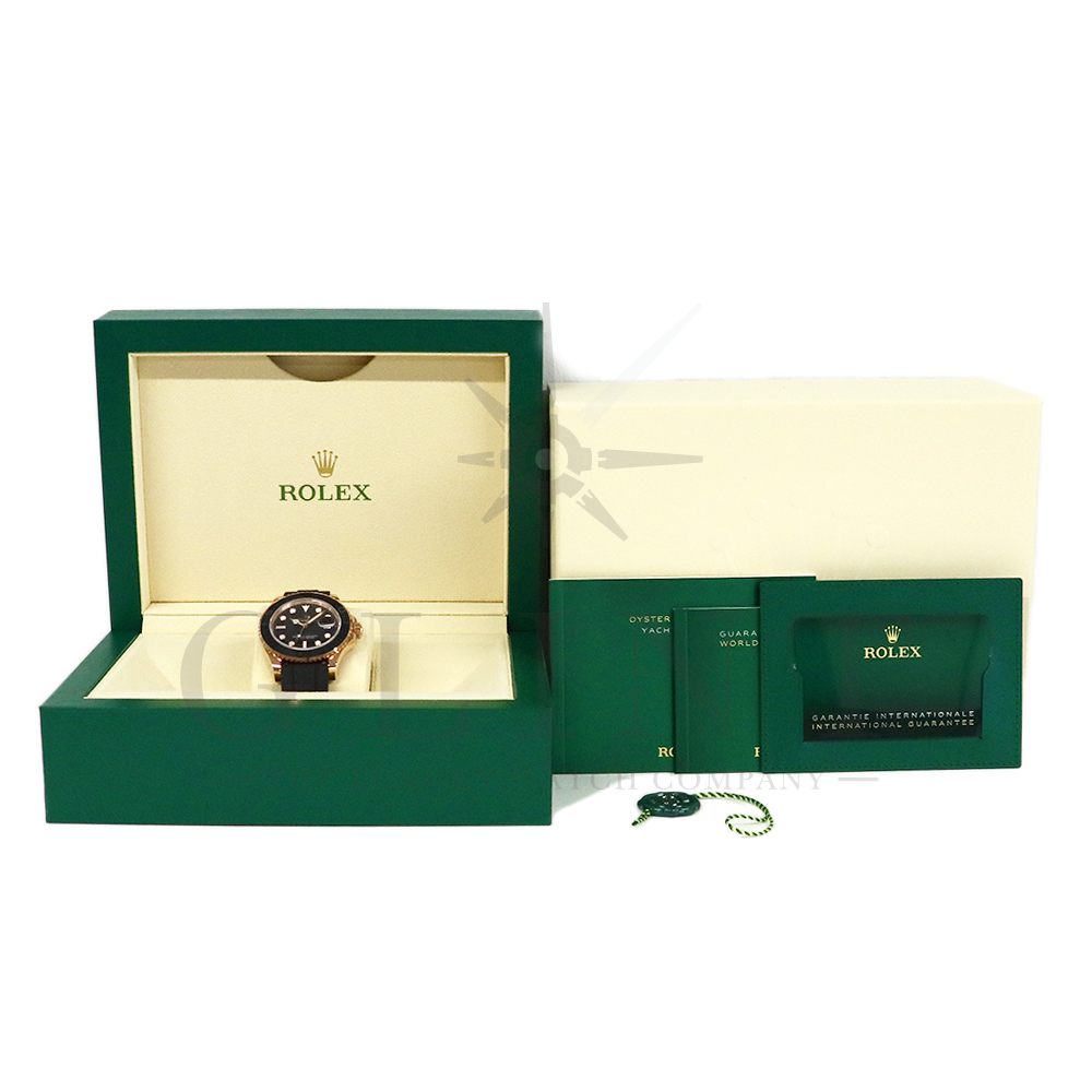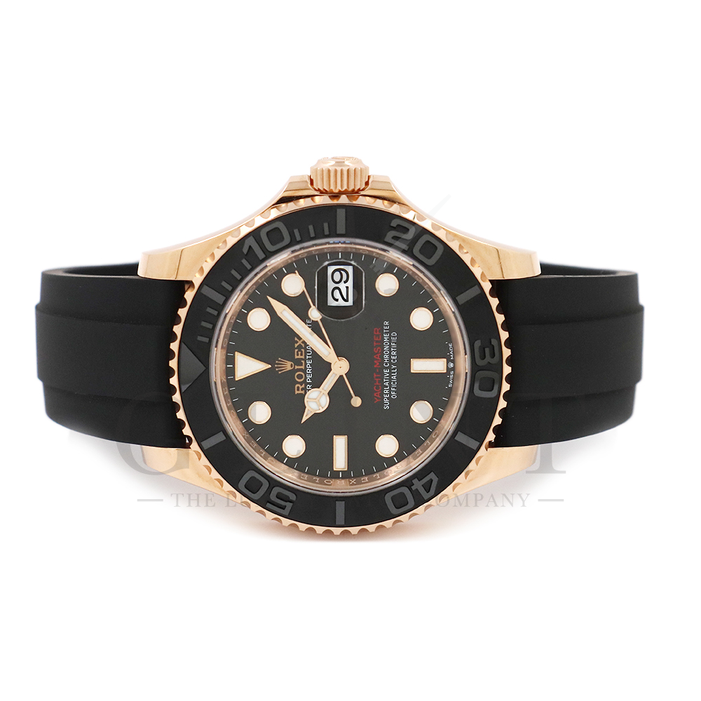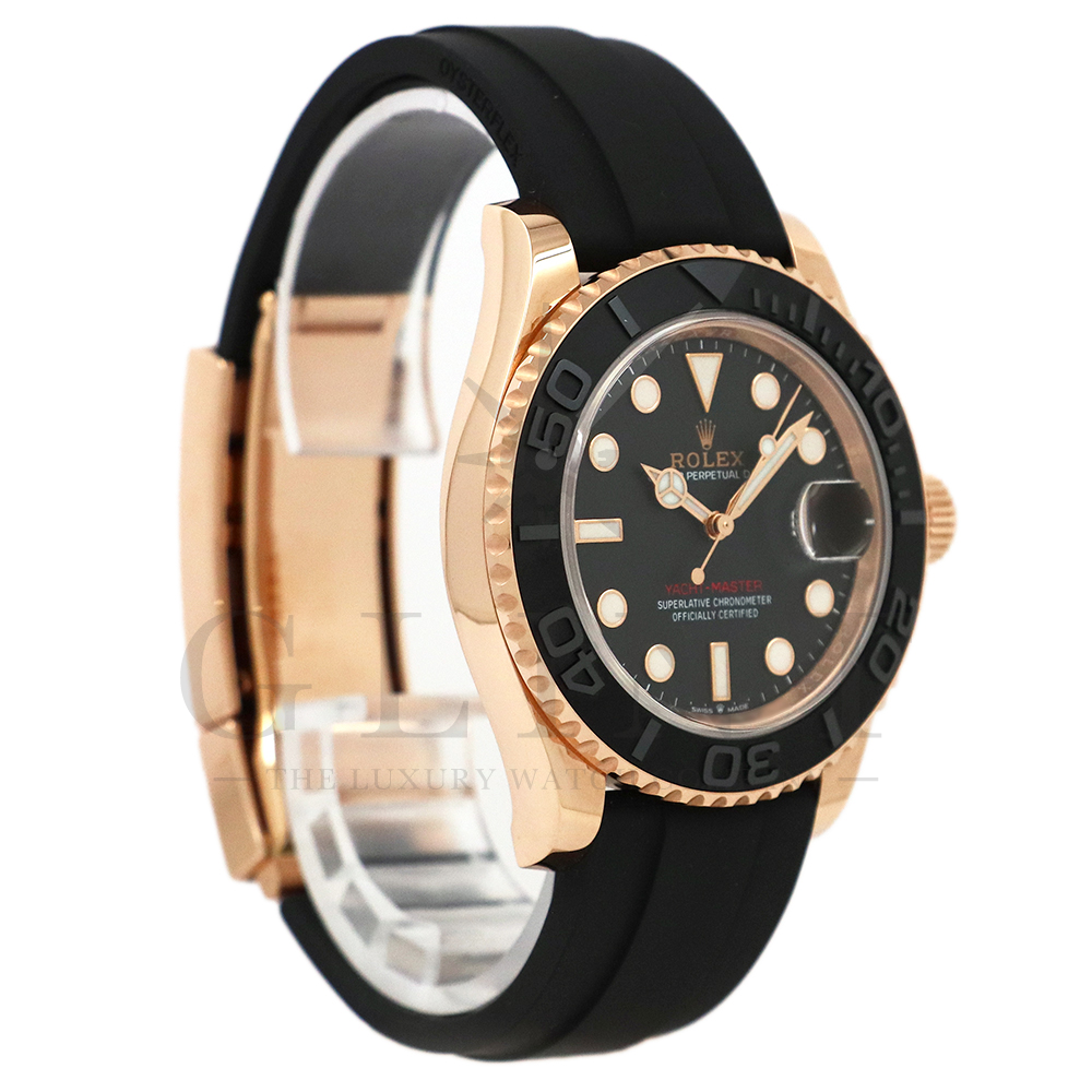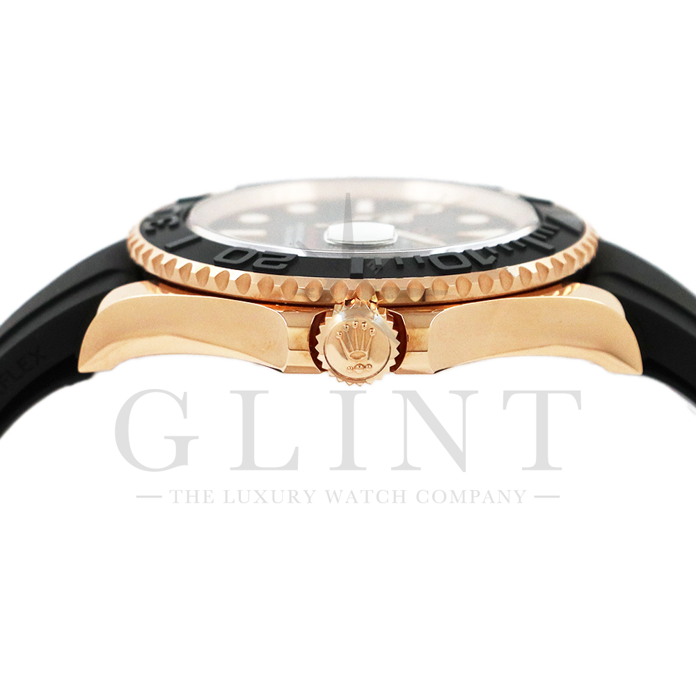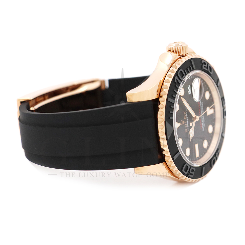 こちらはヨットマスター40 126655です。2019年に発表されたエバーローズゴールドモデルのヨットマスター。以前のモデルからは6時位置に王冠マークが足され、キャリバーがCal.3135からCal.3235に変更。また、バックルにはサブマリーナーなどで採用されているグライドロックシステムが搭載され、ブレスレットの調整が容易になりました。ブレスレットにはオイスターフレックスを採用し、軟性のあるチタン・ニッケル合金製ブレードを、しなやかで装着感に優れるエラストマー(人工ラバー)で覆っており、極めて高い耐久性と装着感を実現しております。従来のヨットマスターとは一線を画した高級感を味わえる一本です。