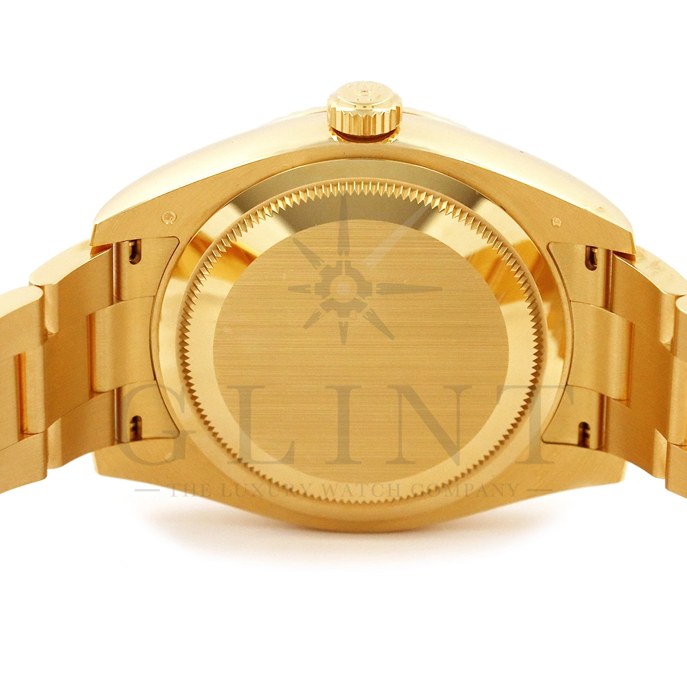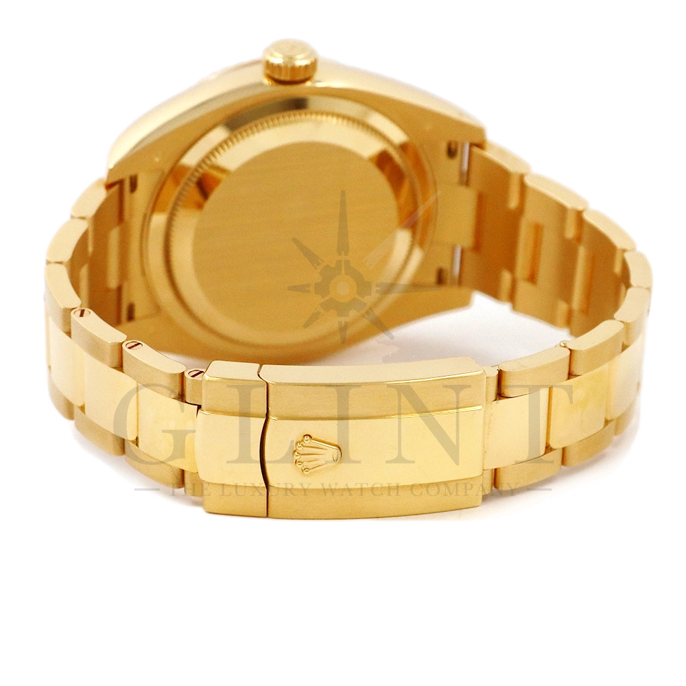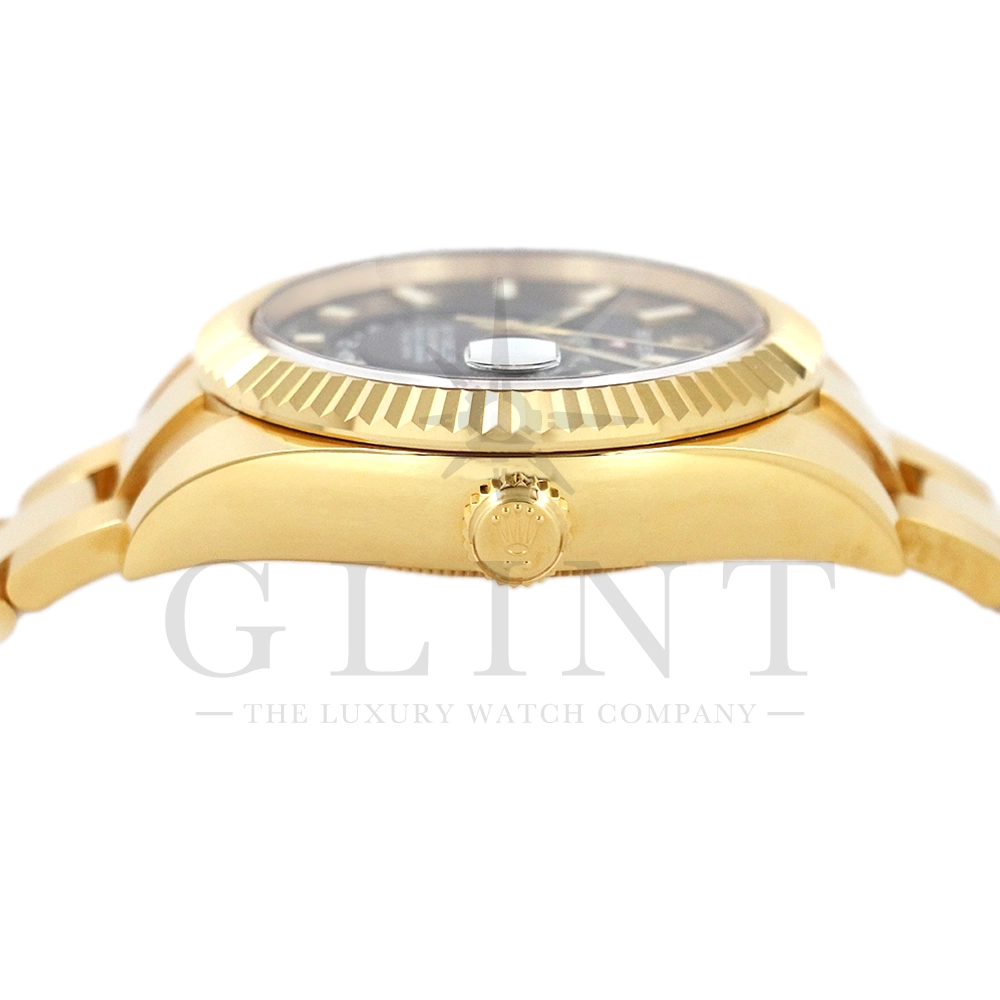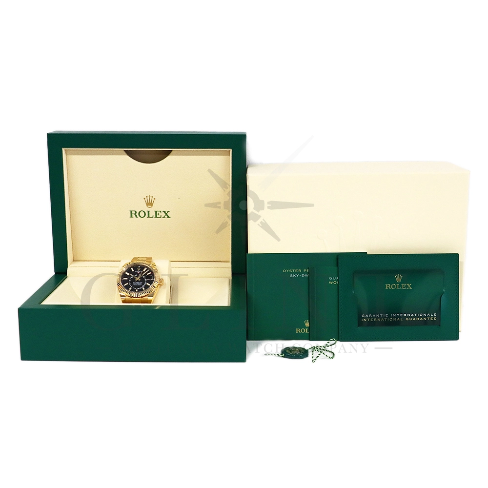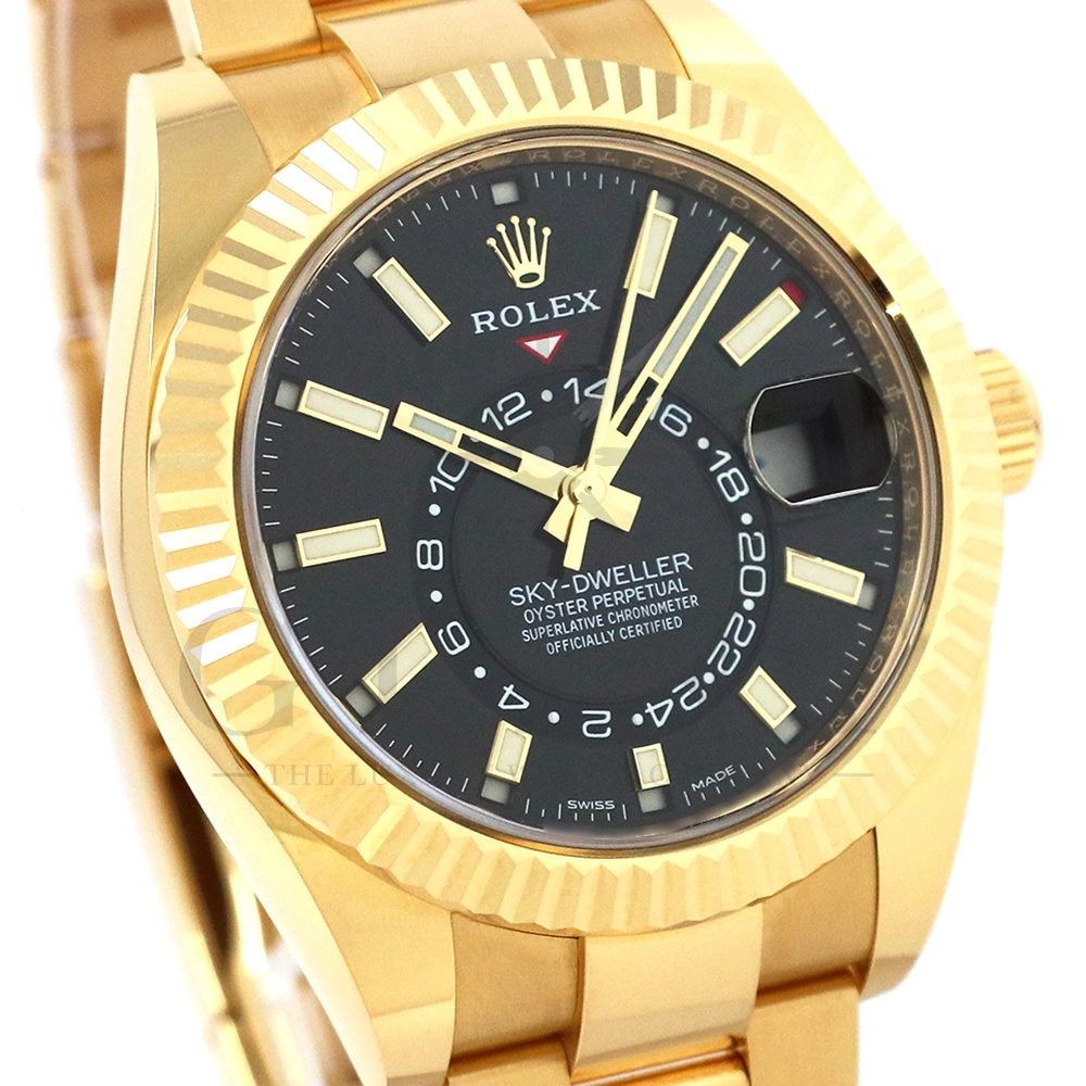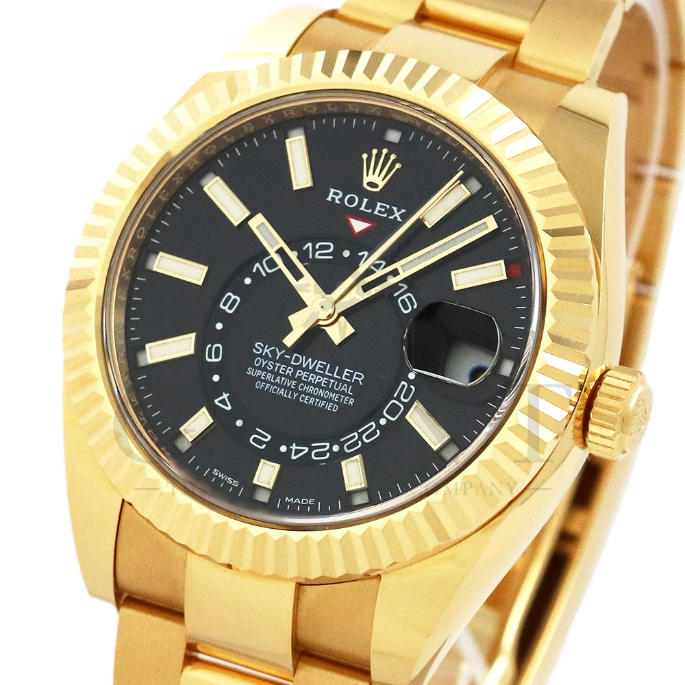 こちらはロレックス スカイドゥエラー 326938です。素材に18Kイエローゴールドを採用したゴージャスな雰囲気を与えてくれるモデル。ブラックカラーの文字盤で精悍な印象で、ホワイトでカラーリングされた24時間ディスクと逆三角形のレッドマーカーが視認性を高めてくれます。ムーブメントにはROLEXが完全自社開発し、ROLEX初のセミコンプリケーションキャリバーとなるCal.9001を搭載しており、3月1日のみに手動調整するだけで1年間実用可能なアニュアルカレンダーとデュアルタイム表示を搭載。高級感と実用性を見事に融合させたロレックス史上最高の複雑機構を搭載した一本です。
