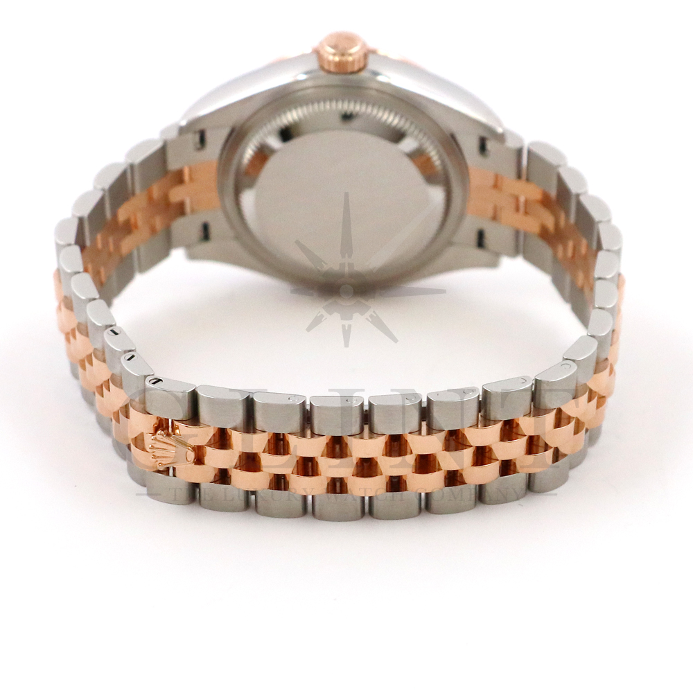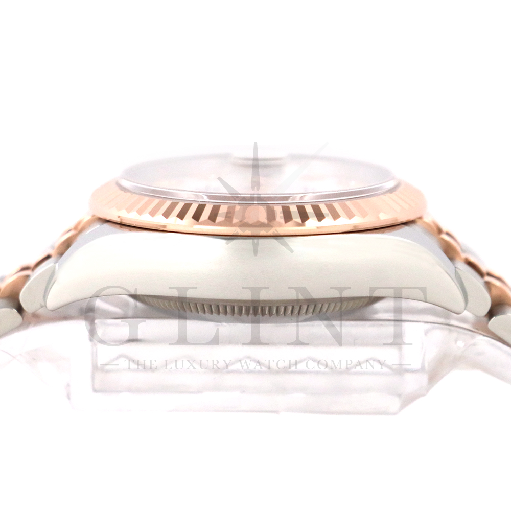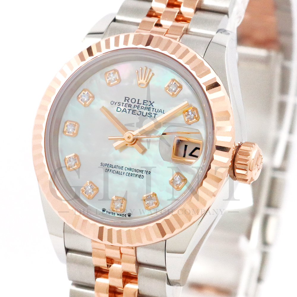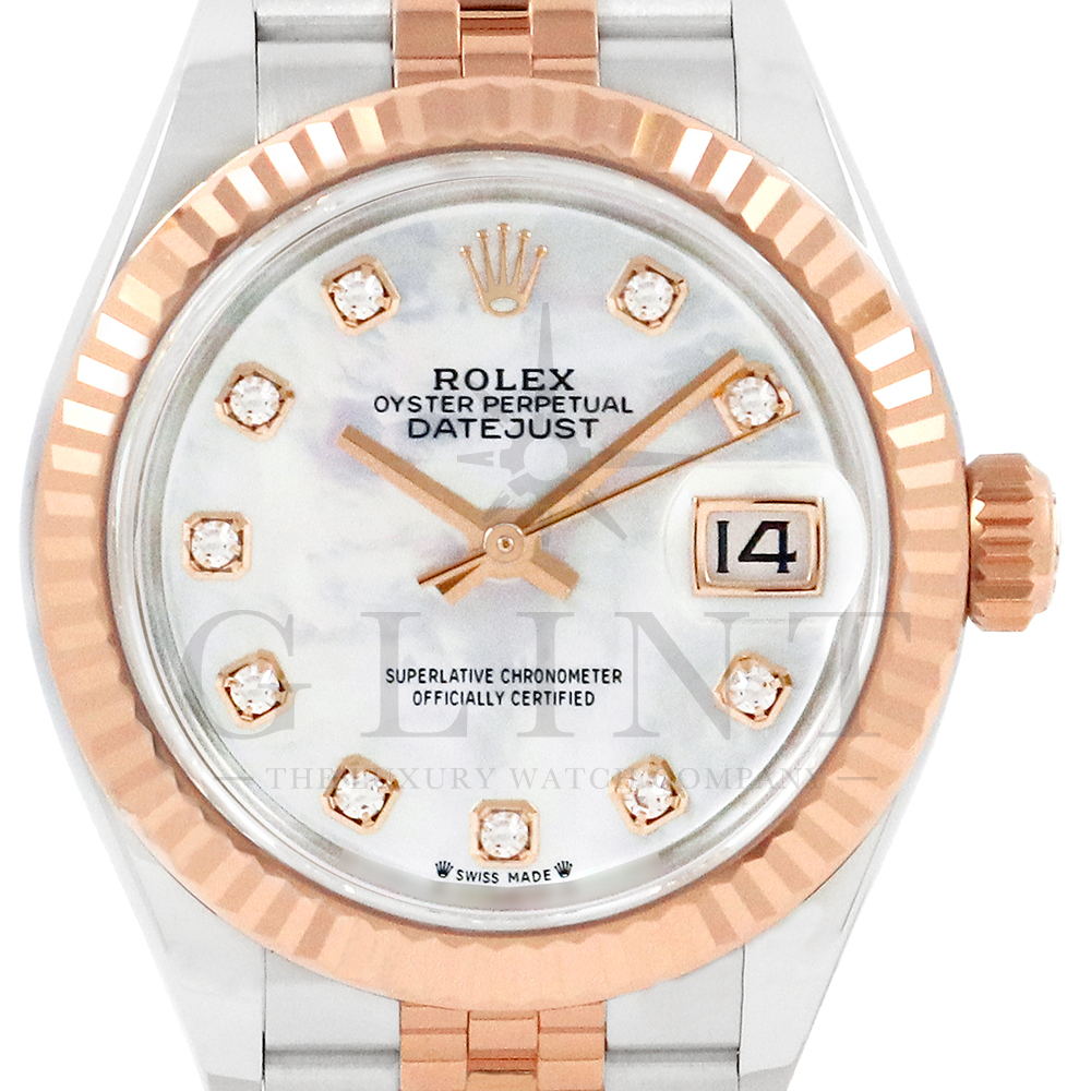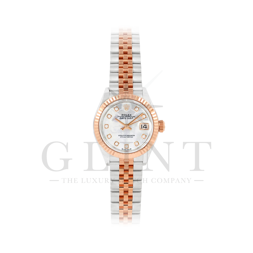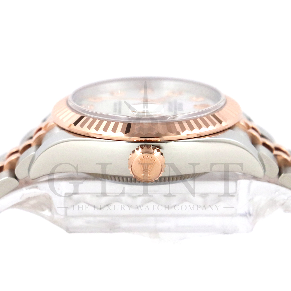 こちらはロレックス オイスターパーペチュアル レディ デイトジャストです。素材にはステンレスとエバーローズゴールドを使用。光が照らす角度によって様々な表情に変化し、幻想的な輝きを放つホワイトシェル文字盤には10Pのダイヤモンドがセッティングされており、より上品な雰囲気を演出してくれるでしょう。搭載されているキャリバー 2236は、ロレックスが再定義した高レベルなクロノメーター性能を提供し、従来のヘアスプリングの約10倍もの耐衝撃性が実現されました。5連のジュビリーブレスにはバックルが見えないコンシールドクラスプを採用しており、それによってブレスレットの一体感が強調され、ジュエリーテイストが色濃く反映されております。女性の目線で考え抜かれた非常に豪華なタイムピースをご堪能ください。