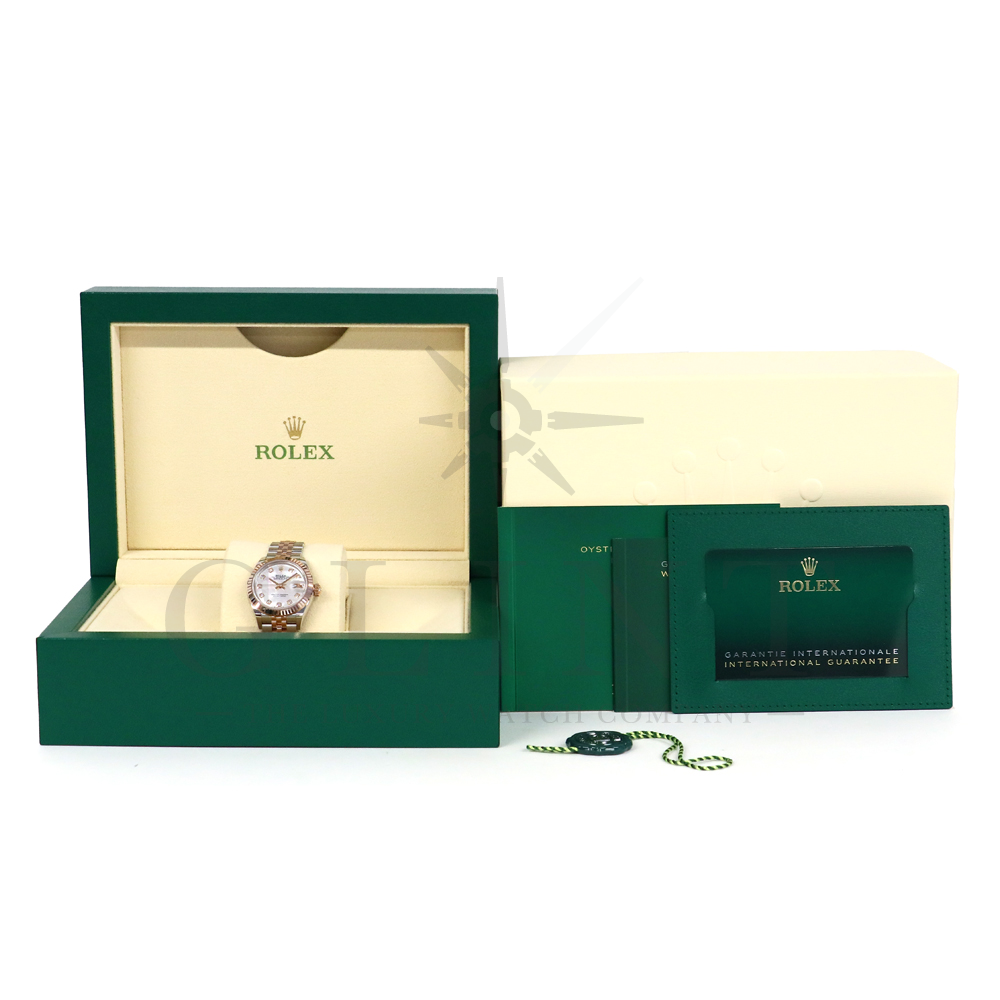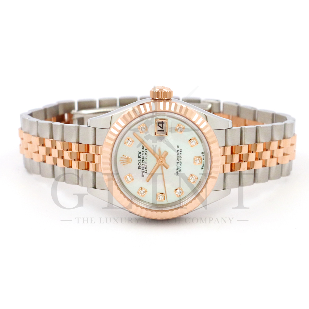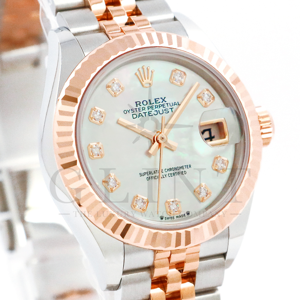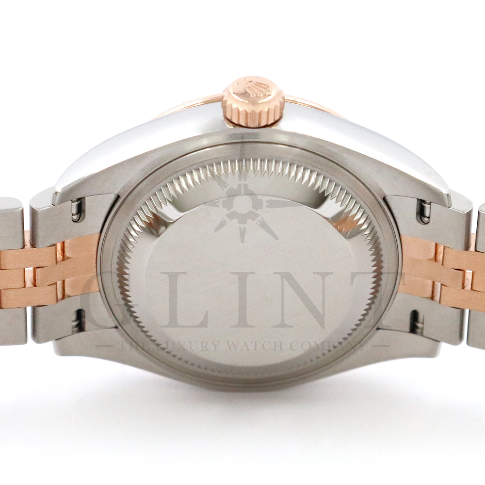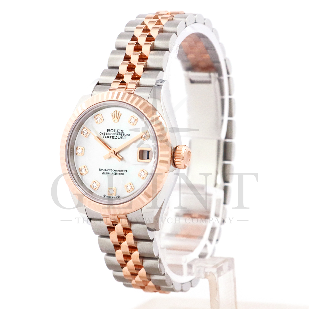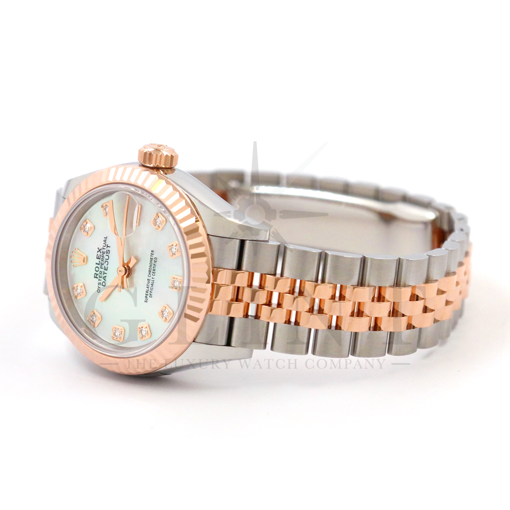 こちらはロレックス オイスターパーペチュアル レディ デイトジャストです。素材にはステンレスとエバーローズゴールドを使用。光が照らす角度によって様々な表情に変化し、幻想的な輝きを放つホワイトシェル文字盤には10Pのダイヤモンドがセッティングされており、より上品な雰囲気を演出してくれるでしょう。搭載されているキャリバー 2236は、ロレックスが再定義した高レベルなクロノメーター性能を提供し、従来のヘアスプリングの約10倍もの耐衝撃性が実現されました。5連のジュビリーブレスにはバックルが見えないコンシールドクラスプを採用しており、それによってブレスレットの一体感が強調され、ジュエリーテイストが色濃く反映されております。女性の目線で考え抜かれた非常に豪華なタイムピースをご堪能ください。
