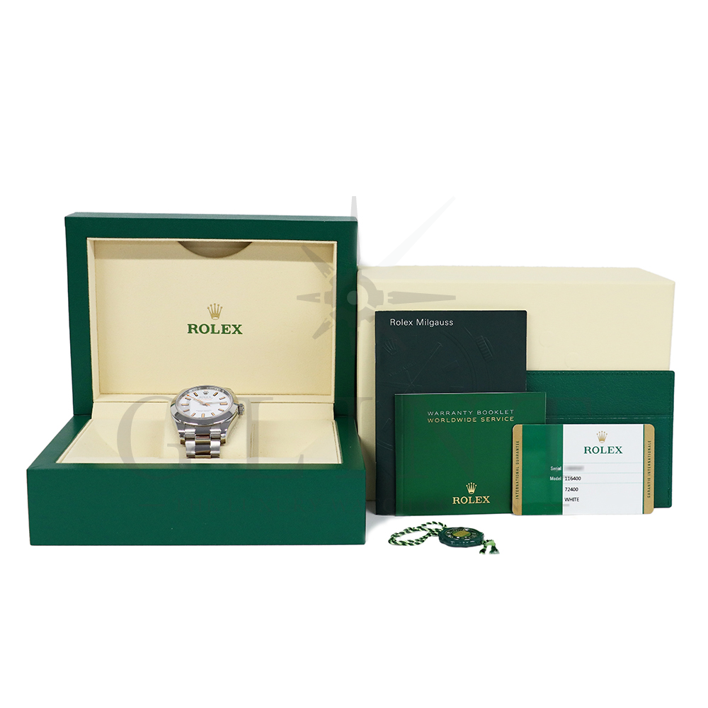 こちらはロレックス ミルガウスです。初代モデルを彷彿とさせるイナズマ針(秒針)と2代目のシンプルなフォルムを継承し、2007年に復活を遂げた耐磁時計ミルガウス。磁気を遮断するための軟鉄製インナーケースが内蔵されており、裏蓋の外周部分には「ROLEX」、「MILGAUSS」、そして王冠マークが刻印され、機能やデザインをはじめ、総合的に特殊な仕様のミルガウスは他のモデルとの差別化が図られております。ホワイト文字盤にオレンジカラーの秒針とインデックスが美しく映え、絶妙な雰囲気を演出してくれるでしょう。