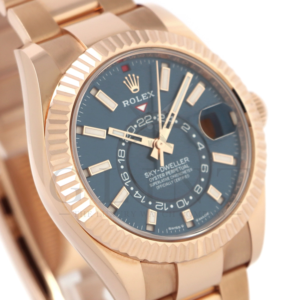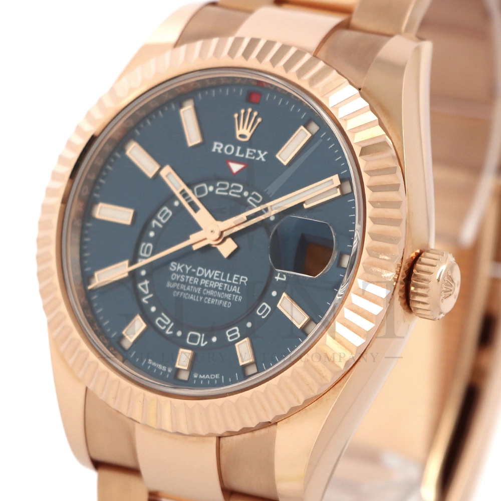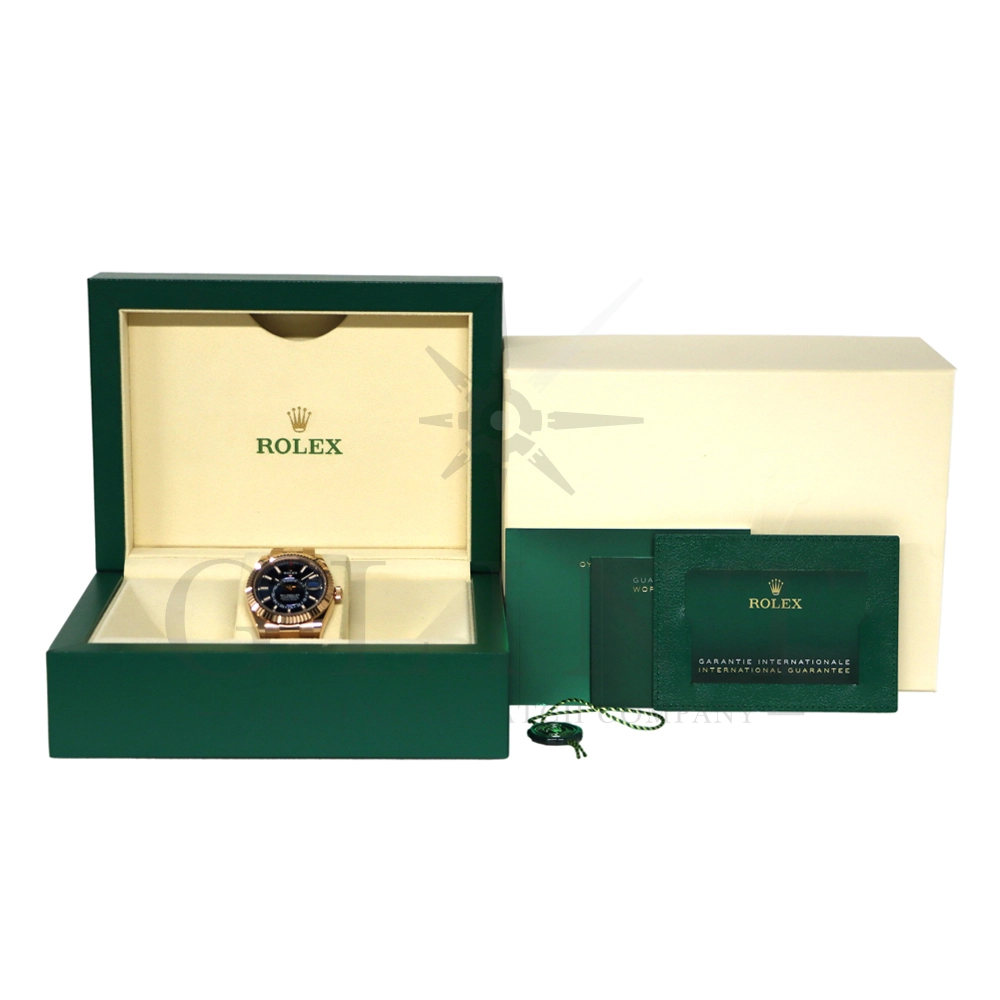 こちらは2023年の新作として発表されたロレックス スカイドゥエラー 336935です。素材に18Kエバーローズゴールドを採用したエレガントな雰囲気を与えてくれるモデル。色鮮やかなブルーグリーン文字盤が印象的でこれまでにない高級感を堪能する事ができるでしょう。ムーブメントには、ROLEX初のセミコンプリケーションキャリバーCal.9001を進化させたCal.9002を搭載。クロナジーエスケープメントが採用されたほか、常磁性ブルー パラクロム・ヒゲゼンマイも実装されるなど、ロレックスがムーブメントにもたらした主要な革新技術を含んでいます。素材による高級感と実用性を見事に融合させたロレックス史上最高の複雑機構を搭載した一本です。