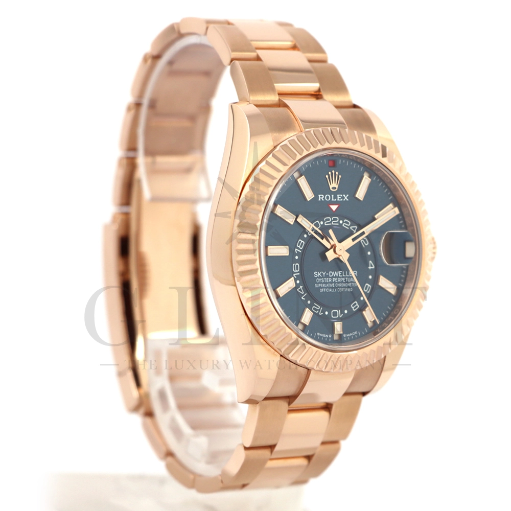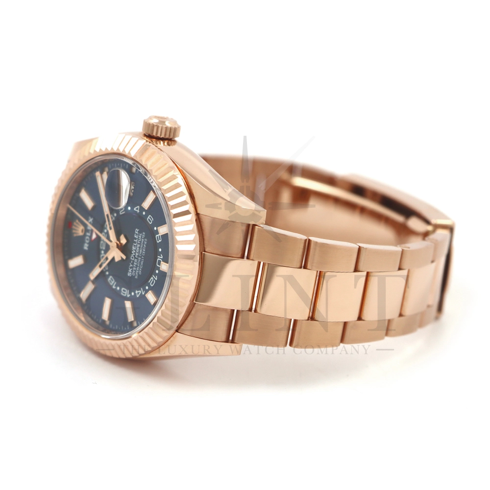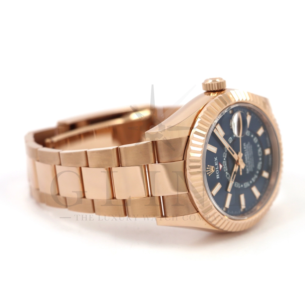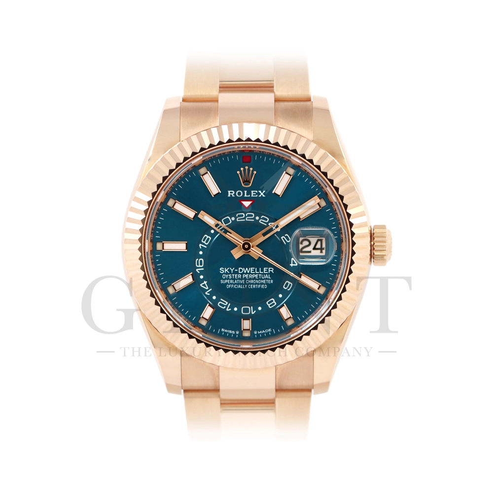 こちらは2023年の新作として発表されたロレックス スカイドゥエラー 336935です。素材に18Kエバーローズゴールドを採用したエレガントな雰囲気を与えてくれるモデル。色鮮やかなブルーグリーン文字盤が印象的でこれまでにない高級感を堪能する事ができるでしょう。ムーブメントには、ROLEX初のセミコンプリケーションキャリバーCal.9001を進化させたCal.9002を搭載。クロナジーエスケープメントが採用されたほか、常磁性ブルー パラクロム・ヒゲゼンマイも実装されるなど、ロレックスがムーブメントにもたらした主要な革新技術を含んでいます。素材による高級感と実用性を見事に融合させたロレックス史上最高の複雑機構を搭載した一本です。