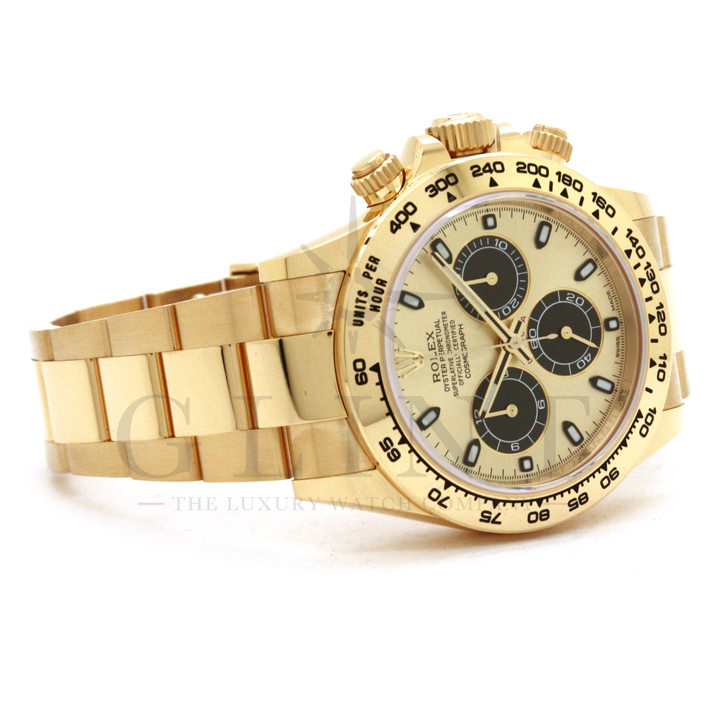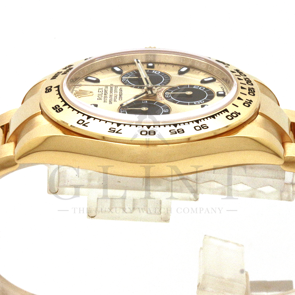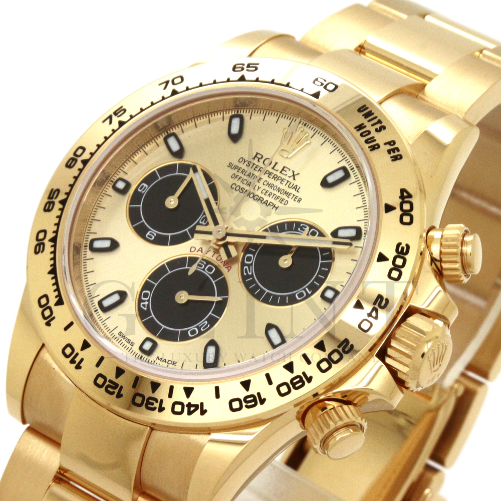 こちらはロレックス デイトナです。18Kイエローゴールドを素材に2016年に116528からマイナーチェンジした116508。タキメーターベゼルの表記が一新され、視認性が向上いたしました。文字盤には色鮮やかなシャンパンカラーにインダイヤルにはブラックを配色。イエローゴールドと見事にマッチしており、独特の高級感を味わえる雰囲気となっております。華やかなデイトナで独自の魅力を演出してみてはいかがでしょうか。