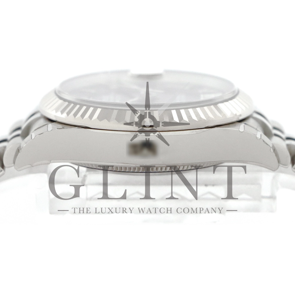 こちらはロレックス デイトジャスト31です。妖艶な雰囲気を放つサンレイ仕上げのオーベルジーヌダイアルには大型のVIに11個のダイヤモンドがセッティングされており、上品な印象を与えてくれるでしょう。ムーブメントにはロレックスによる完全自社製造キャリバー2236を搭載し、パワーリザーブが55時間まで延長され、何時でも日付調整を可能とする事で実用性も上がりました。ブレスレットはジュビリーブレスレットを採用しており、エレガントな雰囲気を与えてくれるでしょう。ジュビリーブレスレットにはコンシールドクラスプが採用され、あたかもバックルが無いようなスマートなシルエットになり、ジュエリー感覚としてもお楽しみになれる一本です。