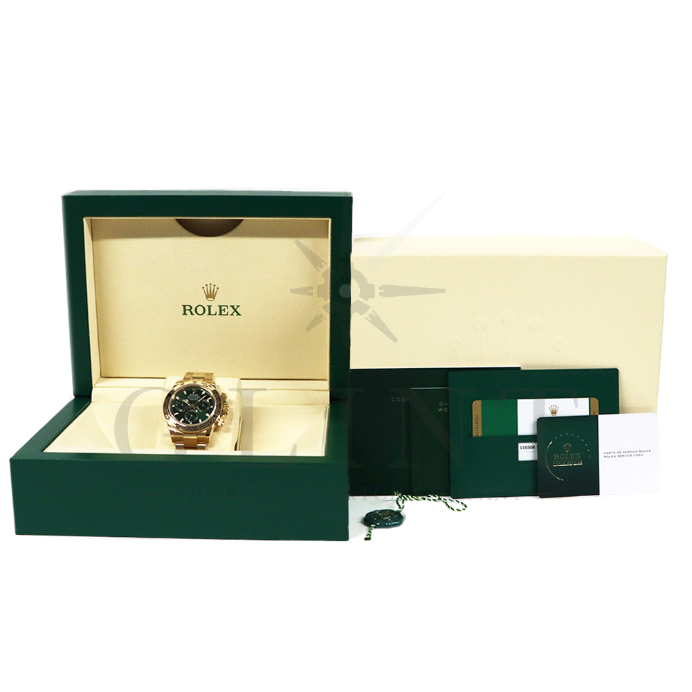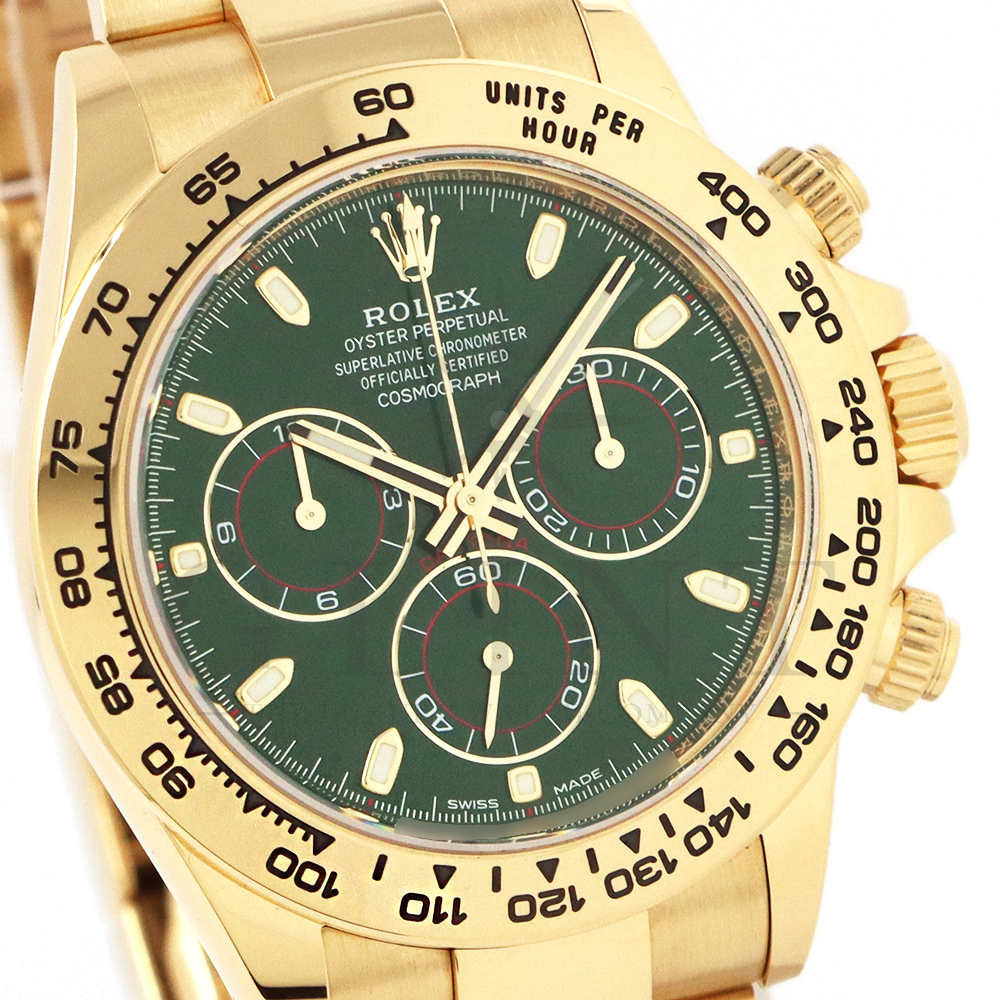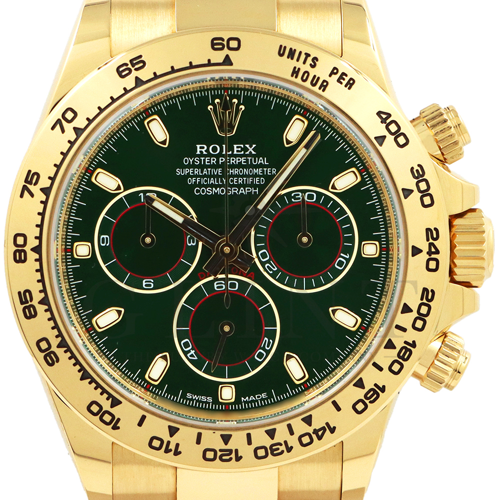 こちらはロレックス デイトナです。18Kイエローゴールドを素材に2016年に116528からマイナーチェンジした116508。タキメーターベゼルの表記が一新され、視認性が向上いたしました。文字盤にはサンレイ仕上げの色鮮やかなグリーンカラー。ロレックスのコーポレートカラーを採用した事で絶大な人気を誇っており、独特の高級感を味わえる雰囲気となっております。珍しいダイアルカラーのデイトナで独自の魅力を演出してみてはいかがでしょうか。