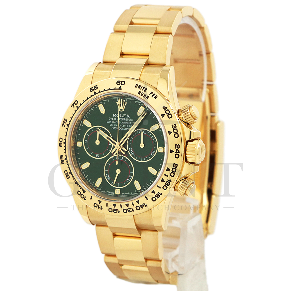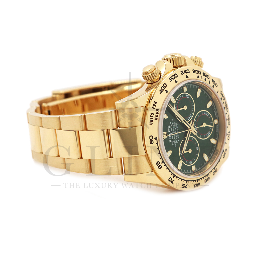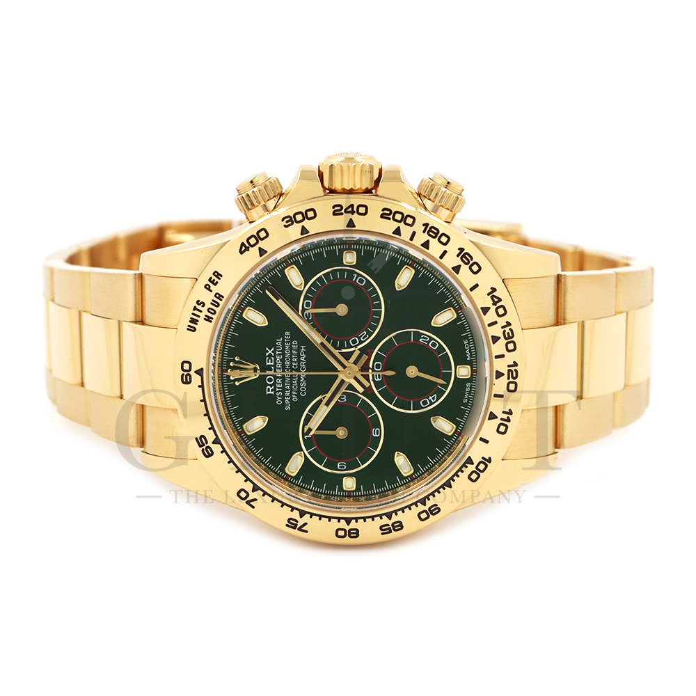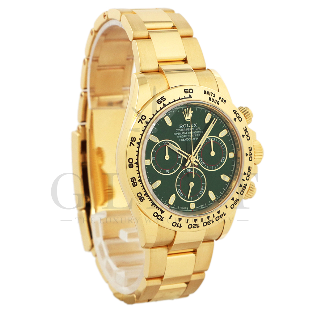 こちらはロレックス デイトナです。18Kイエローゴールドを素材に2016年に116528からマイナーチェンジした116508。タキメーターベゼルの表記が一新され、視認性が向上いたしました。文字盤にはサンレイ仕上げの色鮮やかなグリーンカラー。ロレックスのコーポレートカラーを採用した事で絶大な人気を誇っており、独特の高級感を味わえる雰囲気となっております。珍しいダイアルカラーのデイトナで独自の魅力を演出してみてはいかがでしょうか。