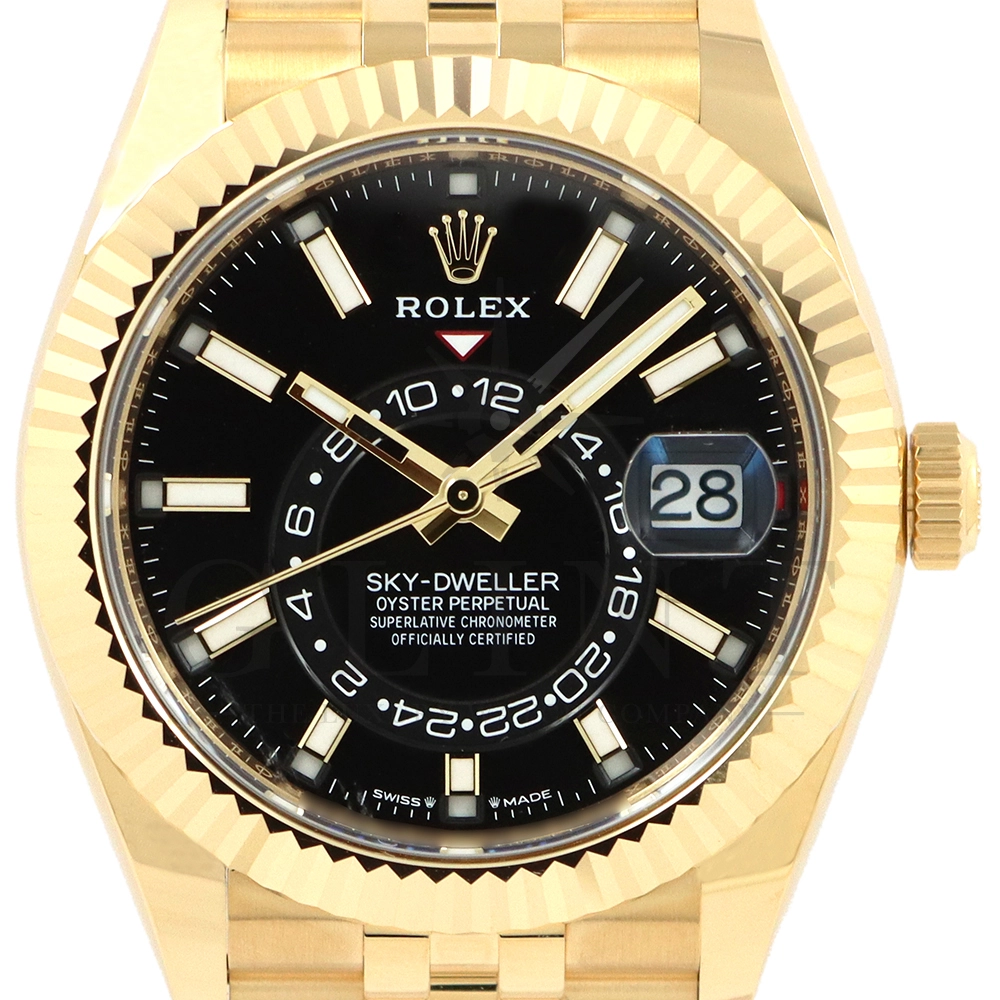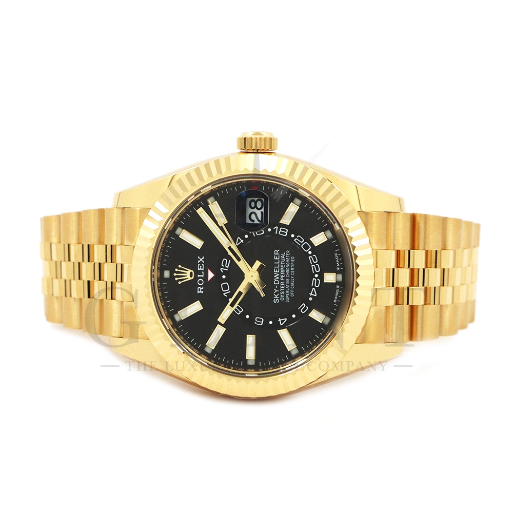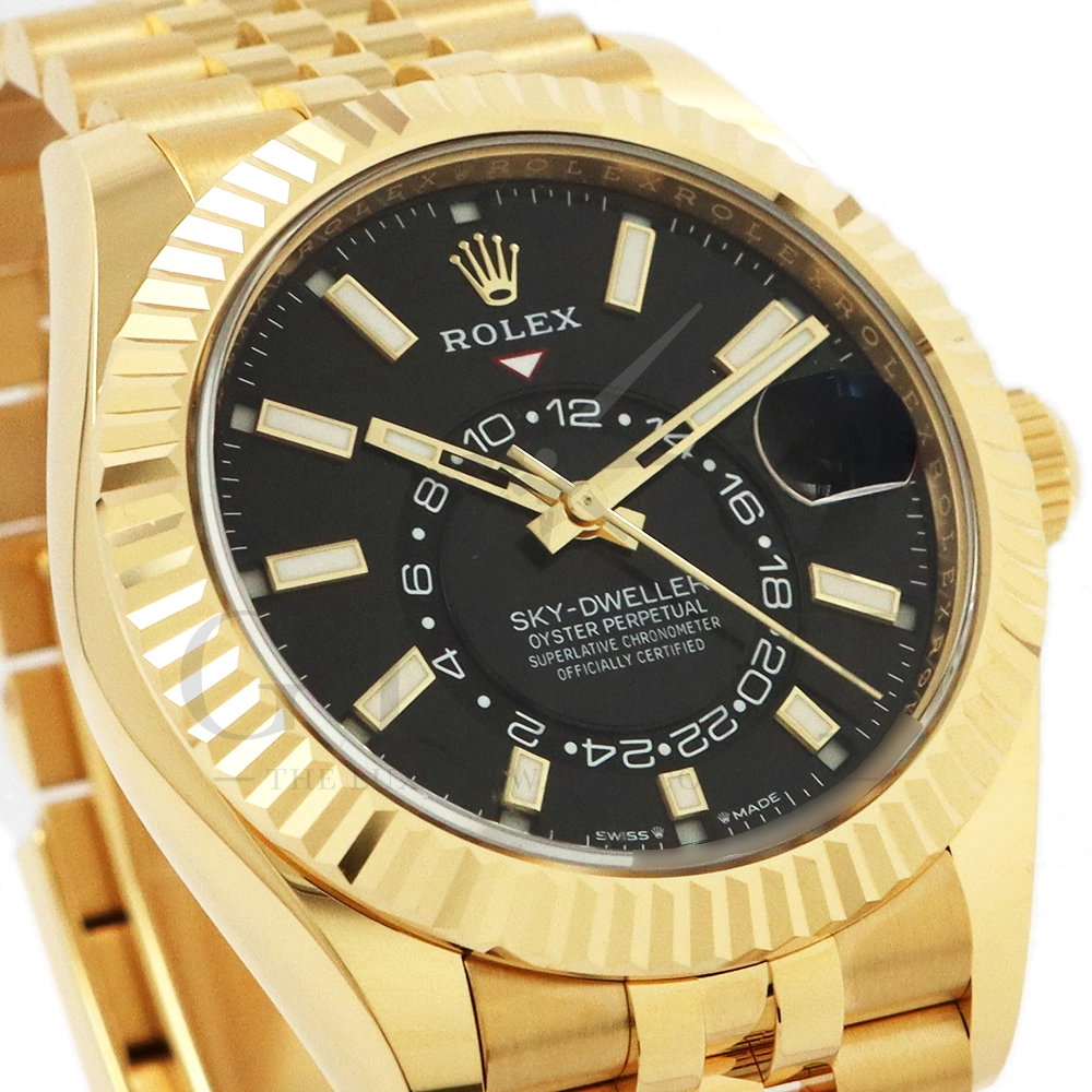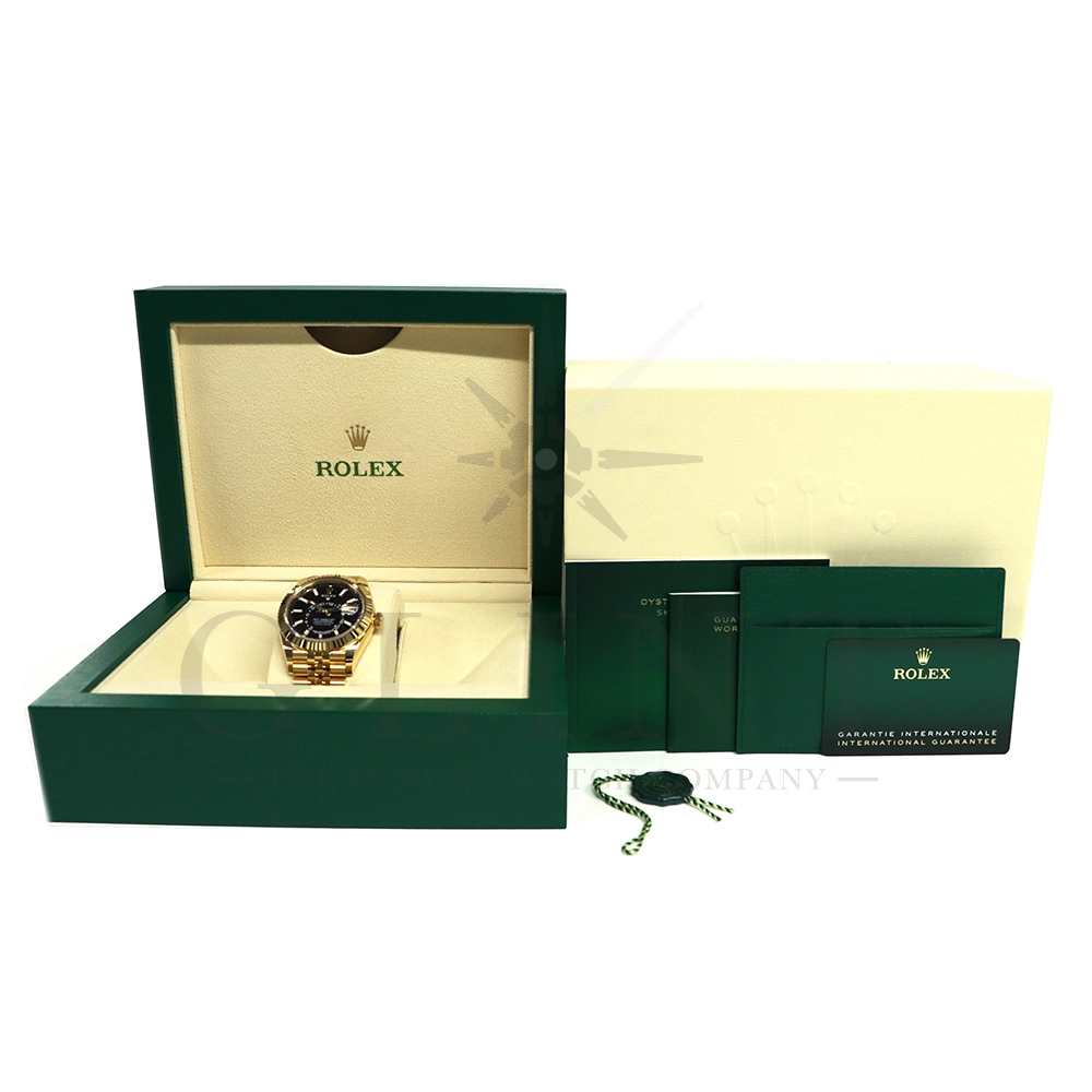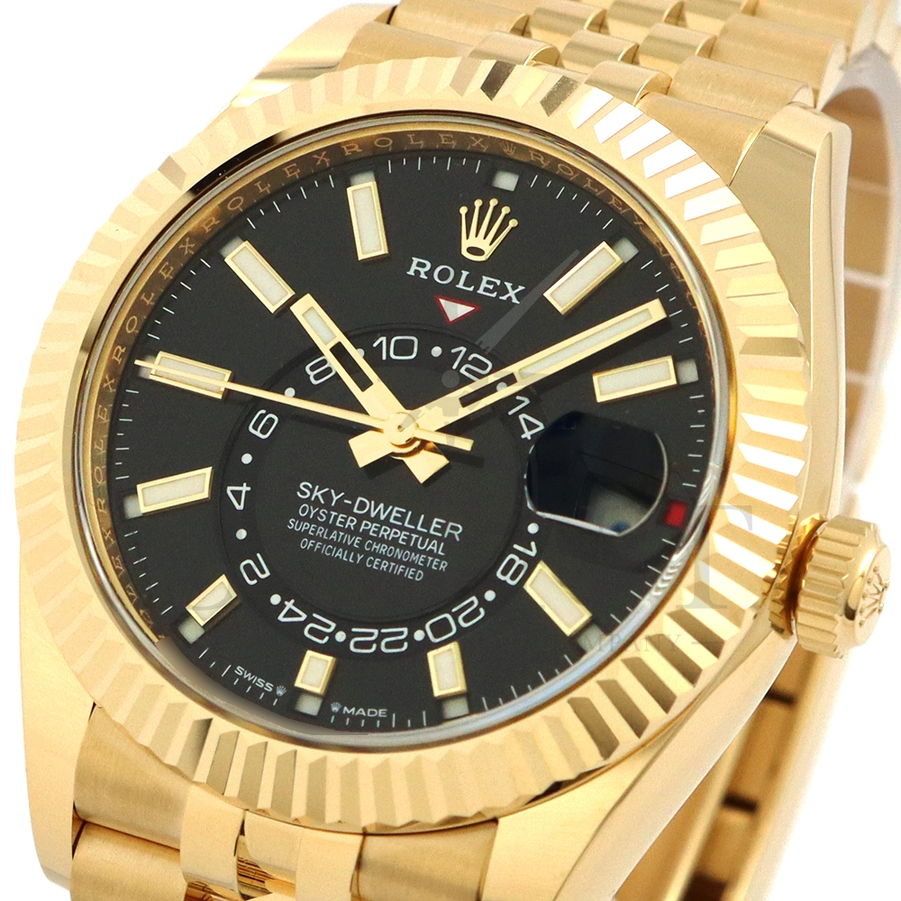 こちらはロレックス スカイドゥエラー 336938です。素材に18Kイエローゴールドを採用したゴージャスな雰囲気を与えてくれるモデル。ブライトブラックの文字盤で精悍な印象ながらも、これまでになかったホワイトのバーインデックスが備えられたことによって、昼夜での高い視認性を確保しております。ムーブメントには、ROLEX初のセミコンプリケーションキャリバーCal.9001を進化させたCal.9002を搭載。クロナジーエスケープメントが採用されたほか、常磁性ブルー パラクロム・ヒゲゼンマイも実装されるなど、ロレックスがムーブメントにもたらした主要な革新技術を含んでいます。また、ブレスレットにはしなやかで快適な5列リンクのジュビリーブレスレットを採用。フォールディングタイプのオイスタークラスプが装備され、ロレックスが開発したイージーリンク(エクステンションリンク)も備えております。素材による高級感と実用性を見事に融合させたロレックス史上最高の複雑機構を搭載した一本です。