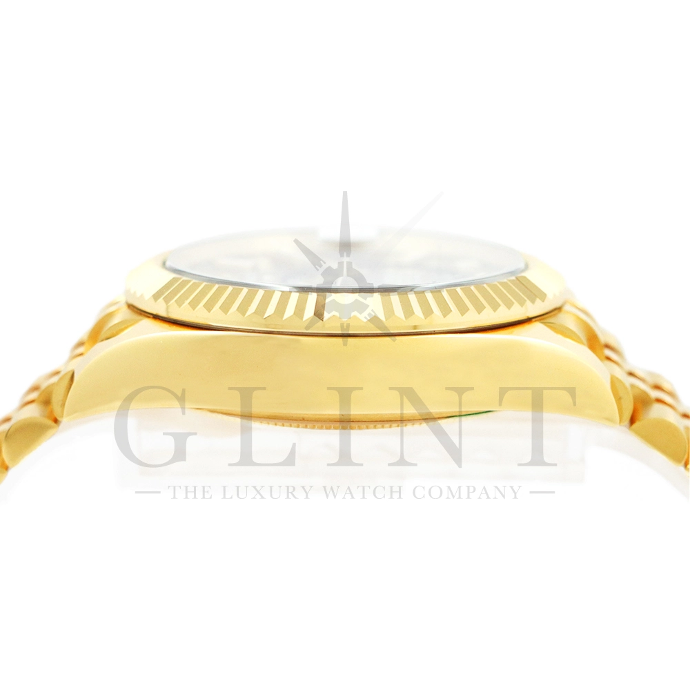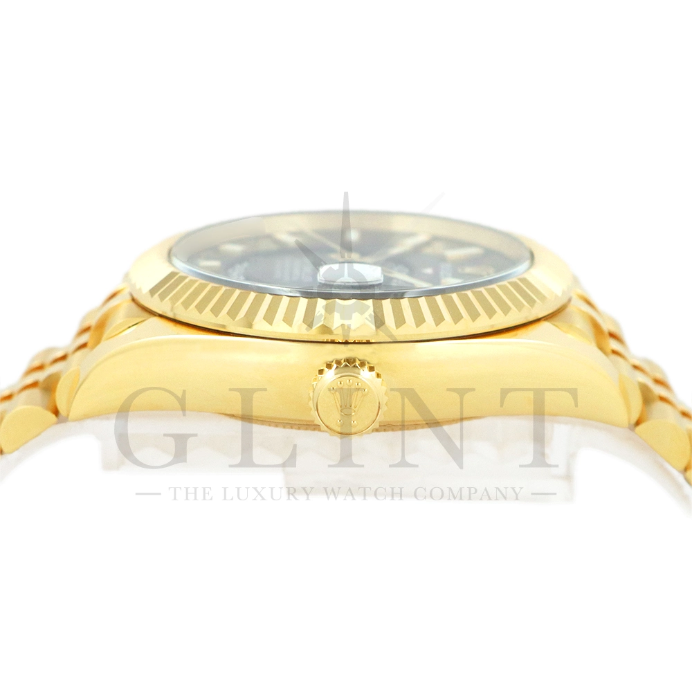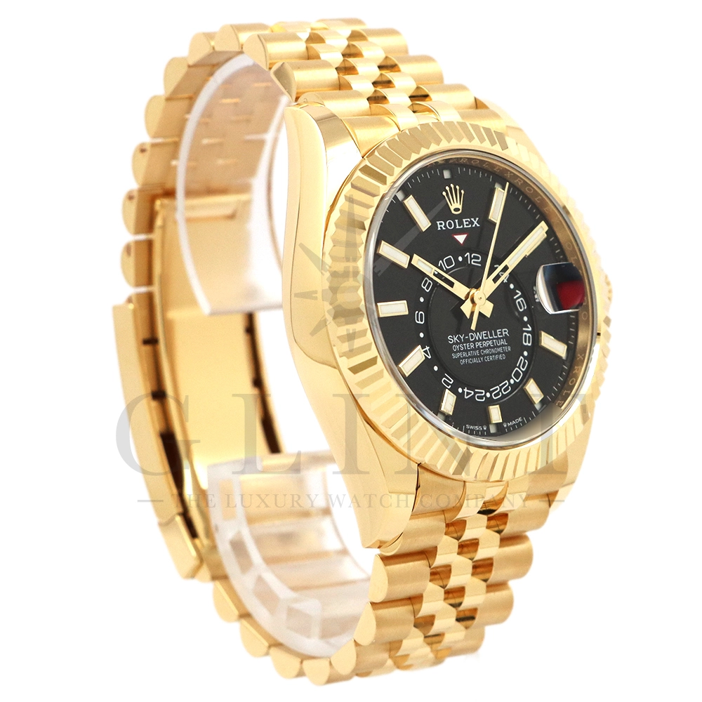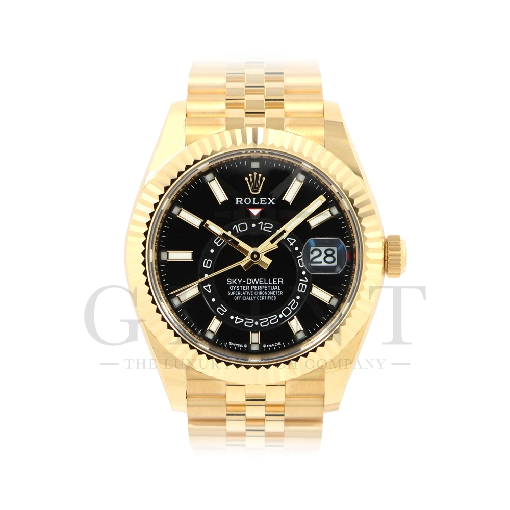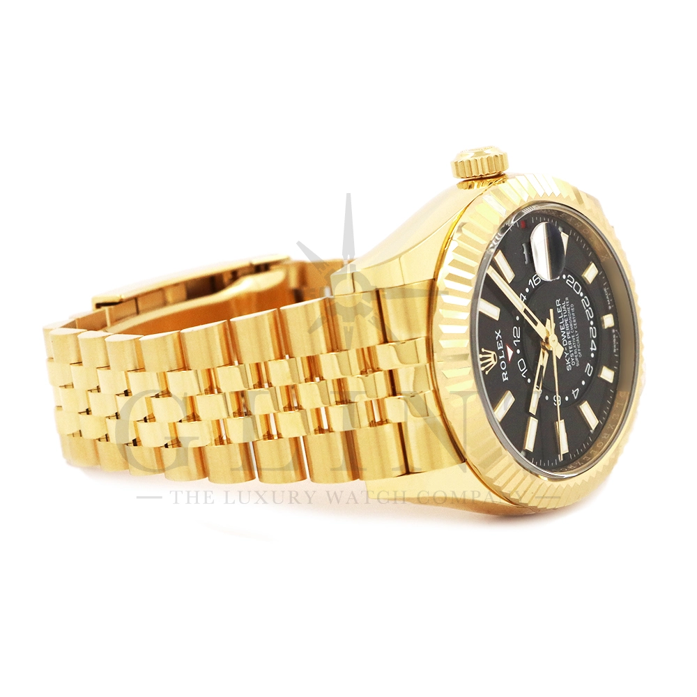 こちらはロレックス スカイドゥエラー 336938です。素材に18Kイエローゴールドを採用したゴージャスな雰囲気を与えてくれるモデル。ブライトブラックの文字盤で精悍な印象ながらも、これまでになかったホワイトのバーインデックスが備えられたことによって、昼夜での高い視認性を確保しております。ムーブメントには、ROLEX初のセミコンプリケーションキャリバーCal.9001を進化させたCal.9002を搭載。クロナジーエスケープメントが採用されたほか、常磁性ブルー パラクロム・ヒゲゼンマイも実装されるなど、ロレックスがムーブメントにもたらした主要な革新技術を含んでいます。また、ブレスレットにはしなやかで快適な5列リンクのジュビリーブレスレットを採用。フォールディングタイプのオイスタークラスプが装備され、ロレックスが開発したイージーリンク(エクステンションリンク)も備えております。素材による高級感と実用性を見事に融合させたロレックス史上最高の複雑機構を搭載した一本です。