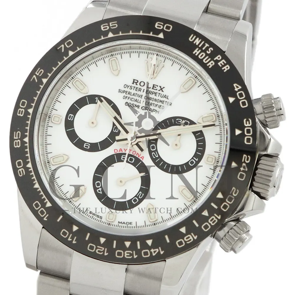 こちらはロレックス デイトナ 116500LNです。ベゼルには耐傷性・耐衝撃性が強いブラックセラミックを使用。彫りこまれたタキメーターにはプラチナを使用しており、贅沢な仕上げを施されております。キャリバーはRef.116520と同じくロレックス社が誇る技術が集積された完全自社製ムーブメントcal.4130を採用。あらゆる姿勢差において等時性を保ち、72時間ものパワーリザーブを誇ります。これまでのモデルと比較しても、高級感が更に増したロレックスが誇るフラッグシップモデル。ホワイト文字盤は爽やかな雰囲気を演出してくれます。