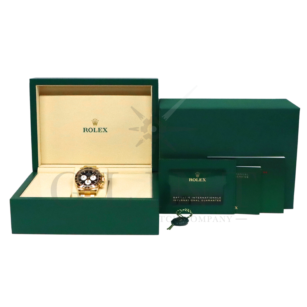 こちらはロレックス デイトナ 126528LNです。2023年のル・マン24時間レース第100回を記念して発表されたデイトナのイエローゴールドモデルが登場。同様に文字盤には往年のヴィンテージモデルに見受けられたモチーフ、エキゾチックダイアル(ポール・ニューマンダイアル)を再現しており、イエローゴールドで縁取られたブラックのセラミック製ベゼルには、メーターの「100」がレッドセラミックでコーティング。ムーブメントは126529LNと同じく9時位置の積算計がル・マン24時間レースに因んで12時間から24時間に変更されたことに伴い、Cal.4131をブラッシュアップしたCal.4132を搭載しております。更にケースバックはシースルー化されたことによって、Cal.4132を堪能することができるでしょう。デイトナ60周年、ル・マン24時間レース100周年に相応しい比類なき魅力が存分に詰まった非常に豪華な逸品となっております。