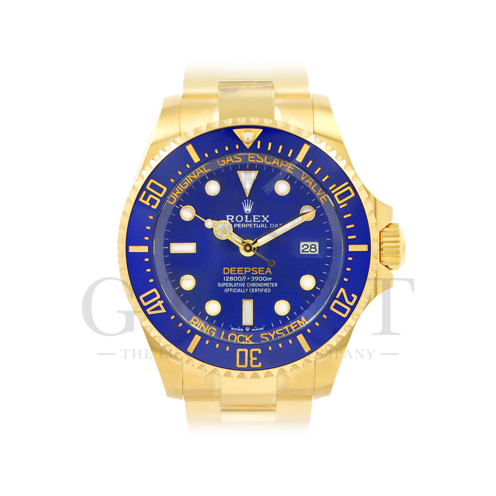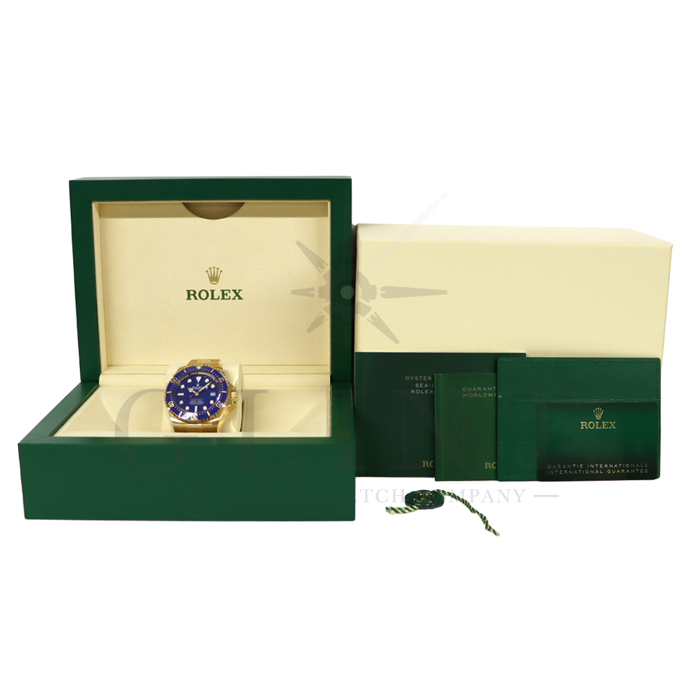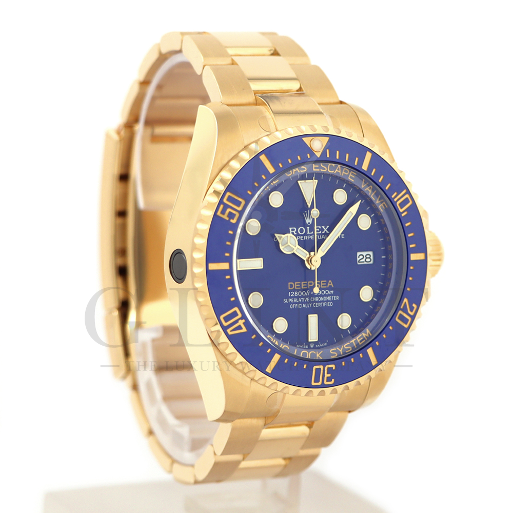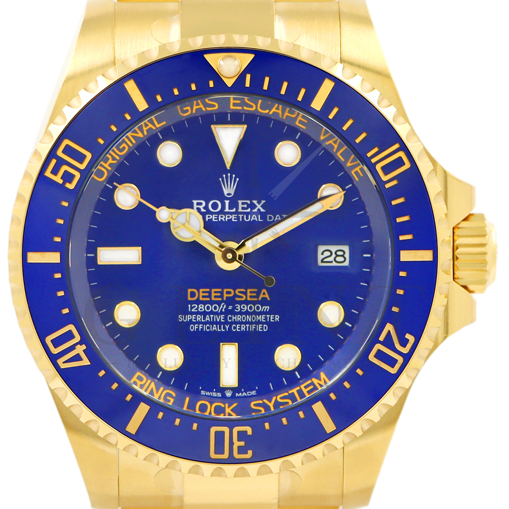 こちらは、2024年の新作モデルとして登場したロレックス シードゥエラー ディープシー136668LBです。ケースとブレスレットには、ディープシーで初となるゴールド素材を採用。さらにパウダーイエローでモデル名の「DEEPSEA」が記されたブルーラッカーダイアル、耐圧リング、セラクロムベゼルインサートのブルーが組み合わさって繊細な海の色合いを織りなし、華やかで重厚な高級感を与えてくれる仕上がりとなっております。ケースバックにはステンレスモデル136660と同様にRLXチタンを採用。また、ヘリウム排出バルブや革新的なケース構造となるリングロックシステムによる並外れた強度、防水性能、耐水圧性能で防水性3900mをそのまま実現。ロレックスの最先端テクノロジーが凝縮された最高のクオリティを誇る18Kイエローゴールドの本格的なダイバーズウォッチは、他のモデルには無い特別な雰囲気を感じさせてくれる事は間違いありません。