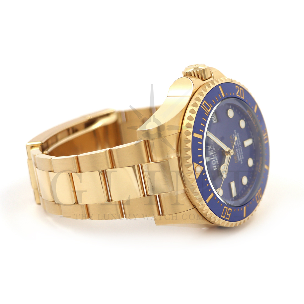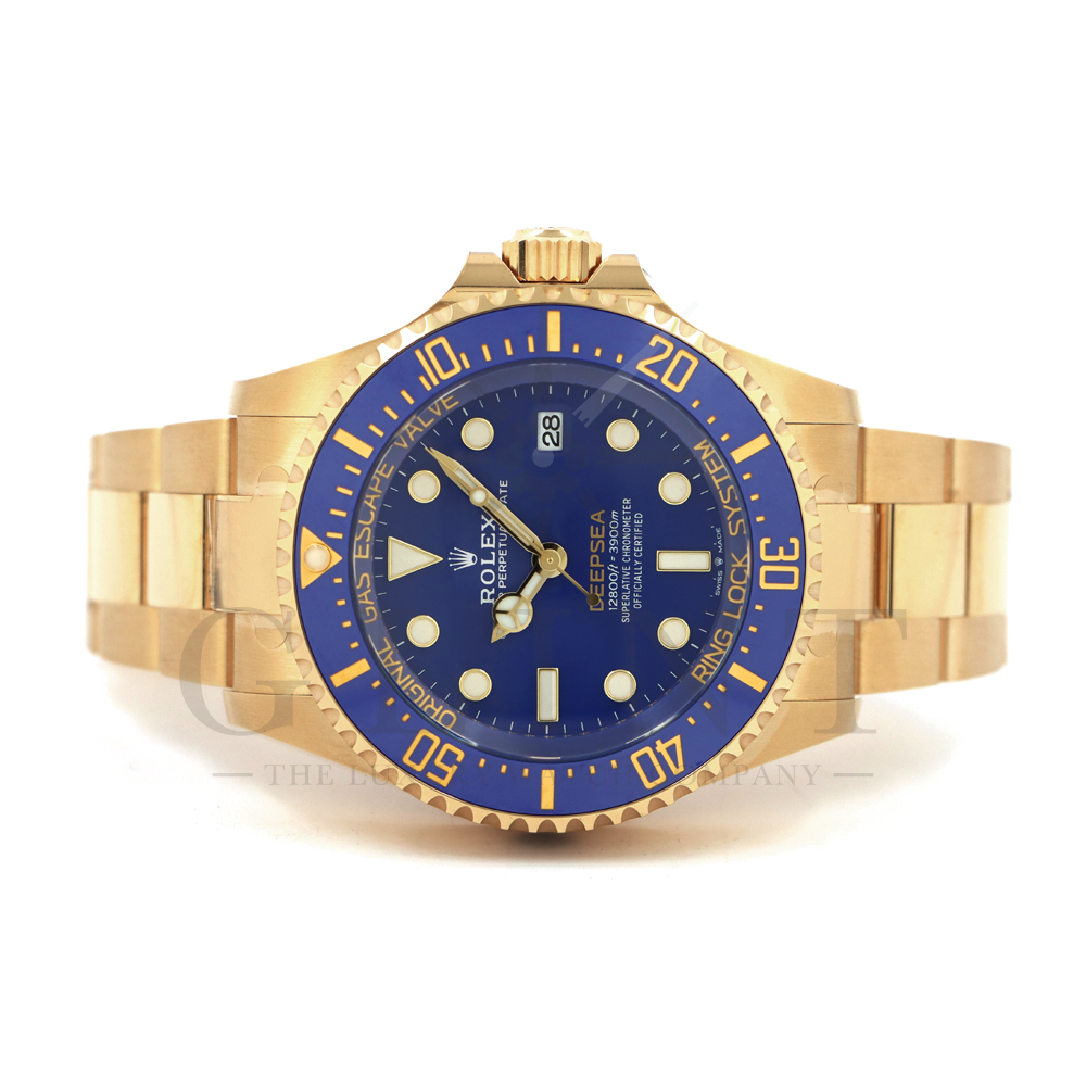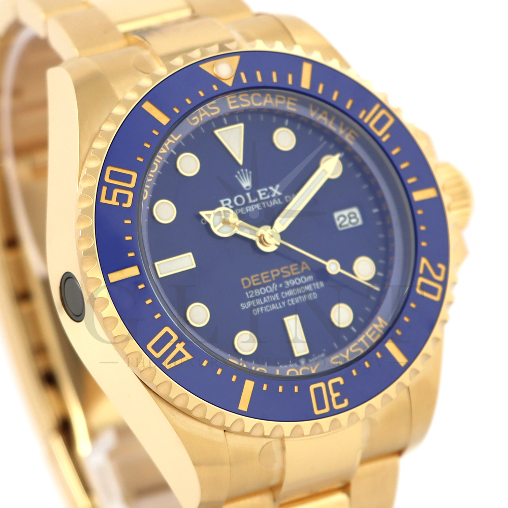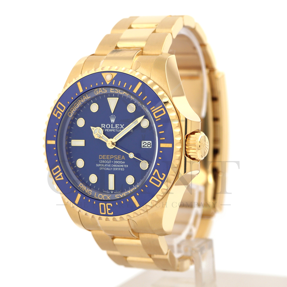 こちらは、2024年の新作モデルとして登場したロレックス シードゥエラー ディープシー136668LBです。ケースとブレスレットには、ディープシーで初となるゴールド素材を採用。さらにパウダーイエローでモデル名の「DEEPSEA」が記されたブルーラッカーダイアル、耐圧リング、セラクロムベゼルインサートのブルーが組み合わさって繊細な海の色合いを織りなし、華やかで重厚な高級感を与えてくれる仕上がりとなっております。ケースバックにはステンレスモデル136660と同様にRLXチタンを採用。また、ヘリウム排出バルブや革新的なケース構造となるリングロックシステムによる並外れた強度、防水性能、耐水圧性能で防水性3900mをそのまま実現。ロレックスの最先端テクノロジーが凝縮された最高のクオリティを誇る18Kイエローゴールドの本格的なダイバーズウォッチは、他のモデルには無い特別な雰囲気を感じさせてくれる事は間違いありません。