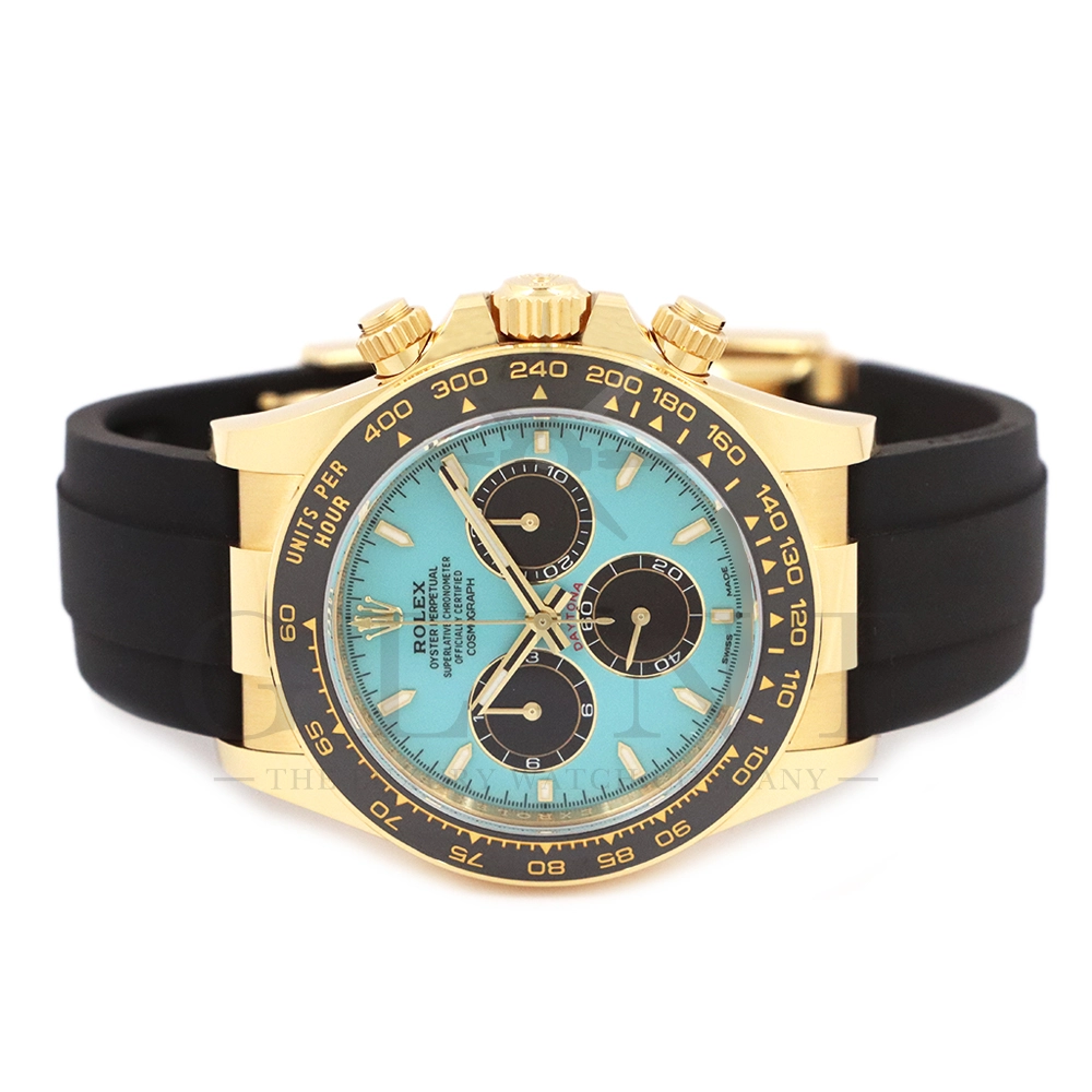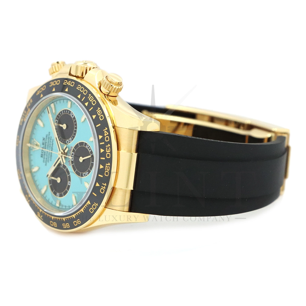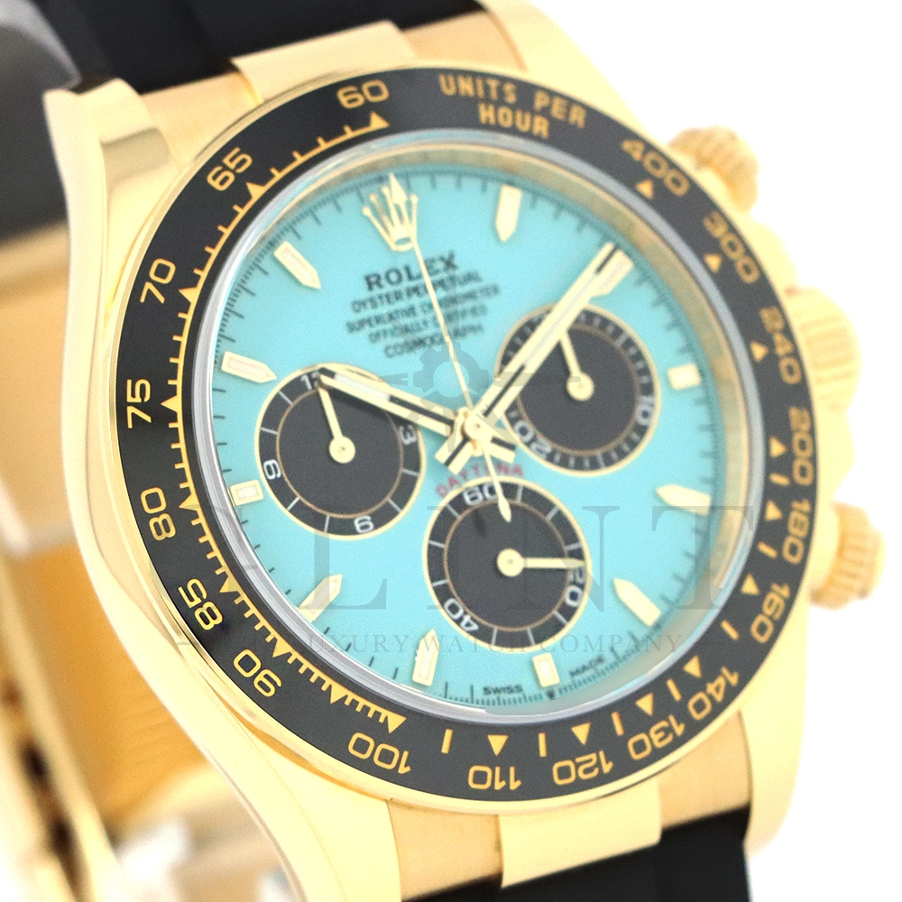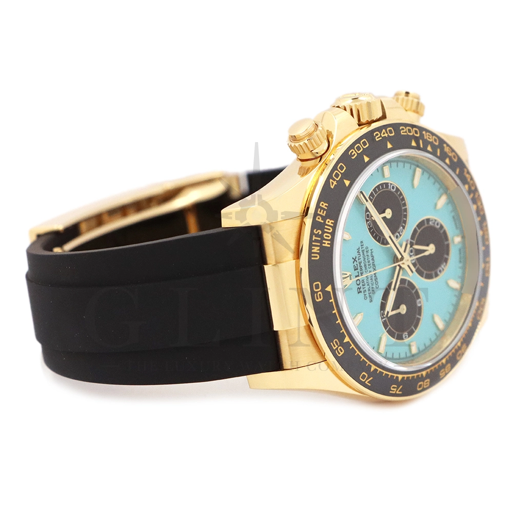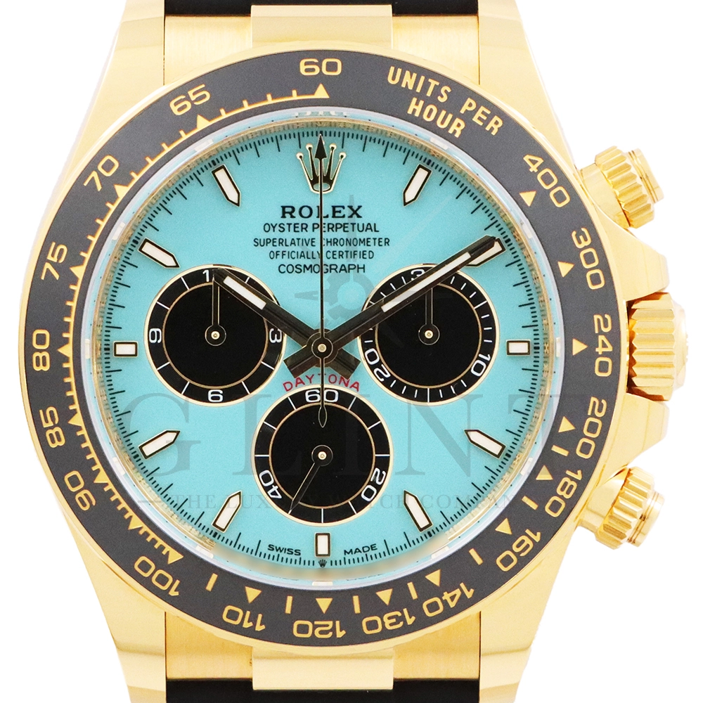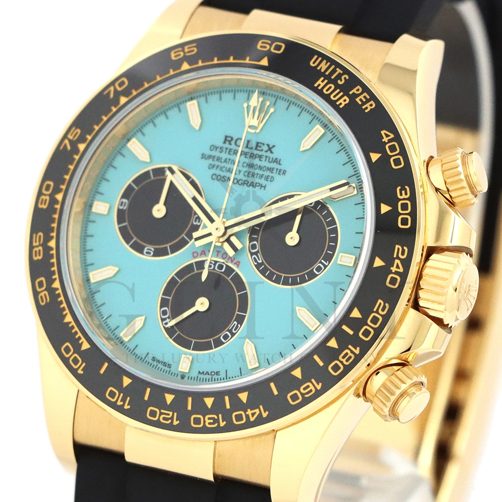 こちらはロレックス デイトナです。コスモグラフ デイトナ誕生60周年を迎えた2023年に新モデルとして生まれ変わりました。ダイアルのアワーマーカーとカウンター目盛り等のグラフィックバランスが一新され、自社開発・製造の新ムーブメントCal.4131を搭載。エネルギーロスを低減するクロナジー エスケープメント、耐衝撃性に優れるパラフレックス ショック・アブソーバ等の革新技術が採用されております。そして文字盤には鮮やかなターコイズブルーのラッカーダイアル。ブラックのカウンター、そしてブラックのベゼルを合わせ、コントラストが際立つデザインに仕上がっております。バックルはグライドロックエクステンションシステムが搭載。実用性にも優れた、これまでにはない雰囲気を堪能できるデイトナです。
