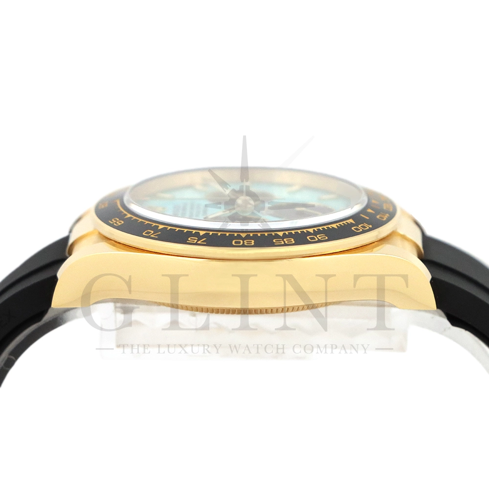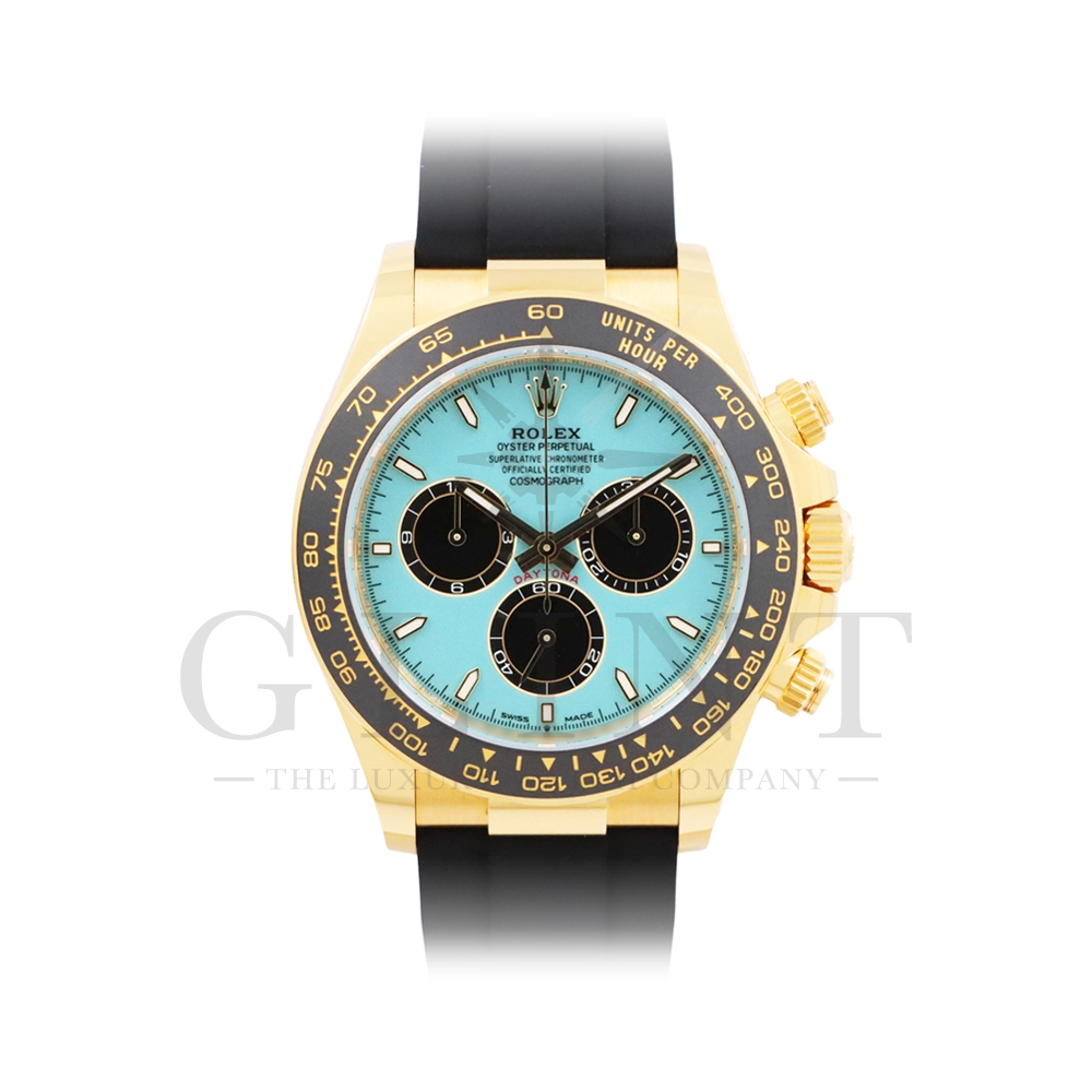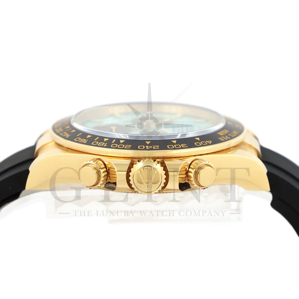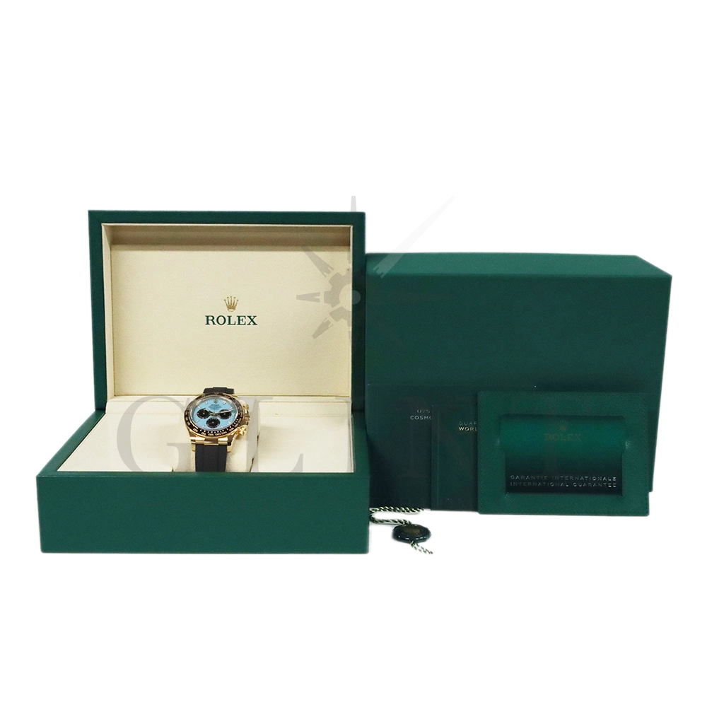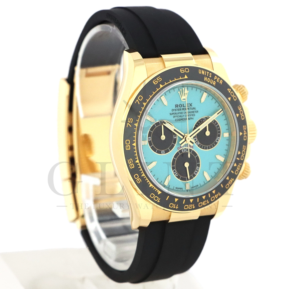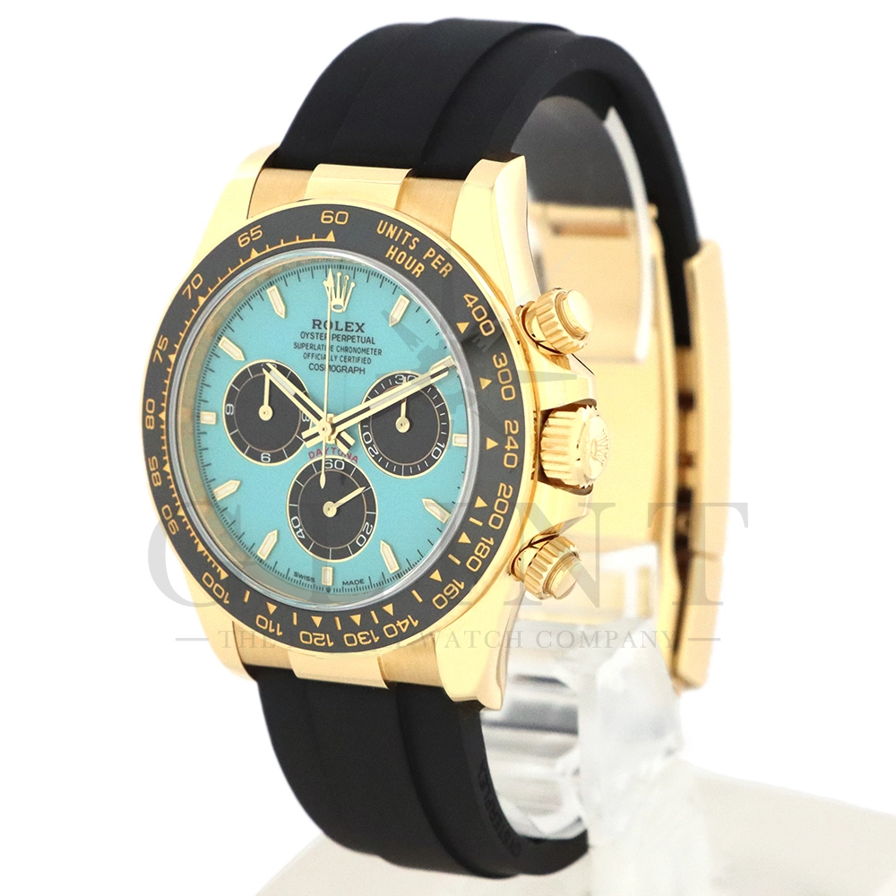 こちらはロレックス デイトナです。コスモグラフ デイトナ誕生60周年を迎えた2023年に新モデルとして生まれ変わりました。ダイアルのアワーマーカーとカウンター目盛り等のグラフィックバランスが一新され、自社開発・製造の新ムーブメントCal.4131を搭載。エネルギーロスを低減するクロナジー エスケープメント、耐衝撃性に優れるパラフレックス ショック・アブソーバ等の革新技術が採用されております。そして文字盤には鮮やかなターコイズブルーのラッカーダイアル。ブラックのカウンター、そしてブラックのベゼルを合わせ、コントラストが際立つデザインに仕上がっております。バックルはグライドロックエクステンションシステムが搭載。実用性にも優れた、これまでにはない雰囲気を堪能できるデイトナです。