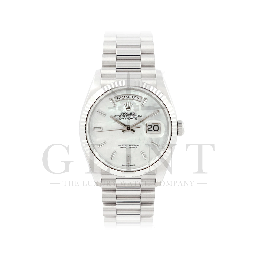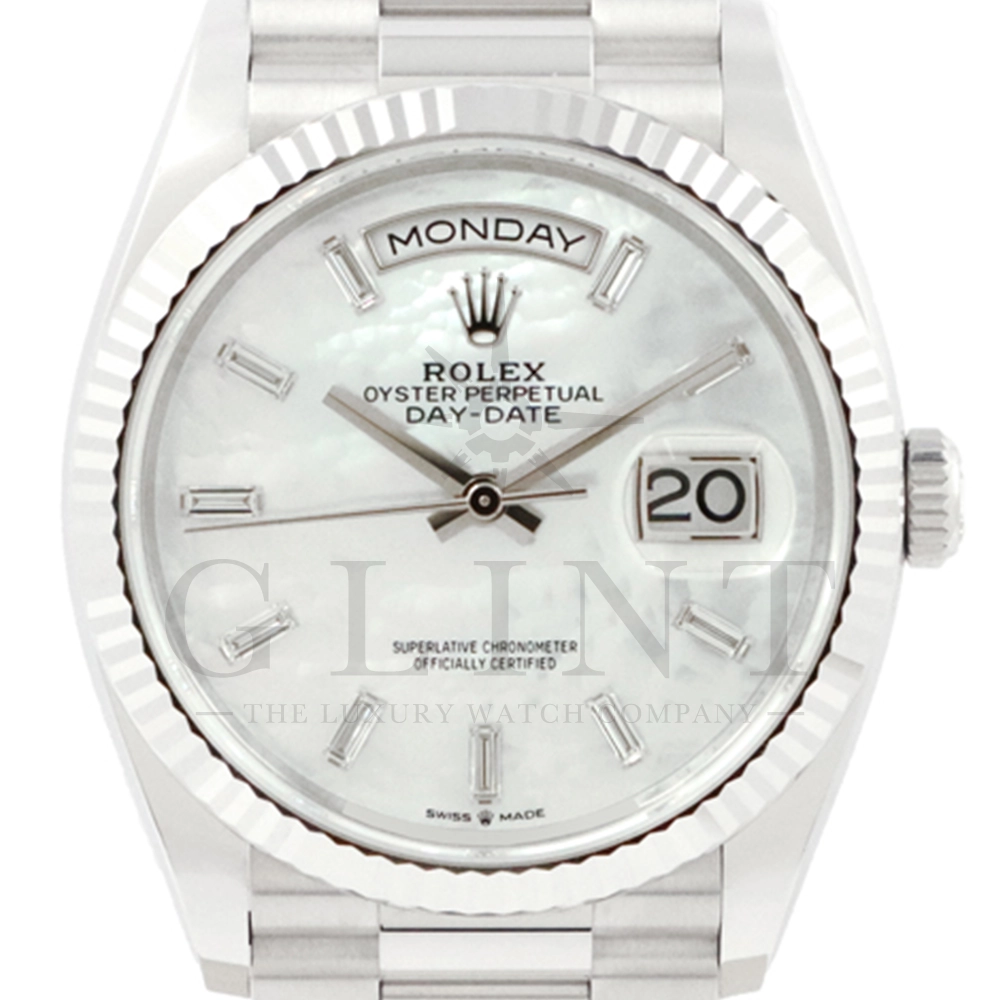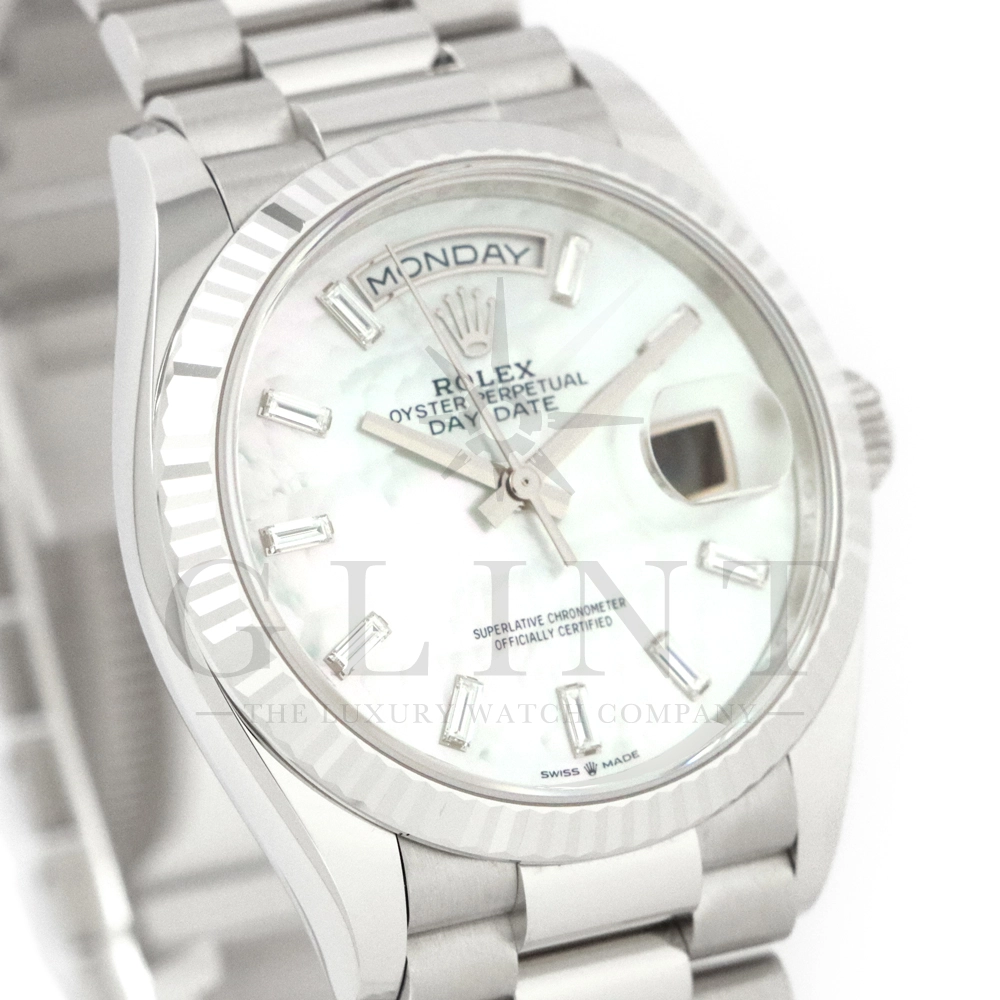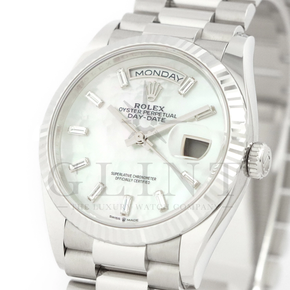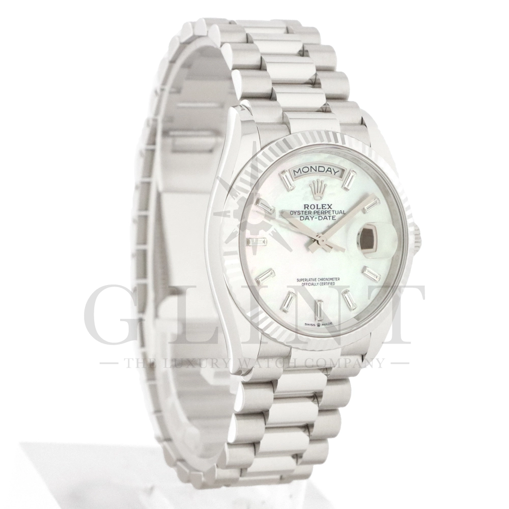 こちらはロレックス オイスターパーペチュアル デイデイト36 128236NAです。2024年に登場した、10個のバゲットカットダイヤモンドがセッティングされたホワイトマザーオブパール文字盤を備えたモデル。天然の白蝶貝が放つ柔らかな光沢は、角度によって表情を変え、プラチナの持つ重厚な輝きと見事に調和しています。光の反射で淡く虹色に浮かび上がるシェルの艶やかさと、バゲットダイヤの直線的な煌めきが融合し、比類なき気品を感じさせる一本です。ムーブメントには、ロレックスが自社開発した最新世代の自動巻きムーブメント「Cal.3255」を搭載。約70時間のパワーリザーブを誇り、精度・耐久性・信頼性のいずれも最高水準を実現しています。プレジデントブレスレットとの一体感を追求したケースフォルムは、手首にしっとりと馴染み、装着感にも優れています。ロレックスが誇る最高峰コレクション「デイデイト」の中でも、プラチナ×ホワイトMOP×バゲットダイヤの組み合わせは稀少であり、特別な一本を求める方に相応しい逸品です。