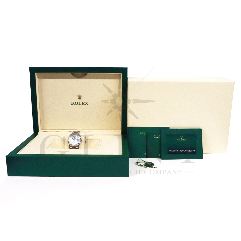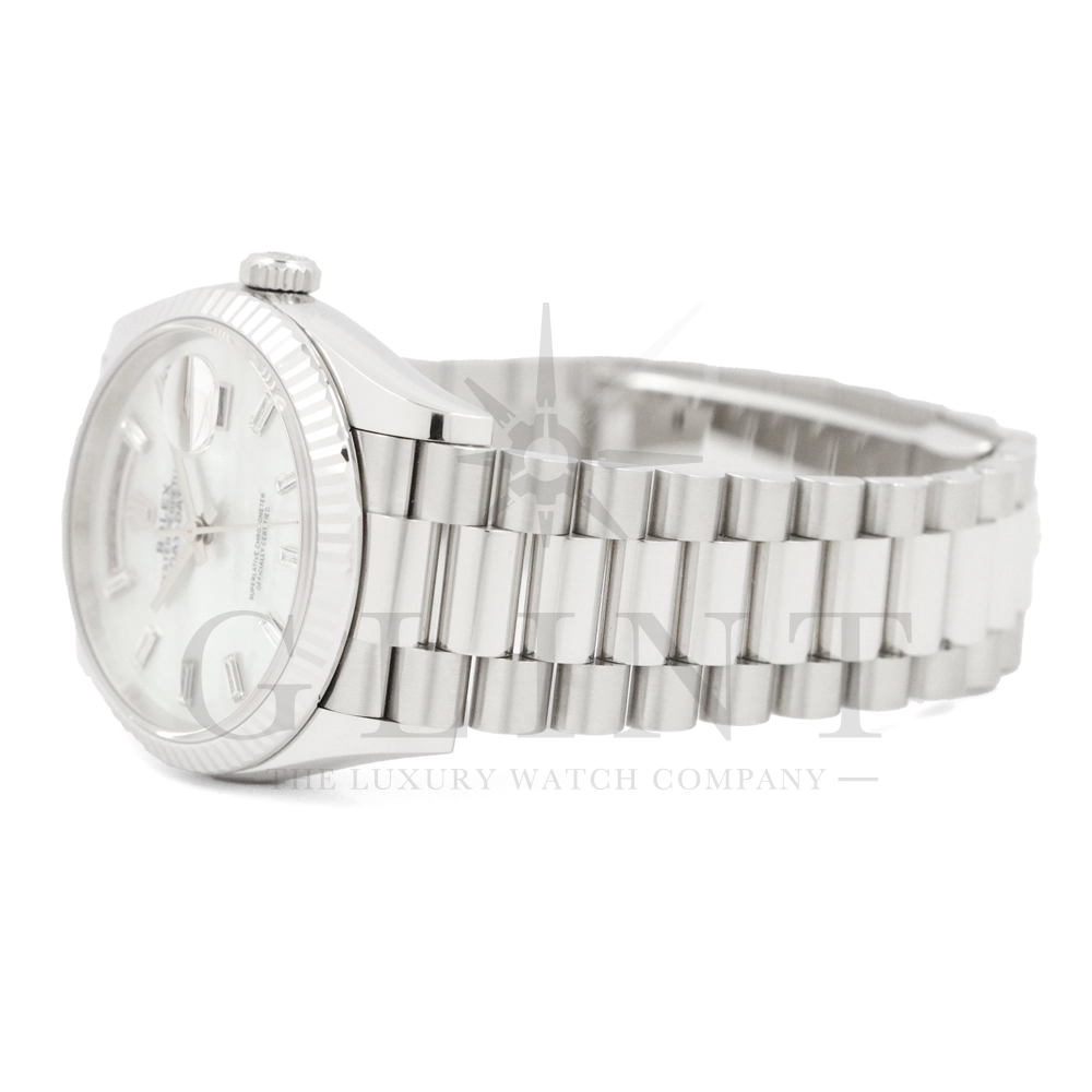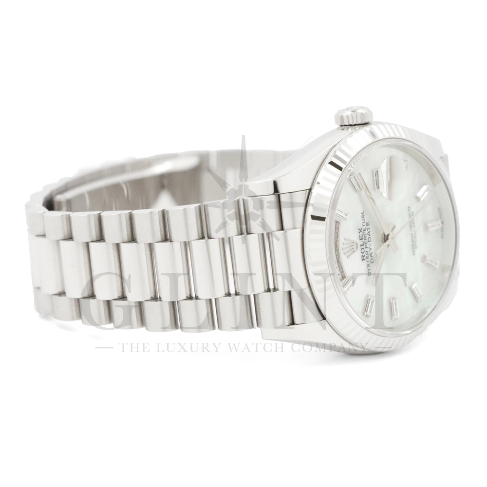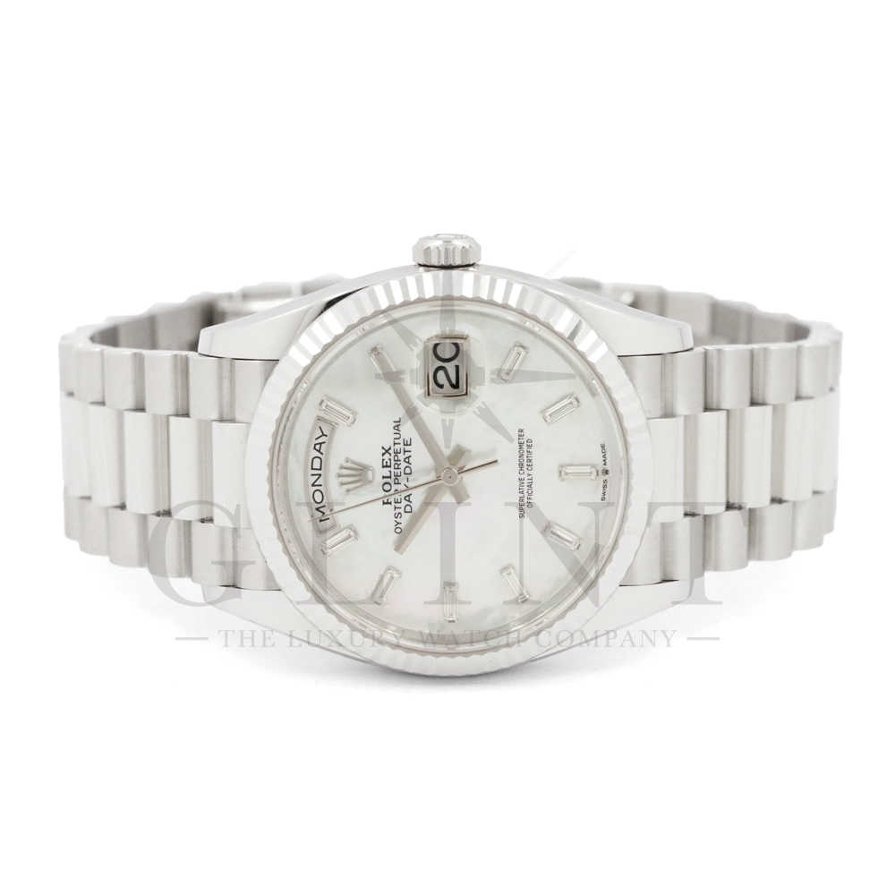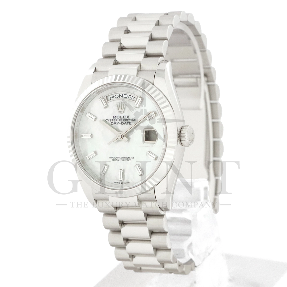 こちらはロレックス オイスターパーペチュアル デイデイト36 128236NAです。2024年に登場した、10個のバゲットカットダイヤモンドがセッティングされたホワイトマザーオブパール文字盤を備えたモデル。天然の白蝶貝が放つ柔らかな光沢は、角度によって表情を変え、プラチナの持つ重厚な輝きと見事に調和しています。光の反射で淡く虹色に浮かび上がるシェルの艶やかさと、バゲットダイヤの直線的な煌めきが融合し、比類なき気品を感じさせる一本です。ムーブメントには、ロレックスが自社開発した最新世代の自動巻きムーブメント「Cal.3255」を搭載。約70時間のパワーリザーブを誇り、精度・耐久性・信頼性のいずれも最高水準を実現しています。プレジデントブレスレットとの一体感を追求したケースフォルムは、手首にしっとりと馴染み、装着感にも優れています。ロレックスが誇る最高峰コレクション「デイデイト」の中でも、プラチナ×ホワイトMOP×バゲットダイヤの組み合わせは稀少であり、特別な一本を求める方に相応しい逸品です。