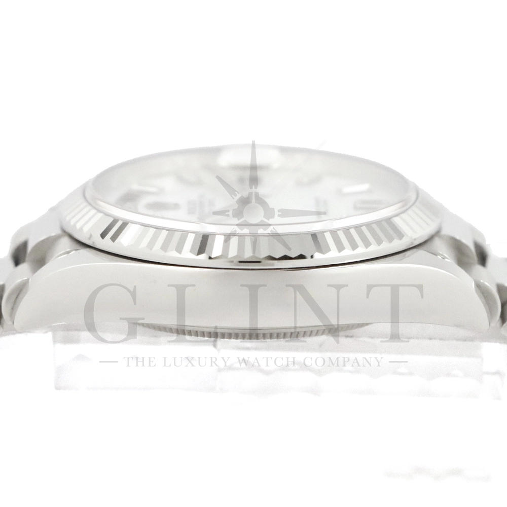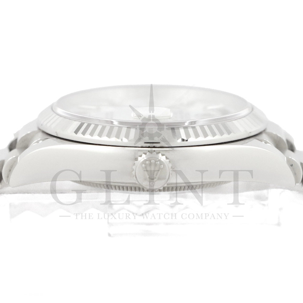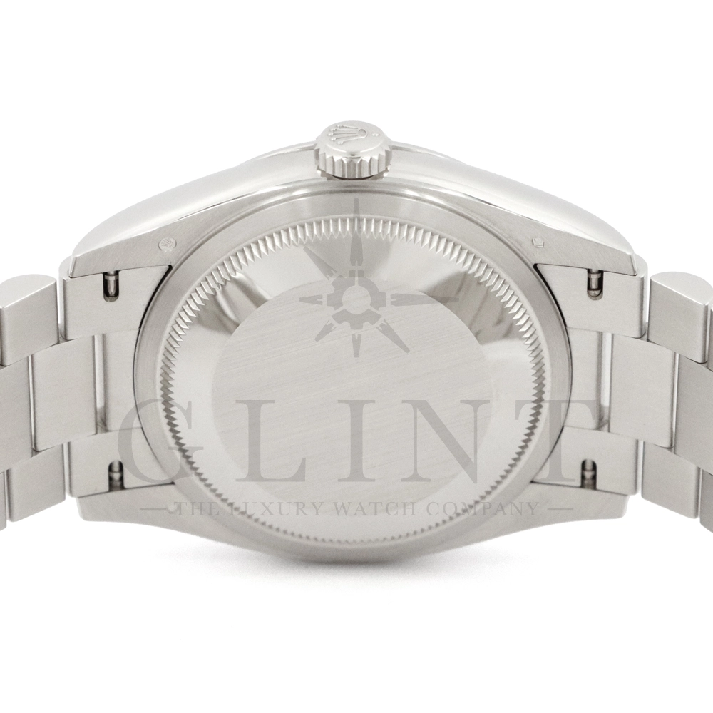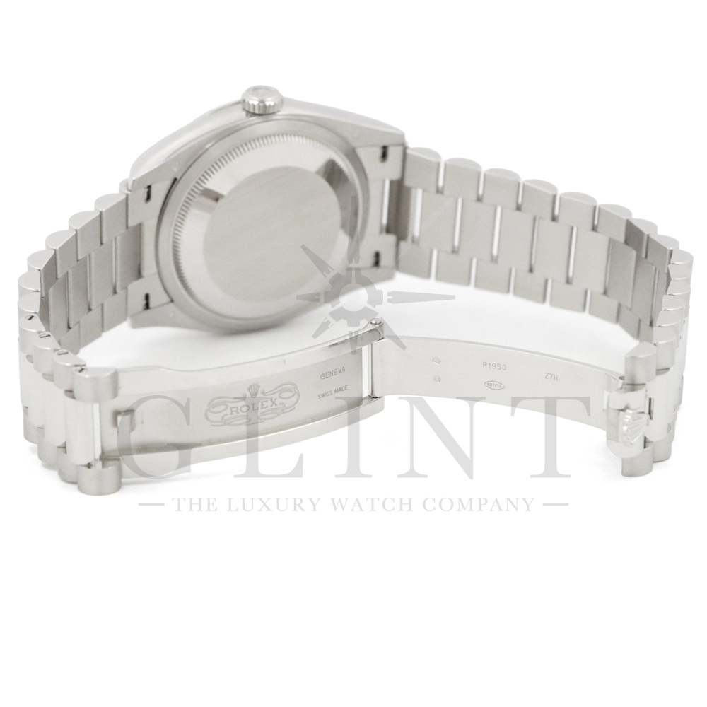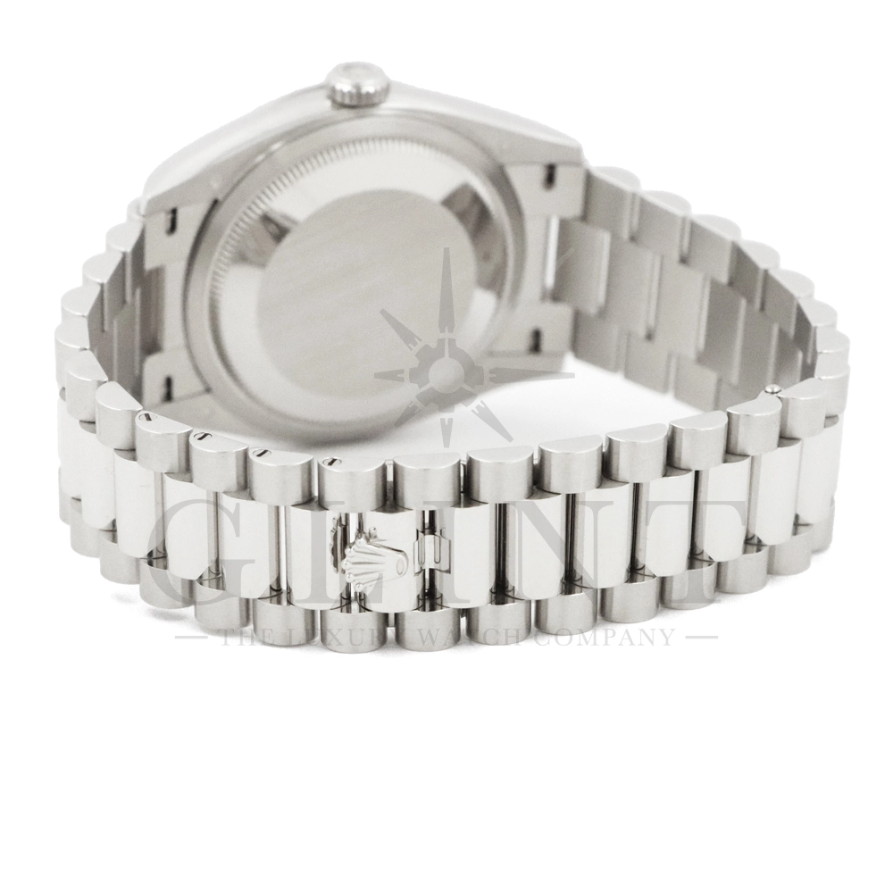 こちらはロレックス オイスターパーペチュアル デイデイト36 128236NAです。2024年に登場した、10個のバゲットカットダイヤモンドがセッティングされたホワイトマザーオブパール文字盤を備えたモデル。天然の白蝶貝が放つ柔らかな光沢は、角度によって表情を変え、プラチナの持つ重厚な輝きと見事に調和しています。光の反射で淡く虹色に浮かび上がるシェルの艶やかさと、バゲットダイヤの直線的な煌めきが融合し、比類なき気品を感じさせる一本です。ムーブメントには、ロレックスが自社開発した最新世代の自動巻きムーブメント「Cal.3255」を搭載。約70時間のパワーリザーブを誇り、精度・耐久性・信頼性のいずれも最高水準を実現しています。プレジデントブレスレットとの一体感を追求したケースフォルムは、手首にしっとりと馴染み、装着感にも優れています。ロレックスが誇る最高峰コレクション「デイデイト」の中でも、プラチナ×ホワイトMOP×バゲットダイヤの組み合わせは稀少であり、特別な一本を求める方に相応しい逸品です。