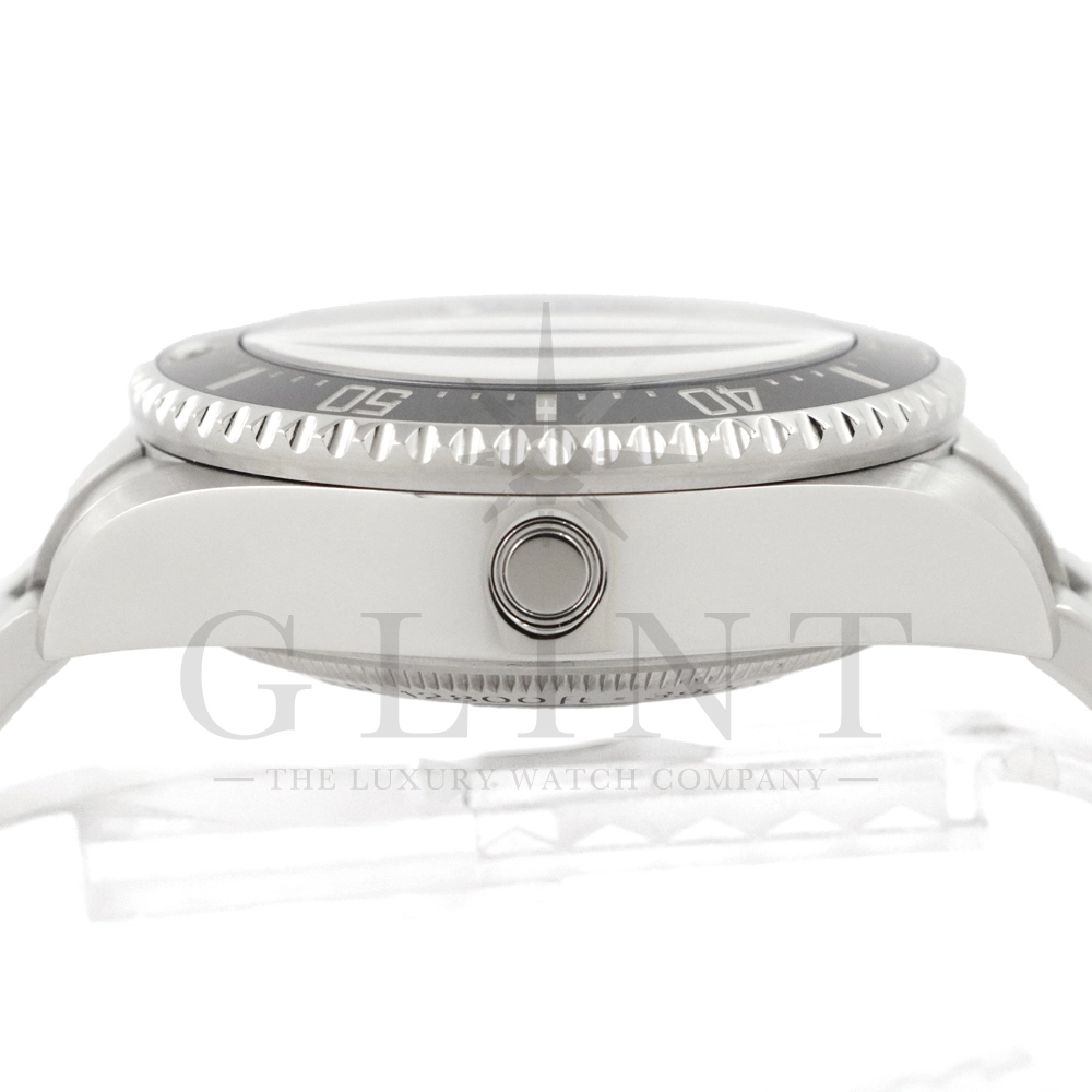 こちらはロレックス シードゥエラー ディープシーです。2008年に深海用に設計されたプロユース ダイバーズウォッチ。ヘリウム排出バルブや革新的なケース構造となるリングロックシステムによる並外れた強度、防水性能、耐水圧性能で防水性3900mを実現しており、量産型の機械式時計の中では最高の防水性能を誇ります。そしてロレックス史上最高のブレスレットと称される、グライドロックバックルとフリップロックエクステンションリンクの二つで構成される画期的なシステムで簡単に長さを調整することを可能とし実用性も抜群。ロレックスの最先端テクノロジーが凝縮された最高のクオリティを誇る本格的なダイバーズウォッチです。