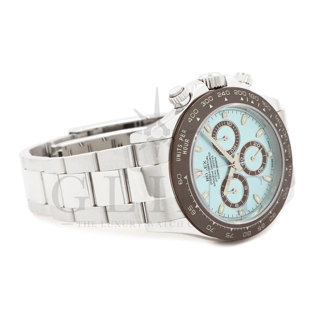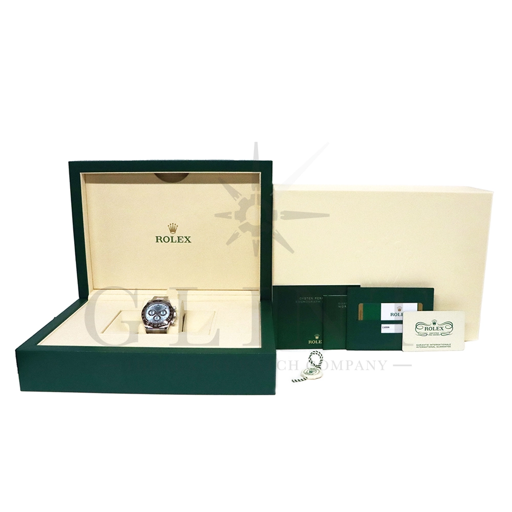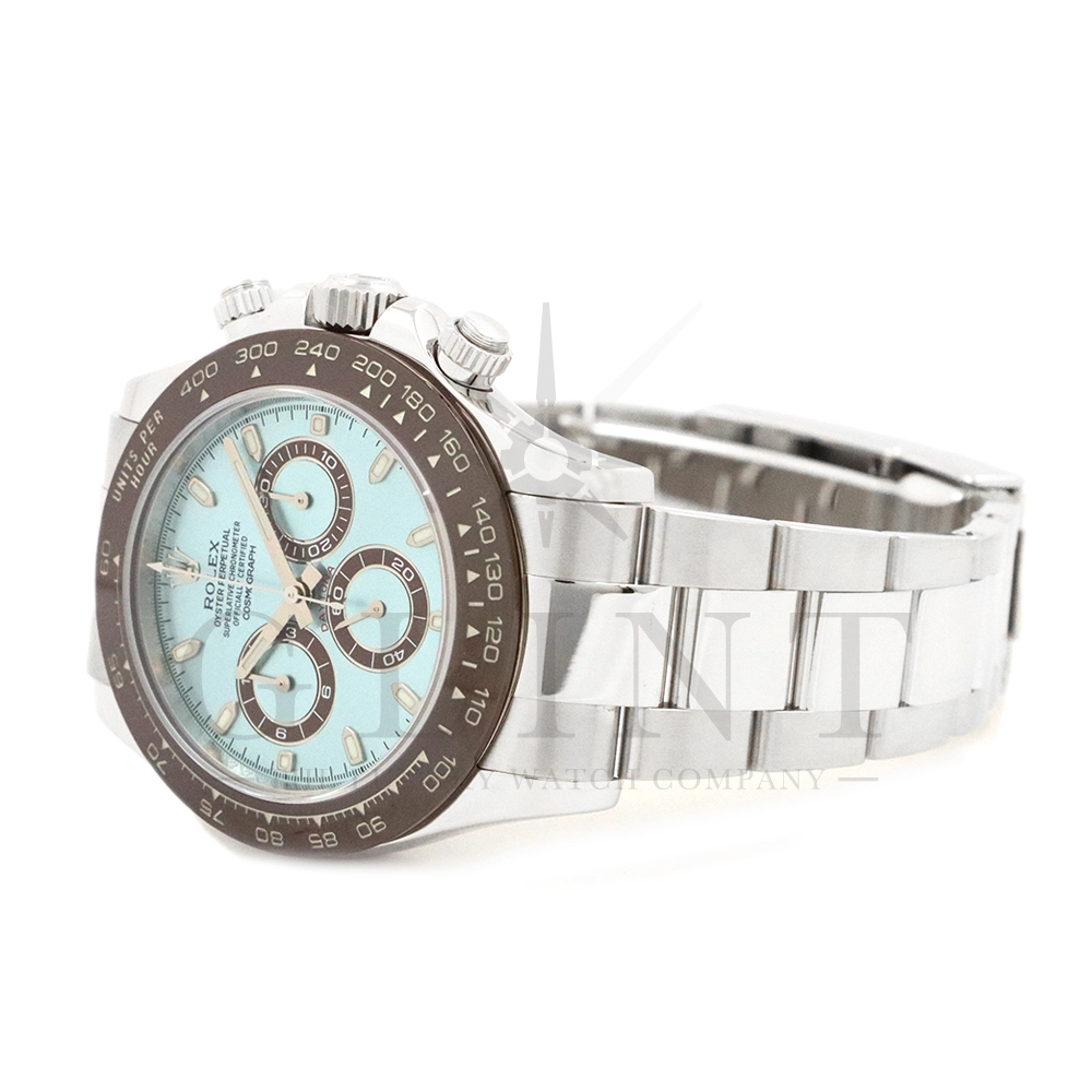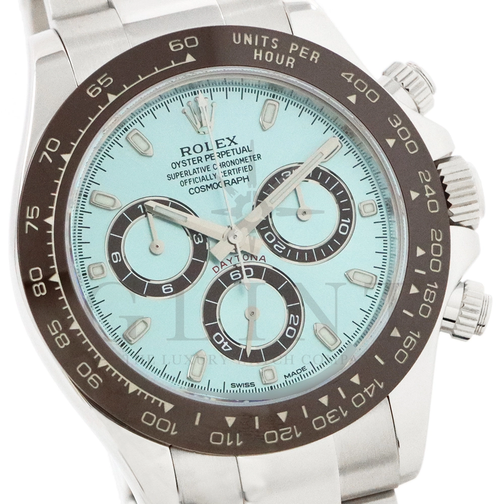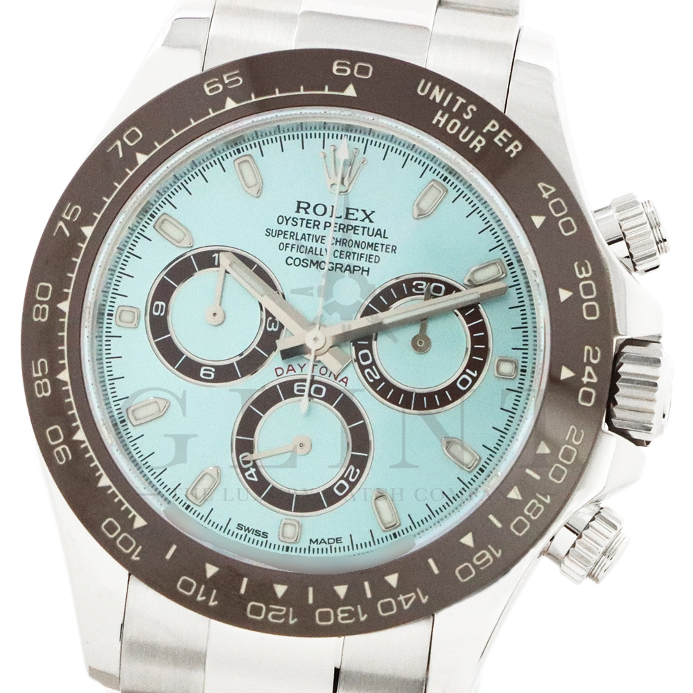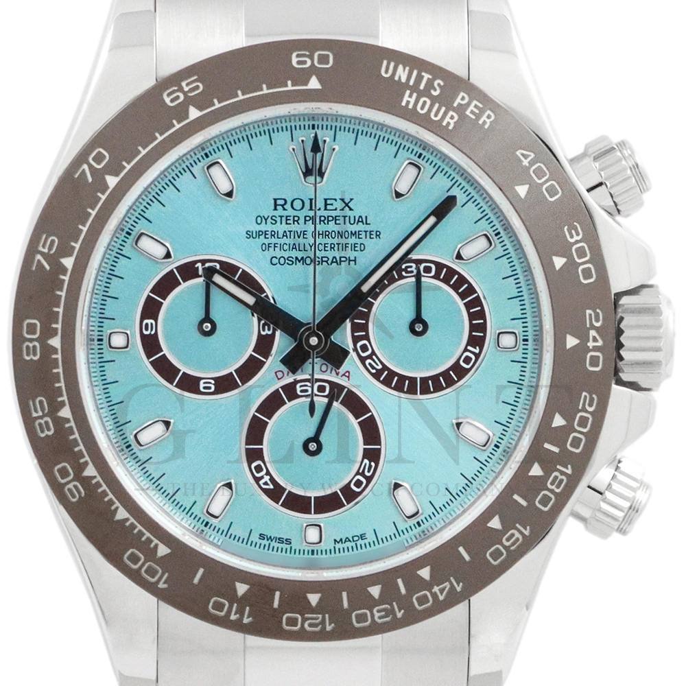 こちらはコスモグラフ デイトナRef.116506です。生誕50周年を記念して登場したデイトナの歴史上初となるプラチナ仕様のモデルとなっております。ムーブメントにはロレックス初の自社開発クロノグラフムーブメント「Cal.4130」を採用。そしてロレックスでは希少で高価なプラチナ素材を使ったモデルのみにセットされるアイスブルーのダイアルと、ロレックス独自の強靭なセラミック素材となるセラクロムベゼルに使用されたチェスナットブラウンとの絶妙なカラーリングが涼やかでエレガントな印象を演出。デイトナ50周年に相応しい比類なき魅力が存分に詰まった非常に豪華な逸品となっております。