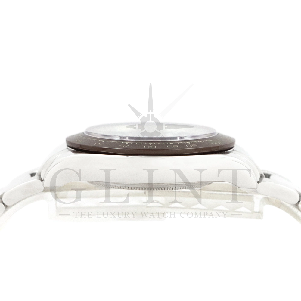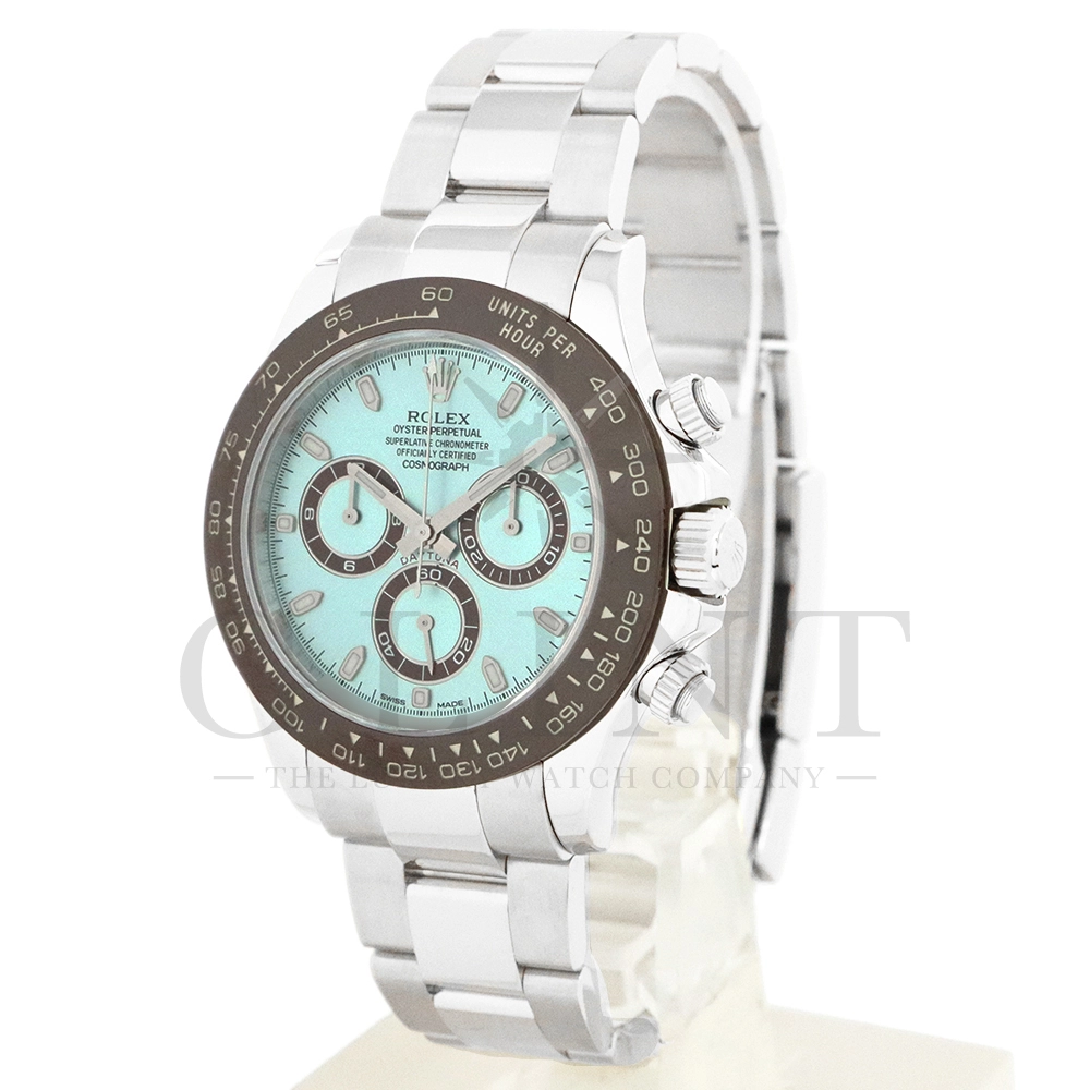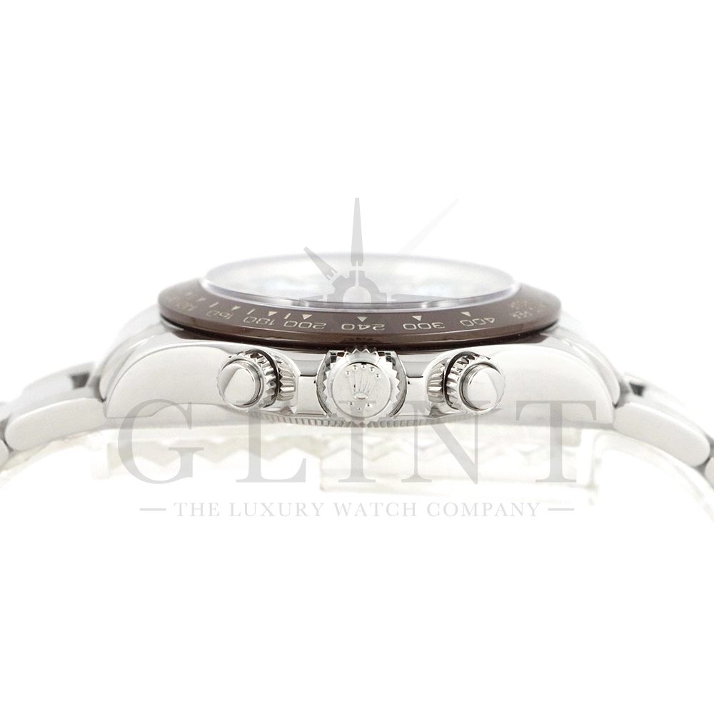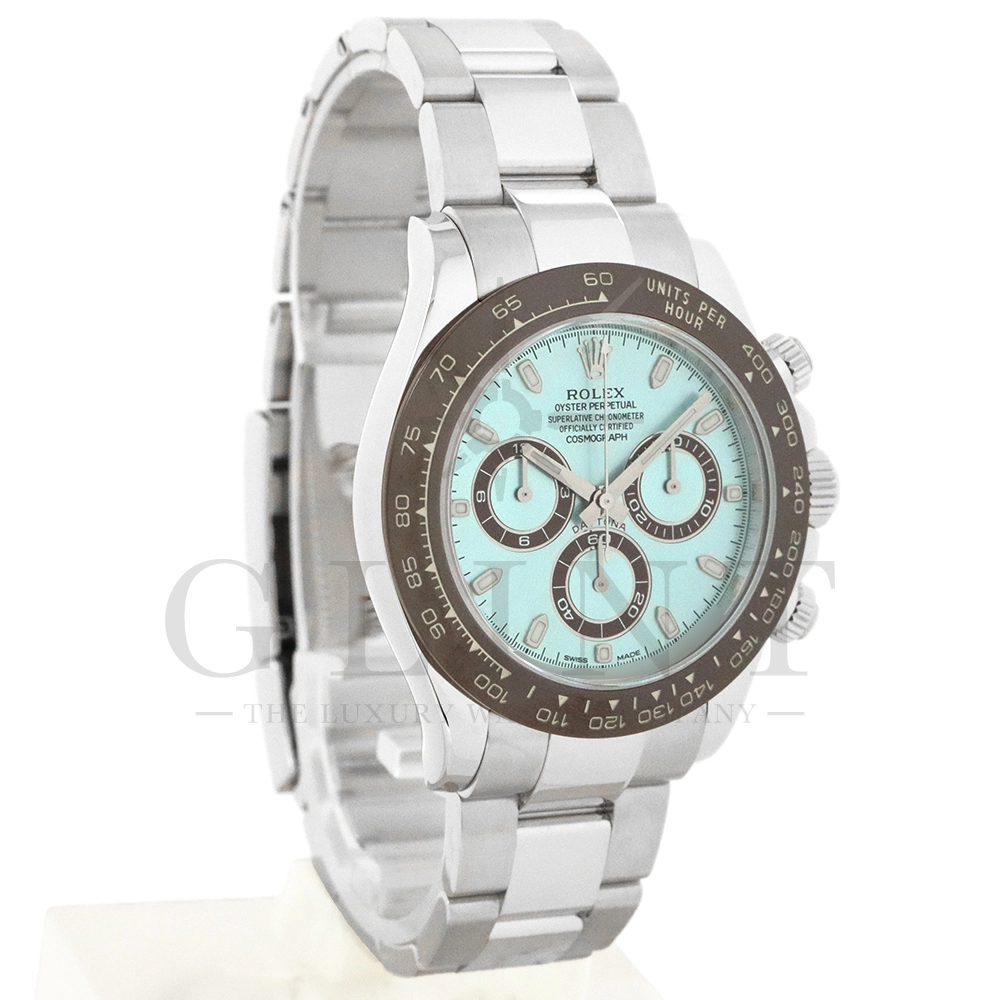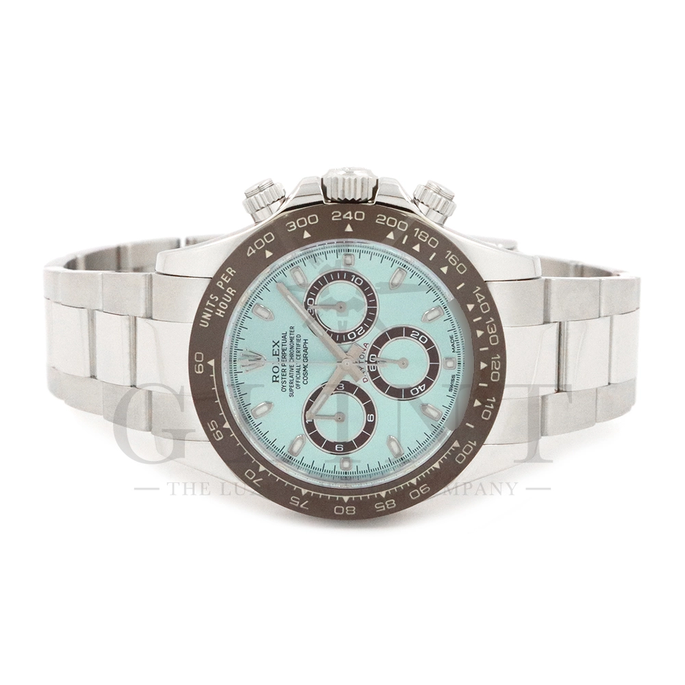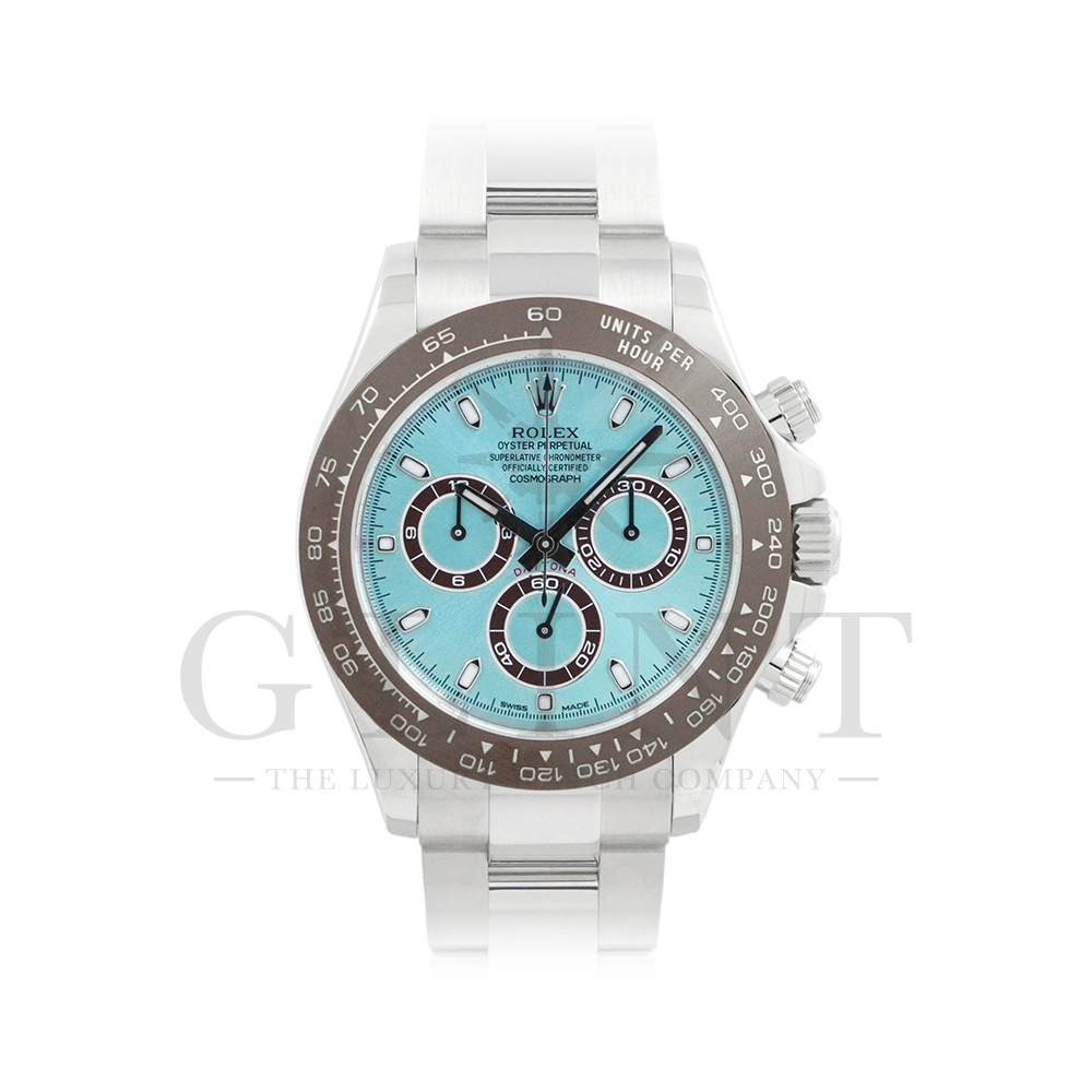 こちらはコスモグラフ デイトナRef.116506です。生誕50周年を記念して登場したデイトナの歴史上初となるプラチナ仕様のモデルとなっております。ムーブメントにはロレックス初の自社開発クロノグラフムーブメント「Cal.4130」を採用。そしてロレックスでは希少で高価なプラチナ素材を使ったモデルのみにセットされるアイスブルーのダイアルと、ロレックス独自の強靭なセラミック素材となるセラクロムベゼルに使用されたチェスナットブラウンとの絶妙なカラーリングが涼やかでエレガントな印象を演出。デイトナ50周年に相応しい比類なき魅力が存分に詰まった非常に豪華な逸品となっております。