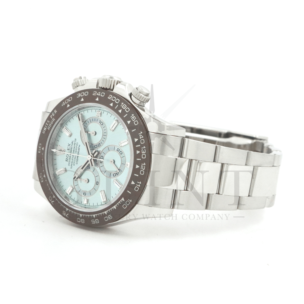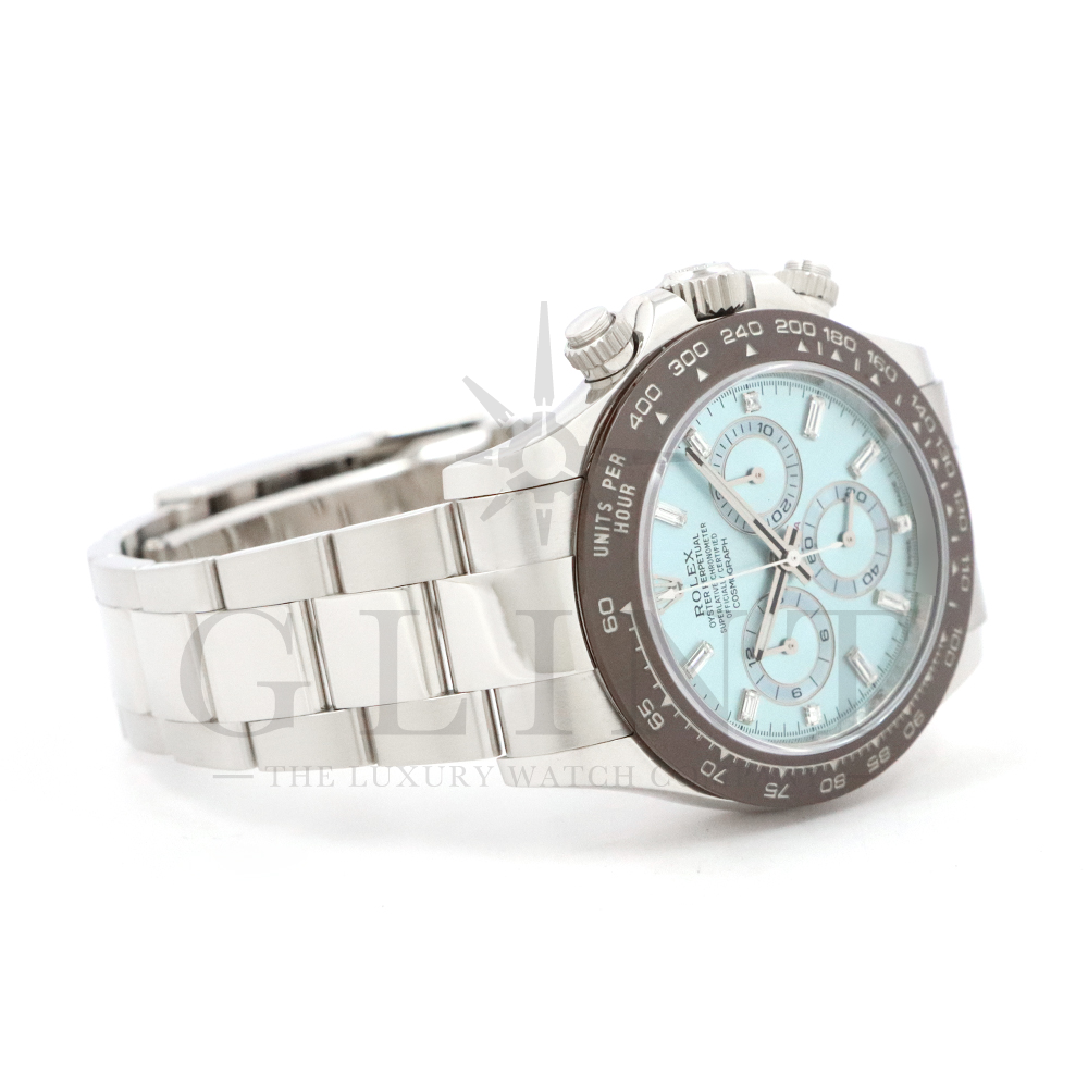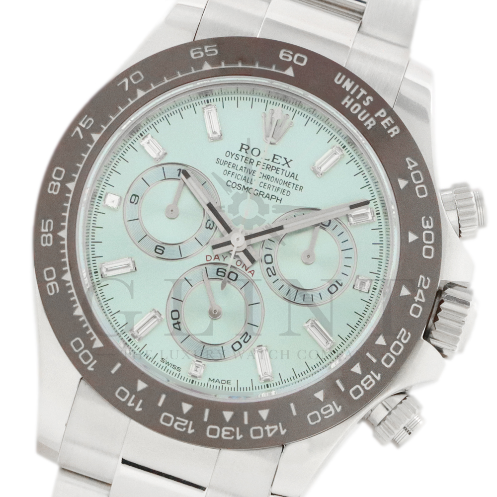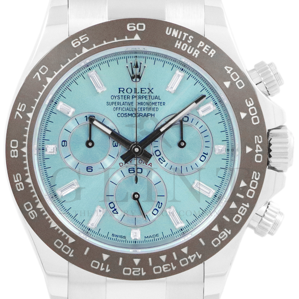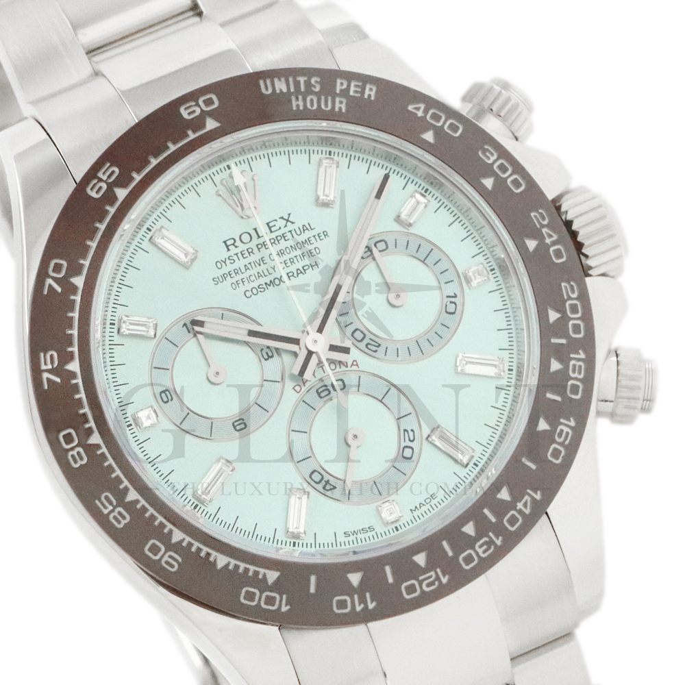 ロレックス デイトナ アイスブルー11Pダイヤモデルです。デイトナ生誕50周年を記念して登場したデイトナ史上初となるプラチナ仕様のモデル。こちらのRef.116506Aはアイスブルーダイアルのインデックスにバゲットダイヤモンドが8石、ラウンドブリリアントカットのダイヤモンドが3石セッティングされております。従来のインダイヤルはチェスナットブラウンカラーの外周でしたが、こちらのインダイヤルはダイヤルカラーと同じくアイスブルーとなっており、より高級感を感じさせてくれる仕上がりです。サンレイ仕上げの文字盤がより美しくアイスブルーを表現してくれます。ロレックス独自の強靭なセラミック素材となるセラクロムベゼルに使用されたチェスナットブラウンカラーとの相性は絶妙で、一目で特別なモデルと感じさせてくれるでしょう。数ある種類のデイトナの中でも圧倒的なステータスを与えてくれる至極の一本です。
