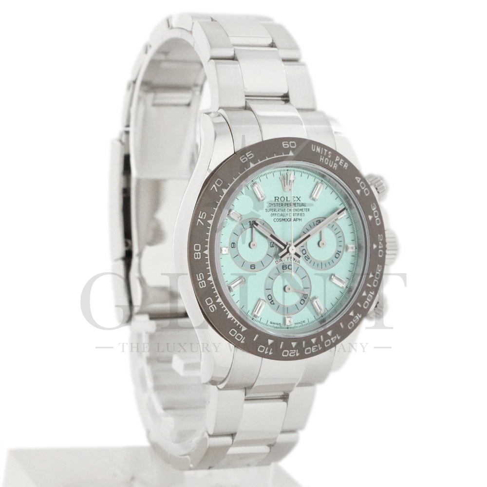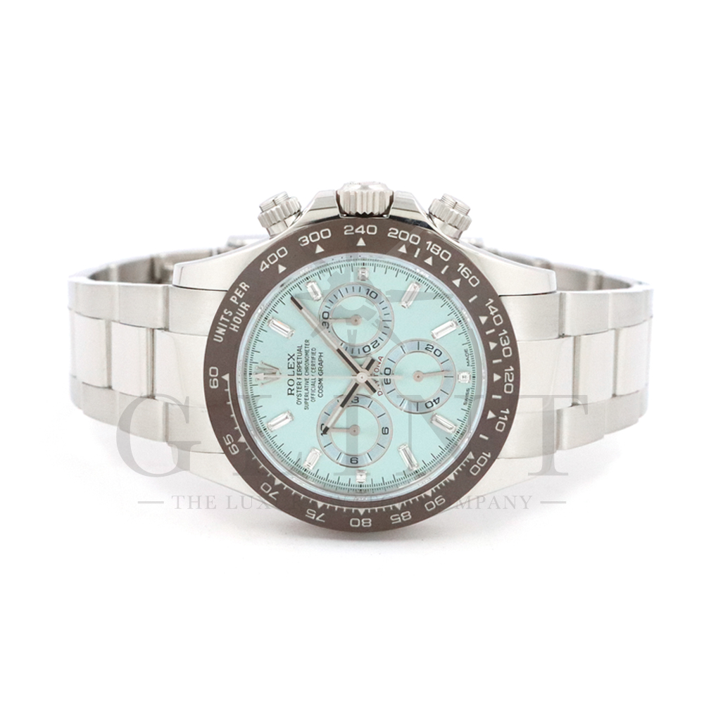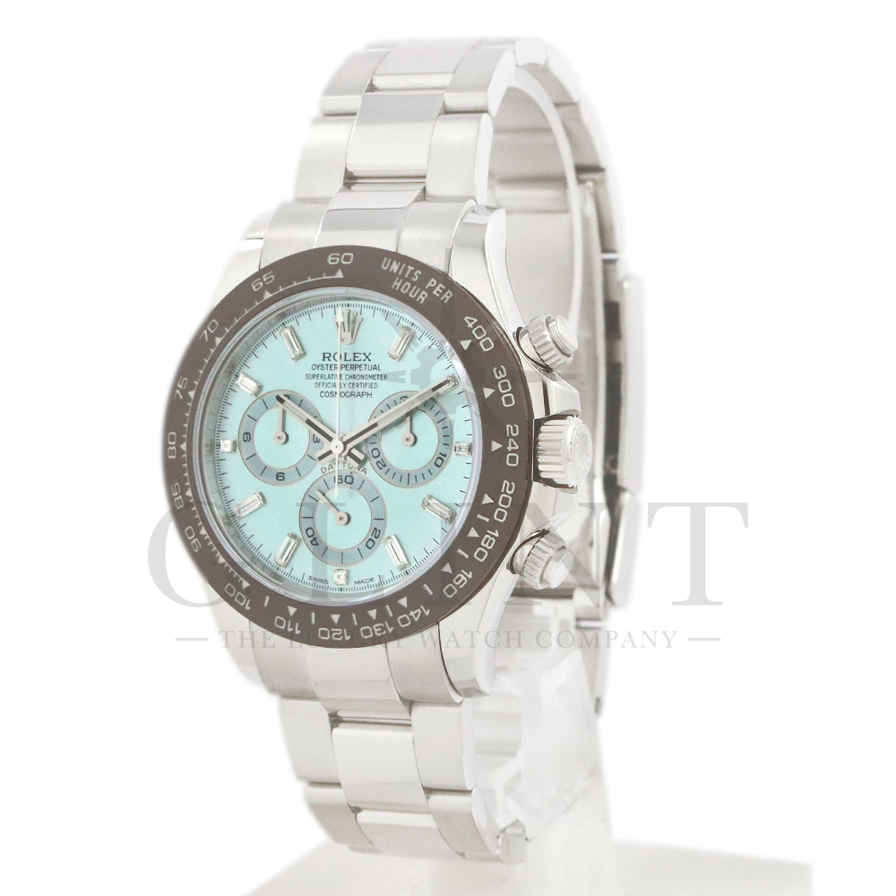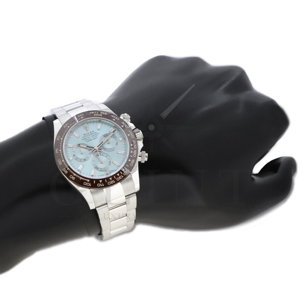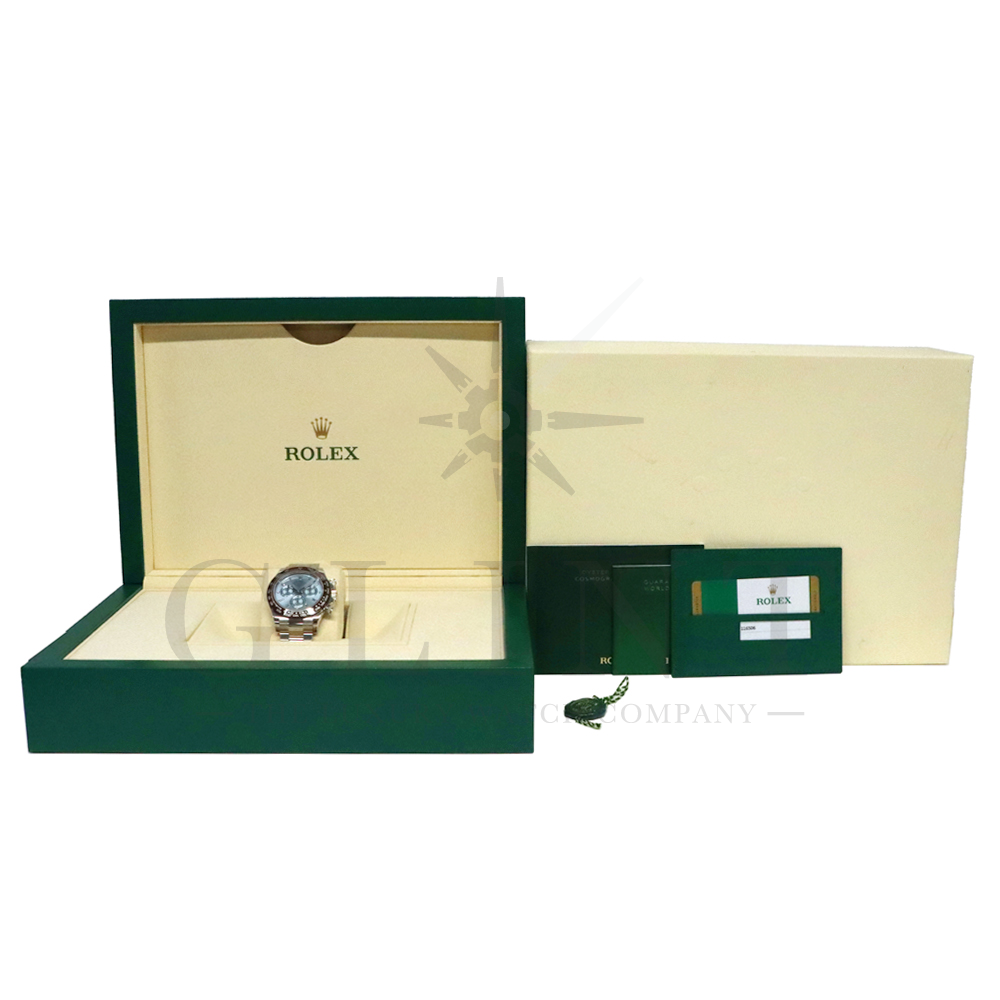 ロレックス デイトナ アイスブルー11Pダイヤモデルです。デイトナ生誕50周年を記念して登場したデイトナ史上初となるプラチナ仕様のモデル。こちらのRef.116506Aはアイスブルーダイアルのインデックスにバゲットダイヤモンドが8石、ラウンドブリリアントカットのダイヤモンドが3石セッティングされております。従来のインダイヤルはチェスナットブラウンカラーの外周でしたが、こちらのインダイヤルはダイヤルカラーと同じくアイスブルーとなっており、より高級感を感じさせてくれる仕上がりです。サンレイ仕上げの文字盤がより美しくアイスブルーを表現してくれます。ロレックス独自の強靭なセラミック素材となるセラクロムベゼルに使用されたチェスナットブラウンカラーとの相性は絶妙で、一目で特別なモデルと感じさせてくれるでしょう。数ある種類のデイトナの中でも圧倒的なステータスを与えてくれる至極の一本です。