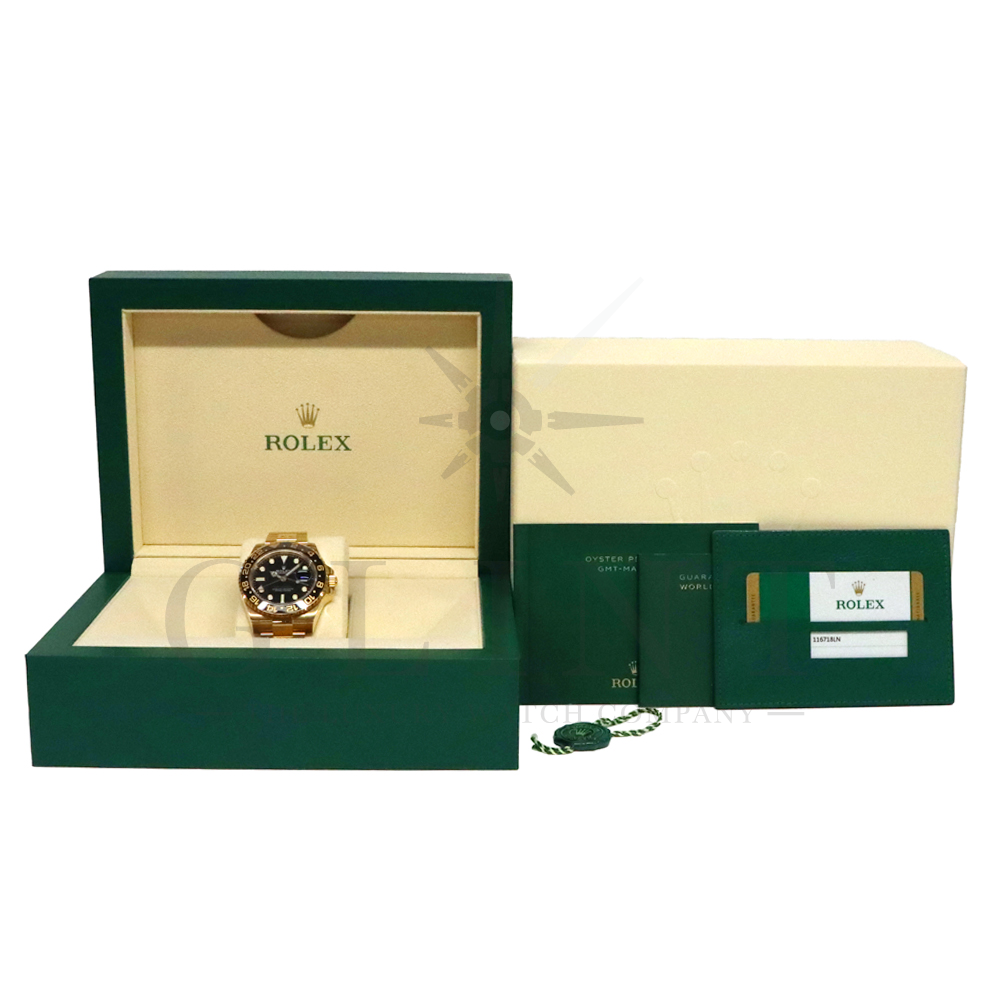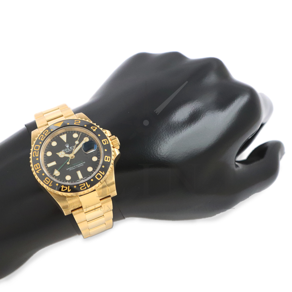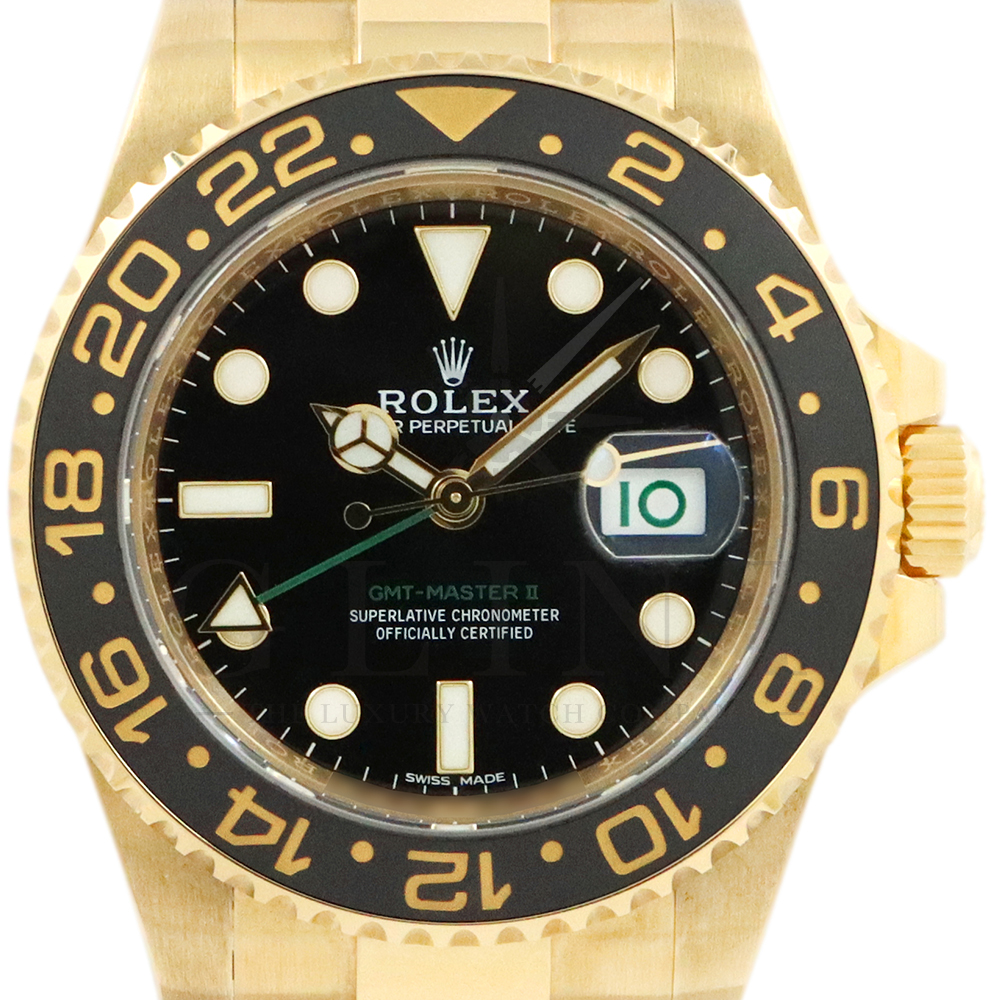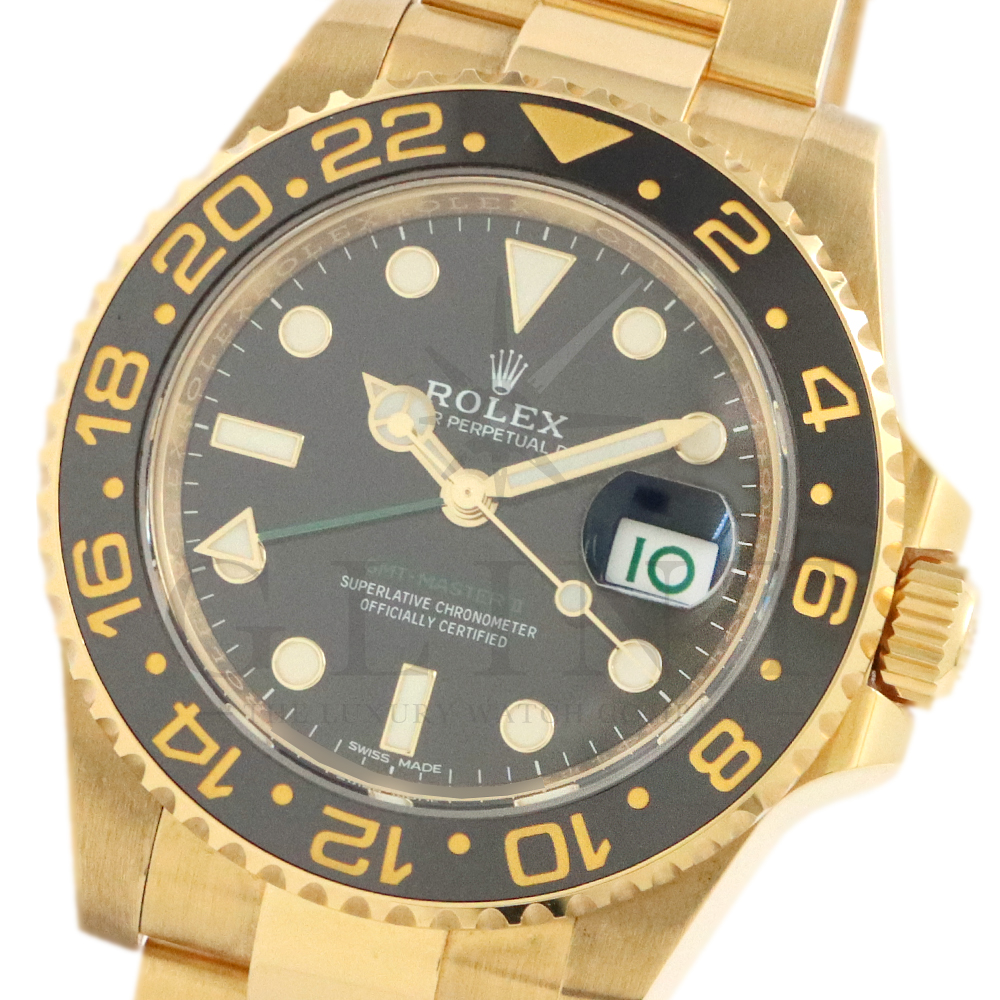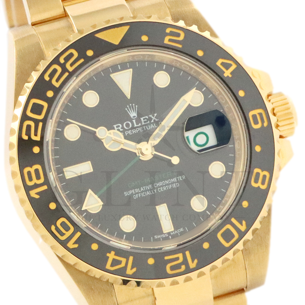 こちらはロレックス GMTマスター2 116718LNです。素材に18Kイエローゴールドを、文字盤にはブラックを採用。ケース素材と文字盤カラーの抜群の相性により、見事なまでの高級感を堪能させてくれます。搭載されているロレックスが独自に開発・製造したCal.3186は、衝撃と温度変化に対して優れた耐久性を発揮するパラクロム・ヘアスプリングを装備し、並外れた信頼性を実現しています。ワンランク上のGMTマスターIIをお楽しみになりたい方にオススメの一本です。