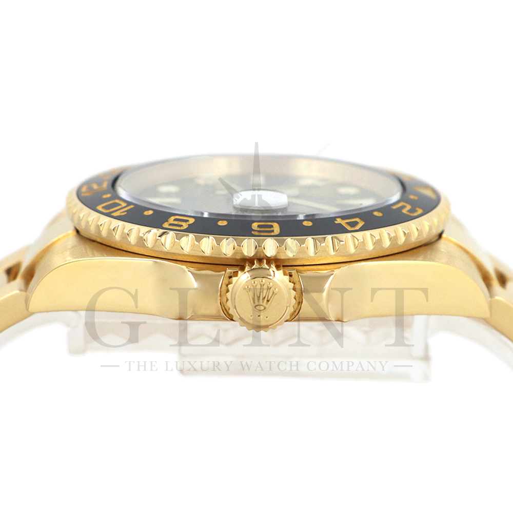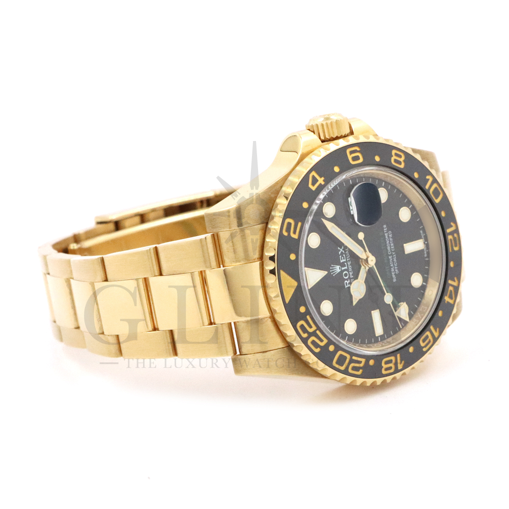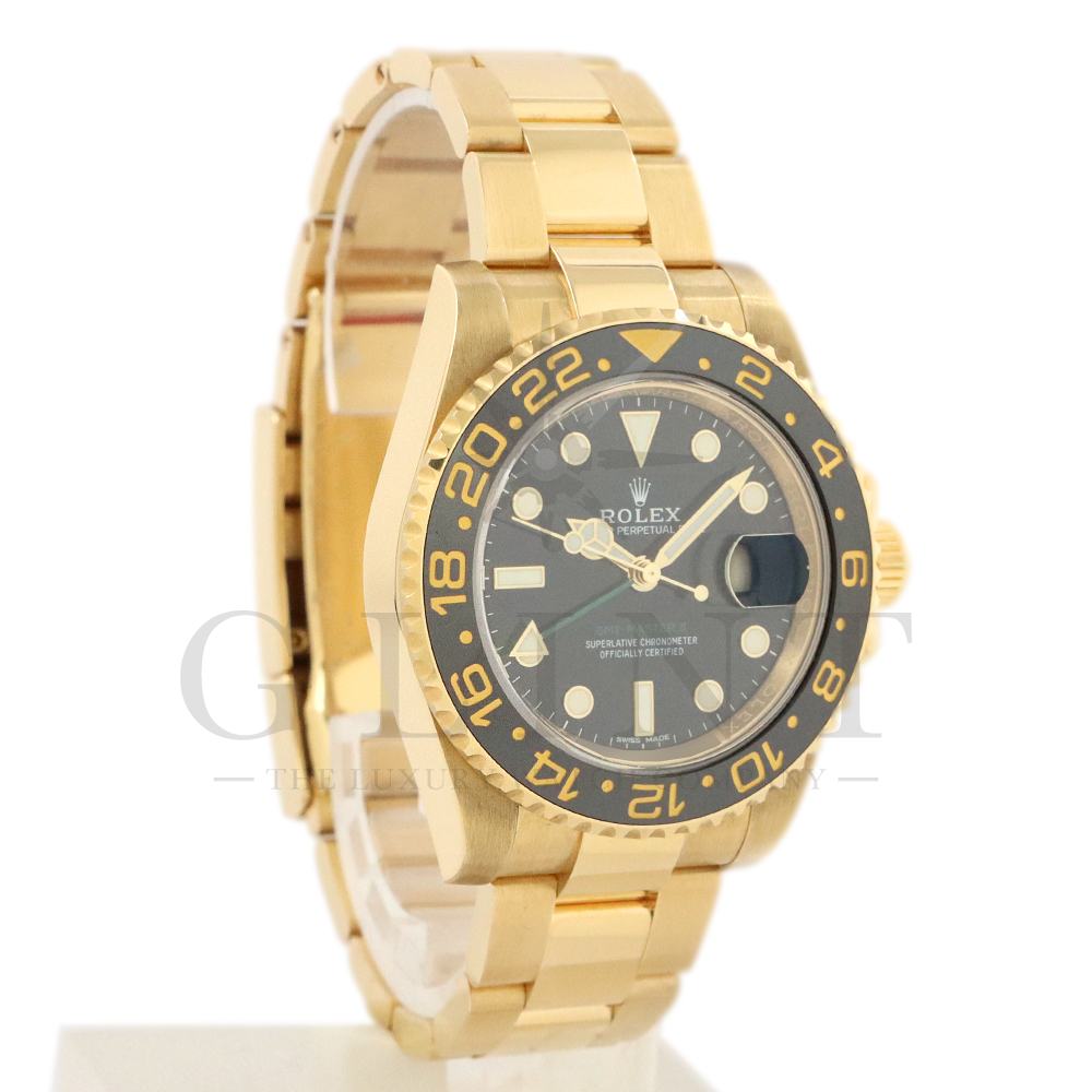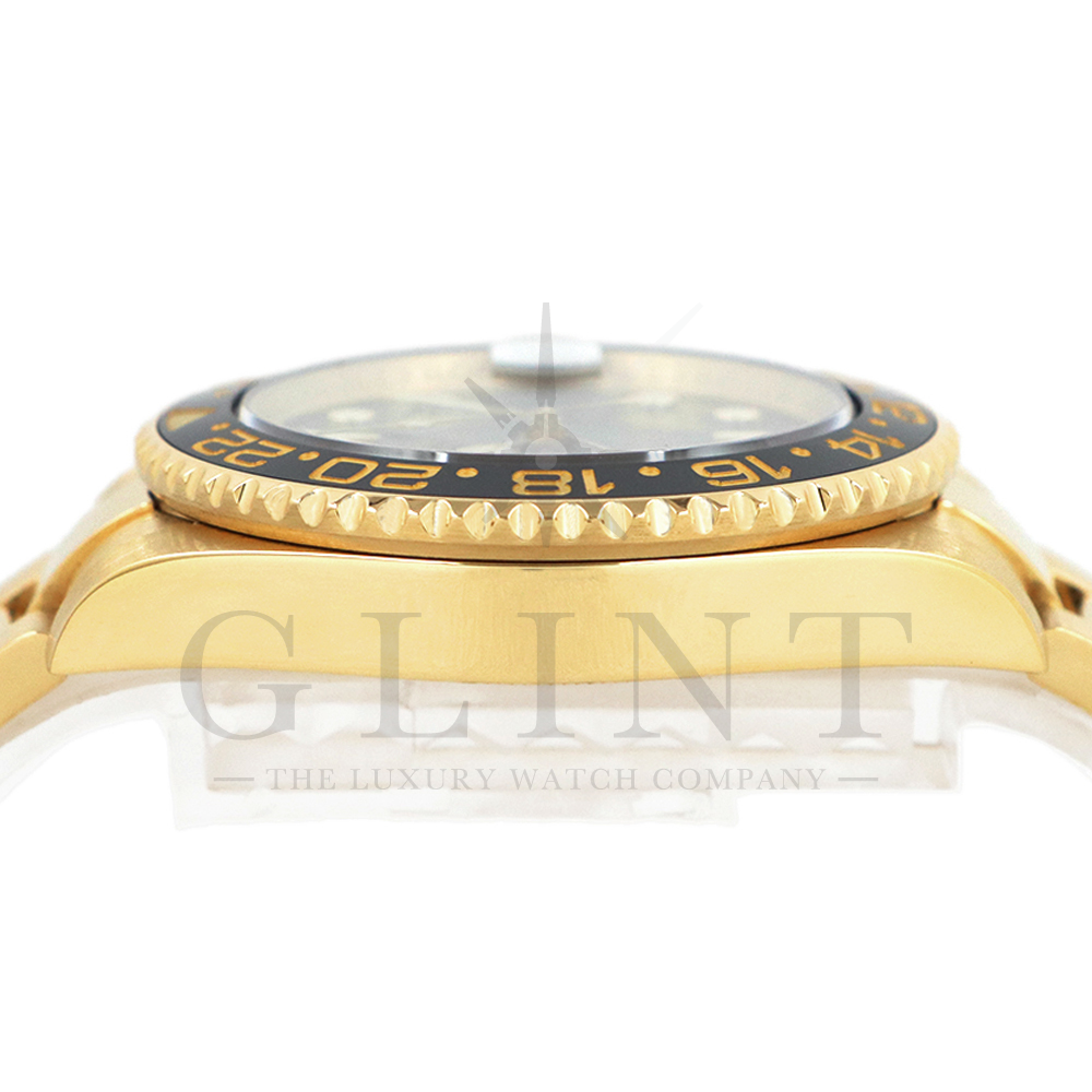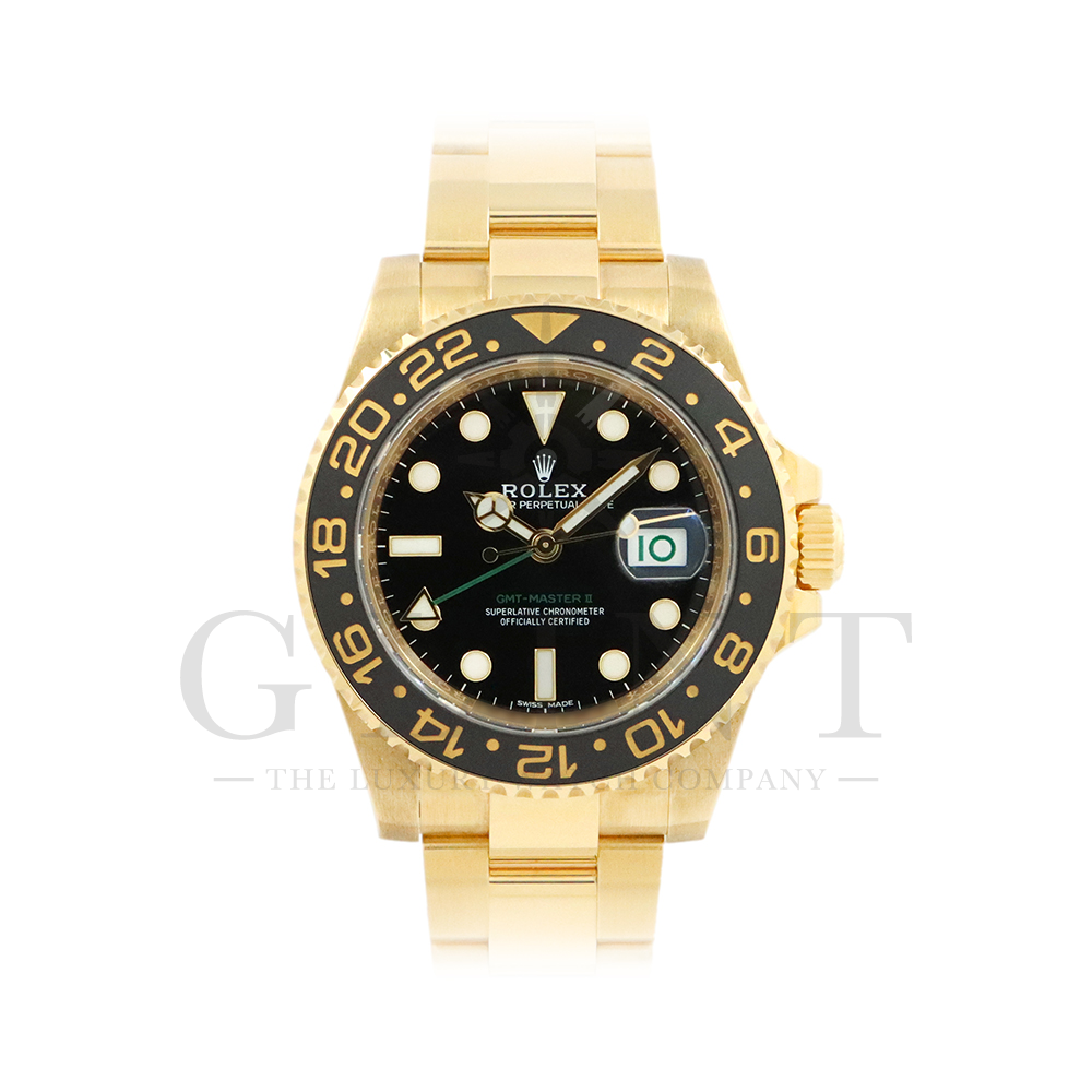 こちらはロレックス GMTマスター2 116718LNです。素材に18Kイエローゴールドを、文字盤にはブラックを採用。ケース素材と文字盤カラーの抜群の相性により、見事なまでの高級感を堪能させてくれます。搭載されているロレックスが独自に開発・製造したCal.3186は、衝撃と温度変化に対して優れた耐久性を発揮するパラクロム・ヘアスプリングを装備し、並外れた信頼性を実現しています。ワンランク上のGMTマスターIIをお楽しみになりたい方にオススメの一本です。
