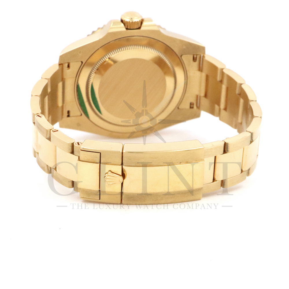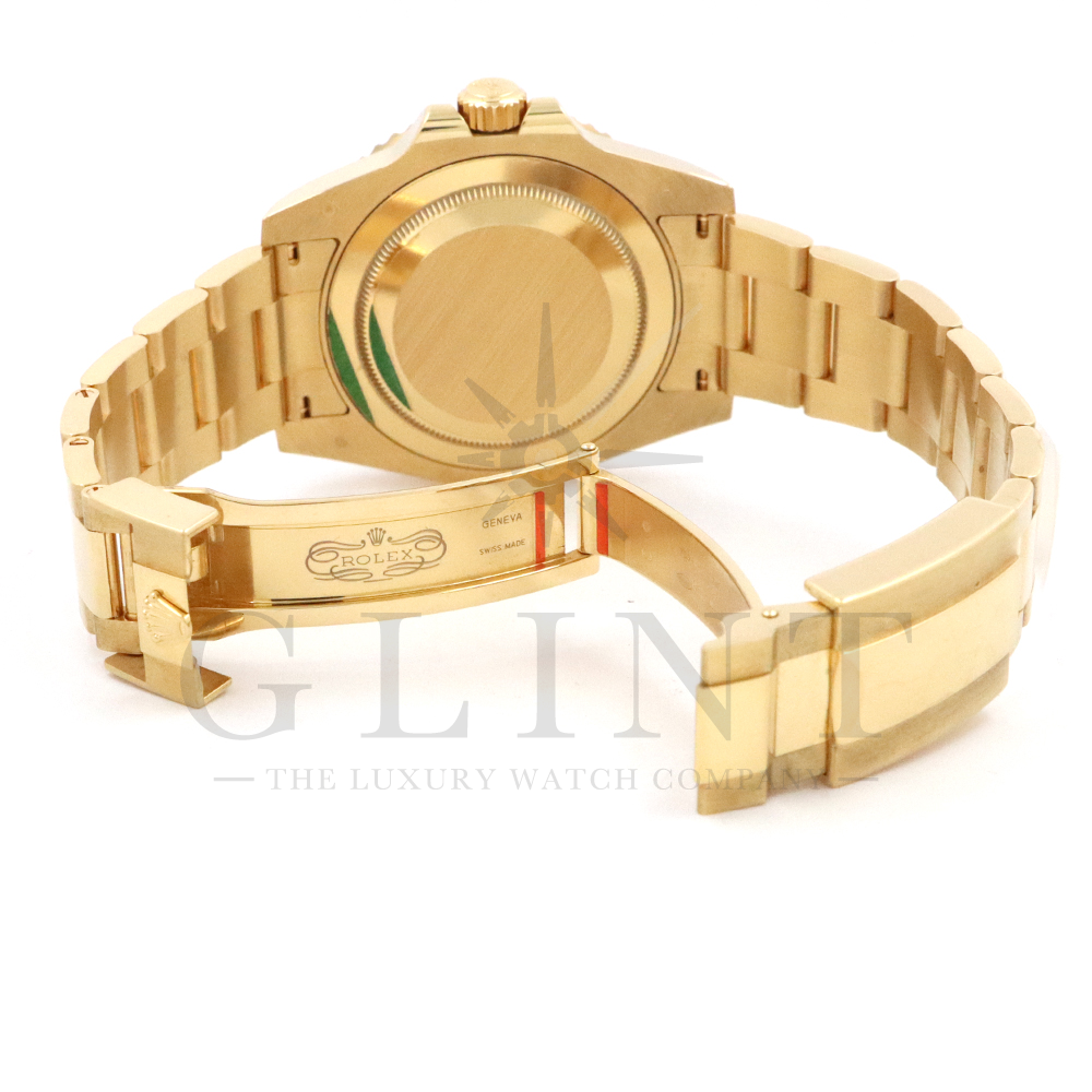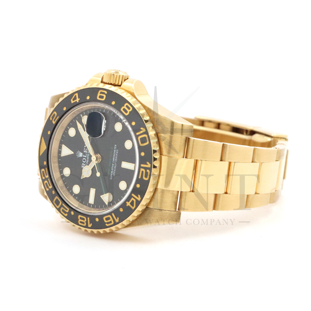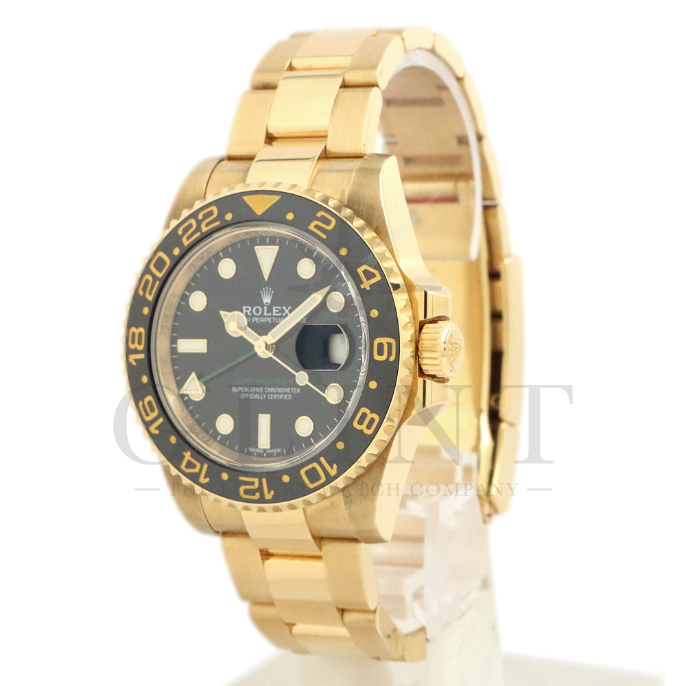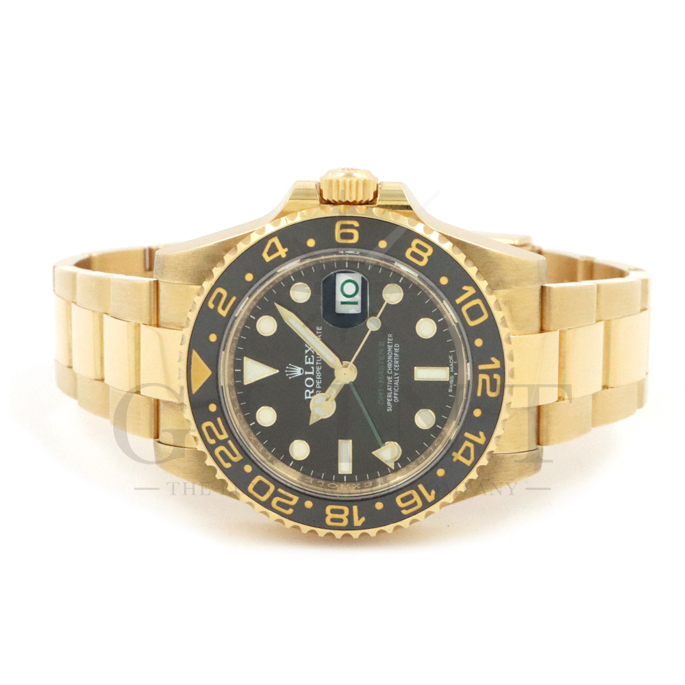 こちらはロレックス GMTマスター2 116718LNです。素材に18Kイエローゴールドを、文字盤にはブラックを採用。ケース素材と文字盤カラーの抜群の相性により、見事なまでの高級感を堪能させてくれます。搭載されているロレックスが独自に開発・製造したCal.3186は、衝撃と温度変化に対して優れた耐久性を発揮するパラクロム・ヘアスプリングを装備し、並外れた信頼性を実現しています。ワンランク上のGMTマスターIIをお楽しみになりたい方にオススメの一本です。
