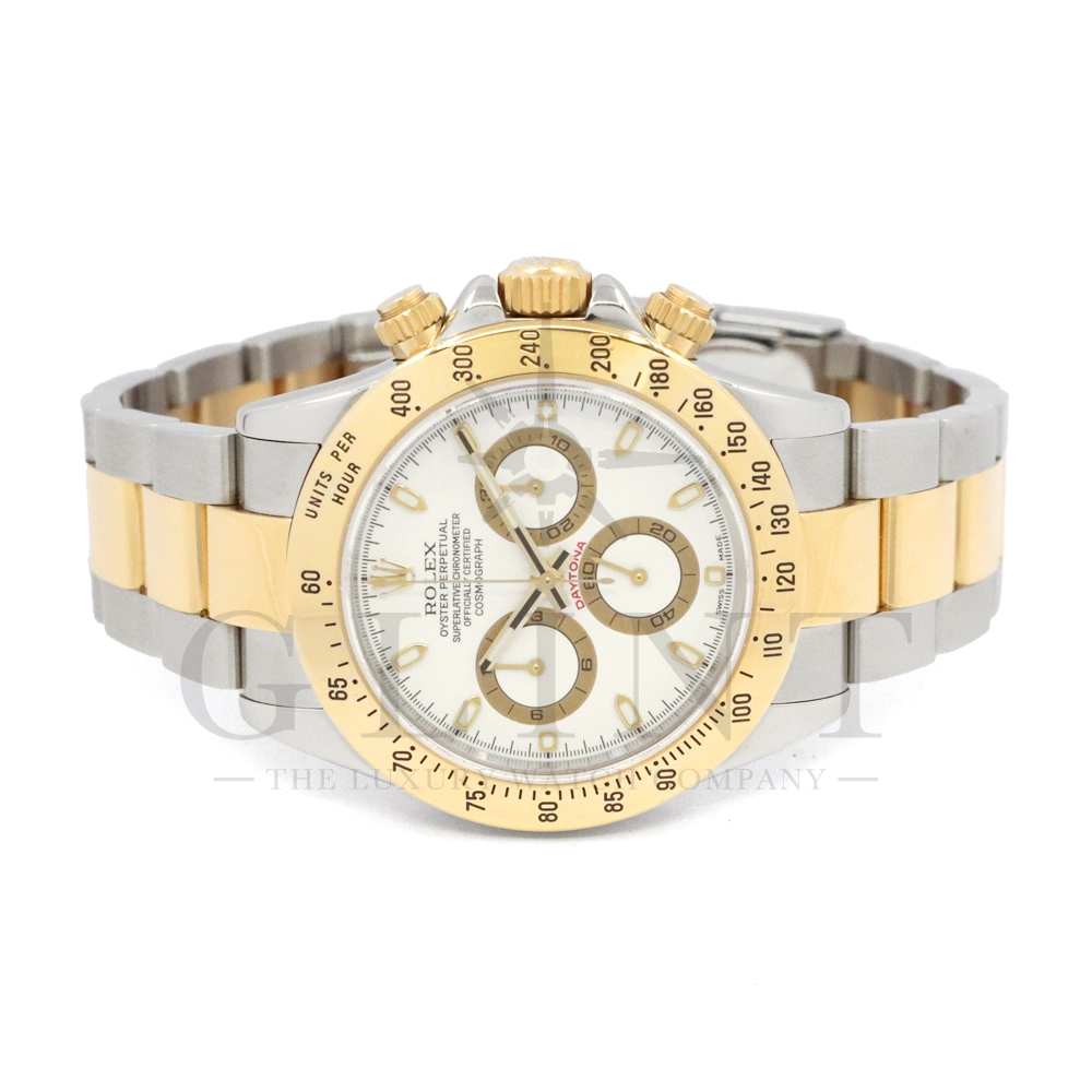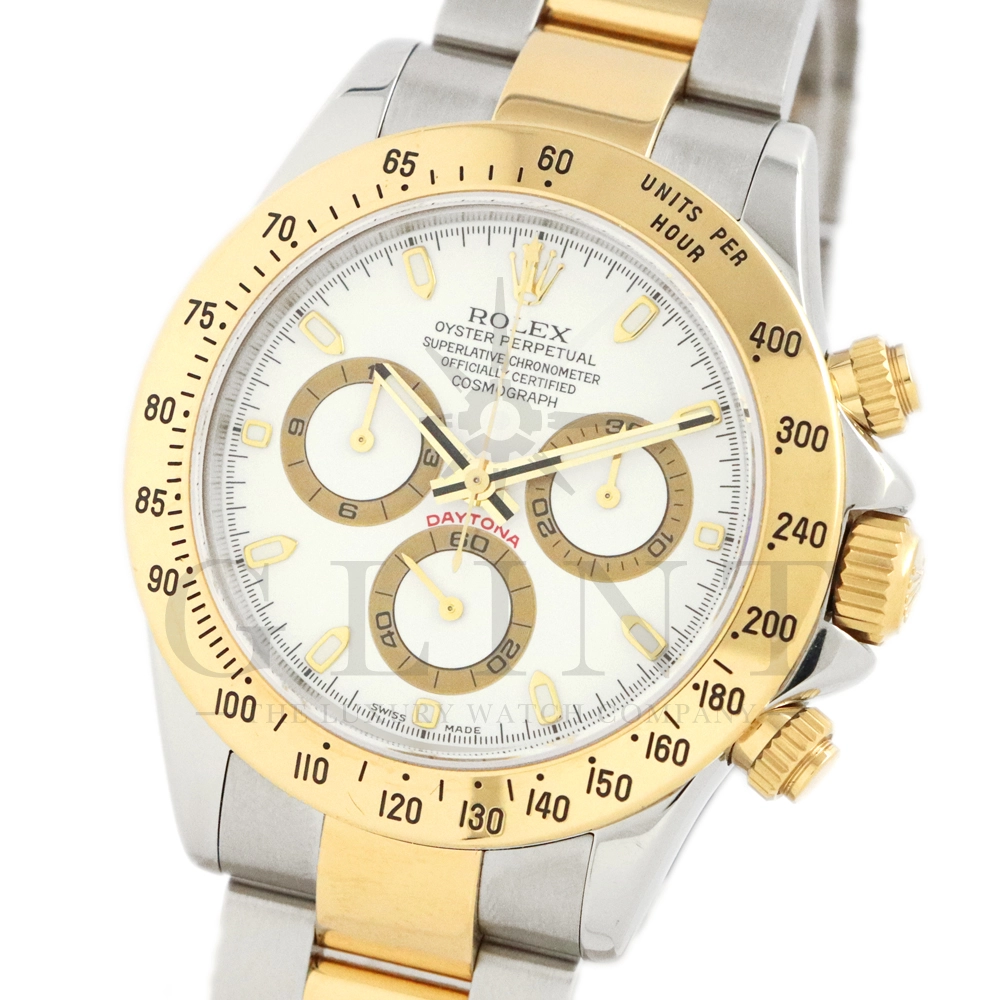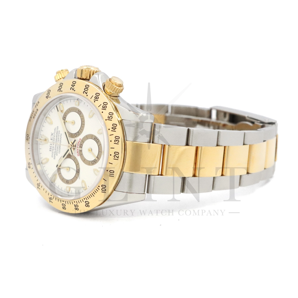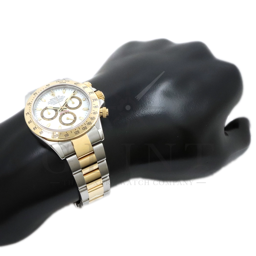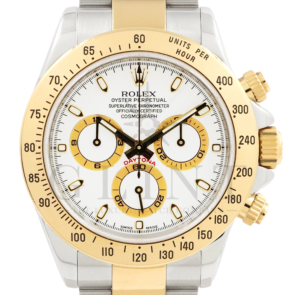 こちらはロレックス コスモグラフ デイトナ Ref.116523です。ステンレススチールと18Kイエローゴールドのコンビネーション(ロレゾール)ケースに、爽やかなホワイトダイヤルを組み合わせたモデル。シンプルでありながら視認性に優れた文字盤は、カジュアルからフォーマルまで幅広い装いにマッチします。ロレックス自社製キャリバー Cal.4130 を搭載し、約72時間のパワーリザーブを備えた高精度ムーブメントにより、正確な時刻とスポーツ計測を両立。コンビモデルならではの華やかさを持ちながらも、スポーツウォッチとしての実用性を損なわない、ロレックスらしいバランスの良いデザインです。