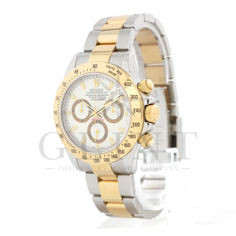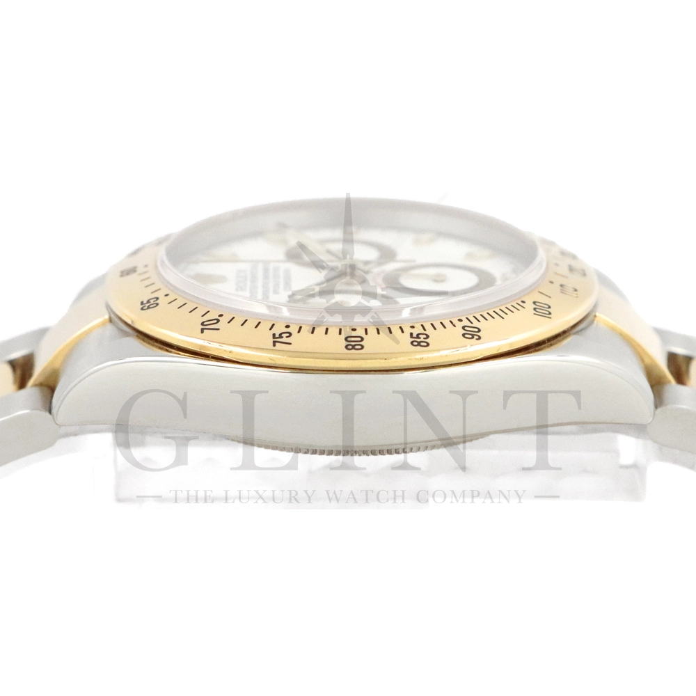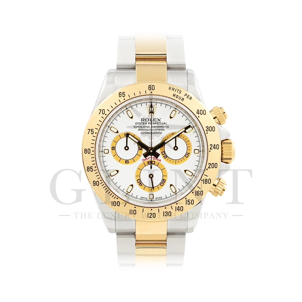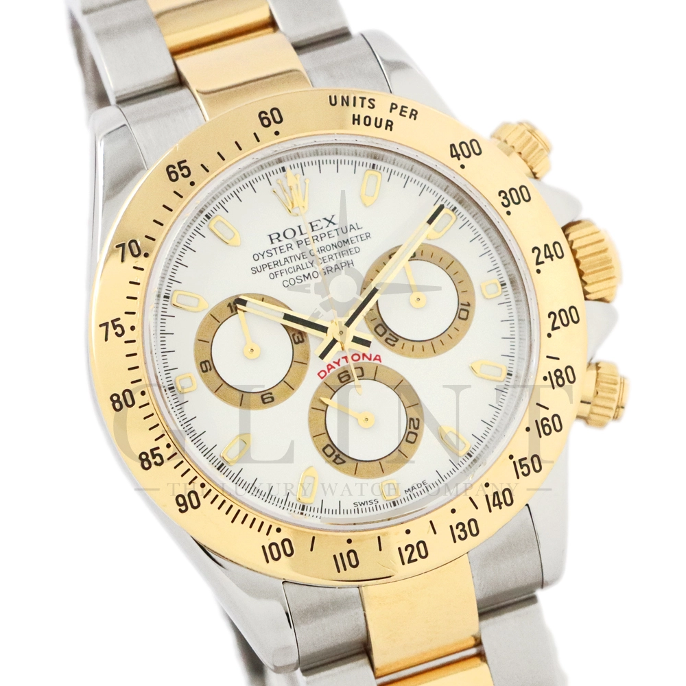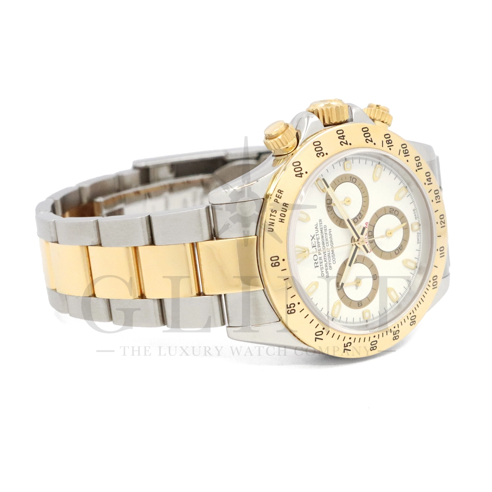こちらはロレックス コスモグラフ デイトナ Ref.116523です。ステンレススチールと18Kイエローゴールドのコンビネーション(ロレゾール)ケースに、爽やかなホワイトダイヤルを組み合わせたモデル。シンプルでありながら視認性に優れた文字盤は、カジュアルからフォーマルまで幅広い装いにマッチします。ロレックス自社製キャリバー Cal.4130 を搭載し、約72時間のパワーリザーブを備えた高精度ムーブメントにより、正確な時刻とスポーツ計測を両立。コンビモデルならではの華やかさを持ちながらも、スポーツウォッチとしての実用性を損なわない、ロレックスらしいバランスの良いデザインです。