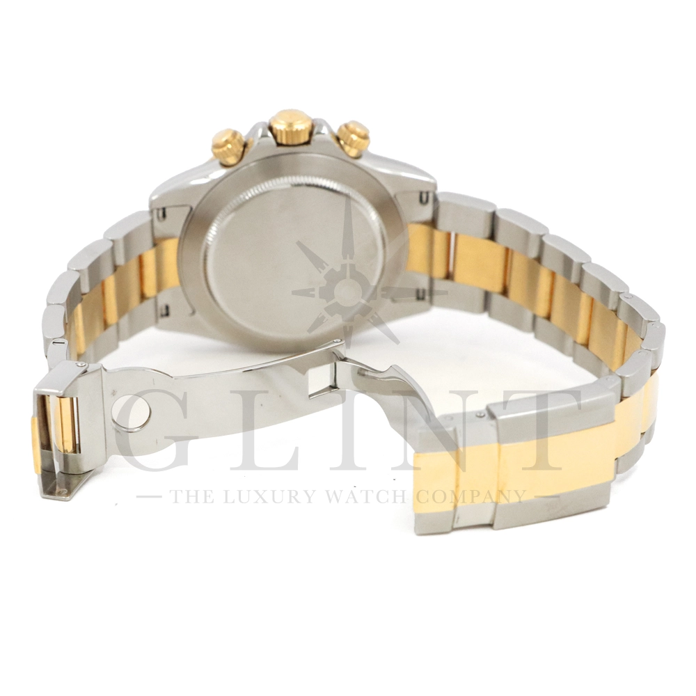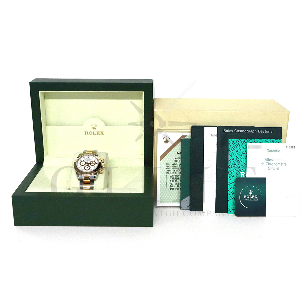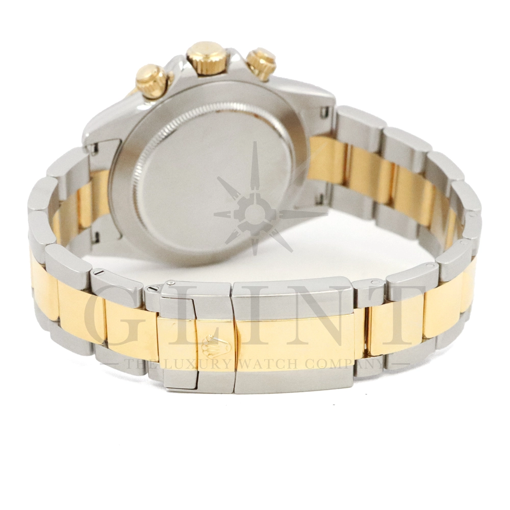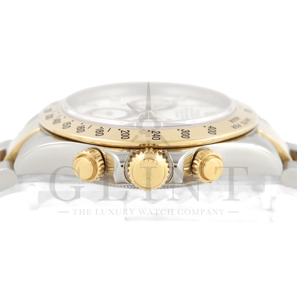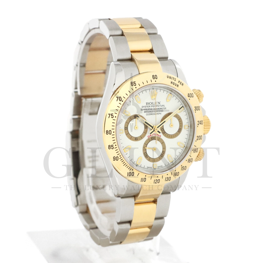 こちらはロレックス コスモグラフ デイトナ Ref.116523です。ステンレススチールと18Kイエローゴールドのコンビネーション(ロレゾール)ケースに、爽やかなホワイトダイヤルを組み合わせたモデル。シンプルでありながら視認性に優れた文字盤は、カジュアルからフォーマルまで幅広い装いにマッチします。ロレックス自社製キャリバー Cal.4130 を搭載し、約72時間のパワーリザーブを備えた高精度ムーブメントにより、正確な時刻とスポーツ計測を両立。コンビモデルならではの華やかさを持ちながらも、スポーツウォッチとしての実用性を損なわない、ロレックスらしいバランスの良いデザインです。