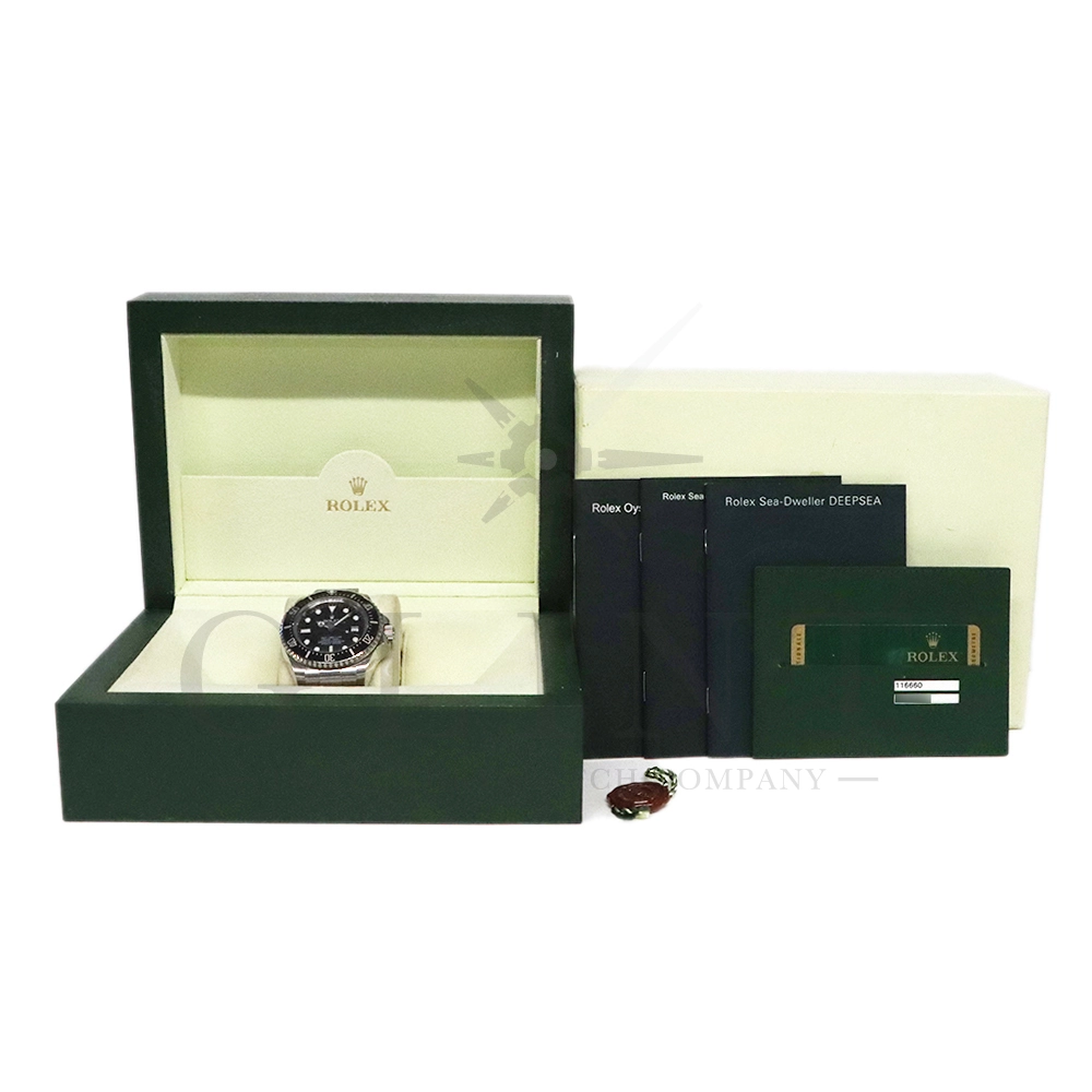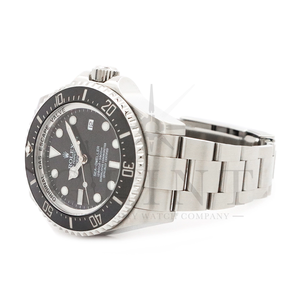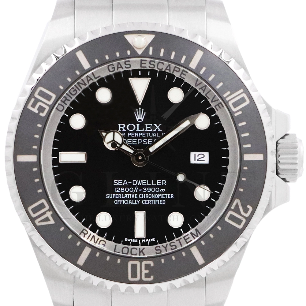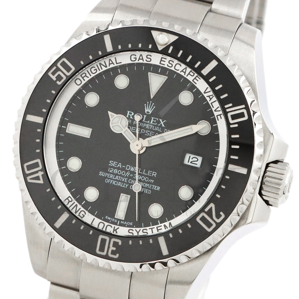 こちらはロレックス シードゥエラー ディープシーです。2008年に深海用に設計されたプロユース ダイバーズウォッチ。ヘリウム排出バルブや革新的なケース構造となるリングロックシステムによる並外れた強度、防水性能、耐水圧性能で防水性3900mを実現しており、量産型の機械式時計の中では最高の防水性能を誇ります。そしてロレックス史上最高のブレスレットと称される、グライドロックバックルとフリップロックエクステンションリンクの二つで構成される画期的なシステムで簡単に長さを調整することを可能とし実用性も抜群。ロレックスの最先端テクノロジーが凝縮された最高のクオリティを誇る本格的なダイバーズウォッチです。