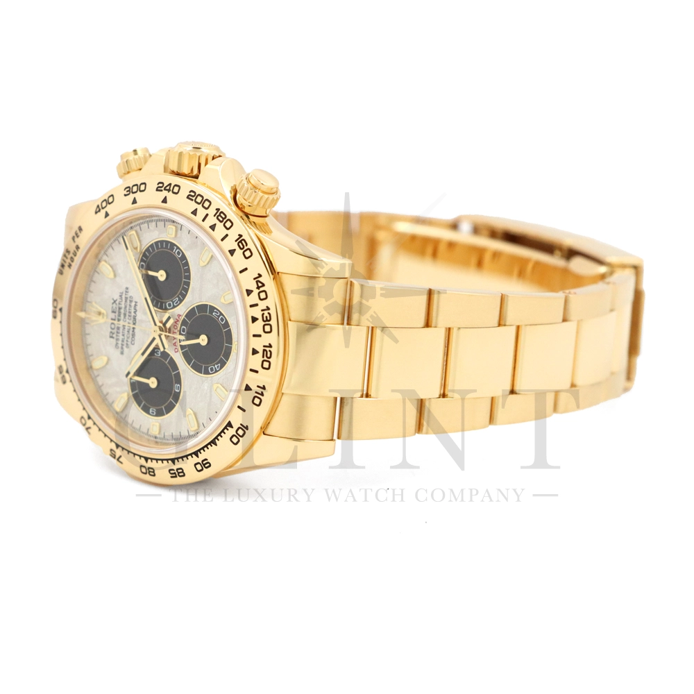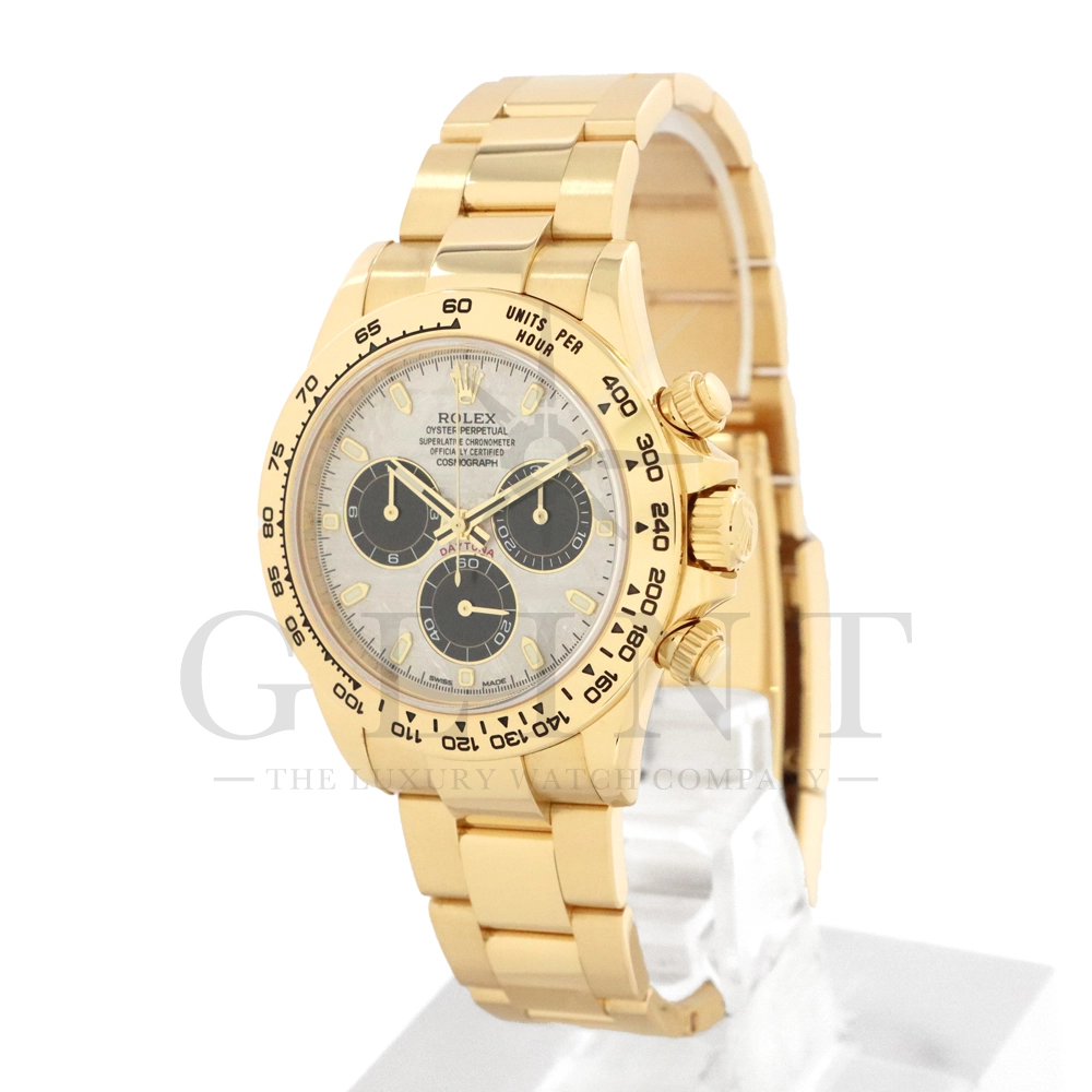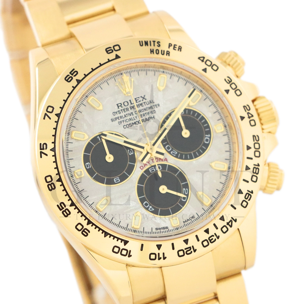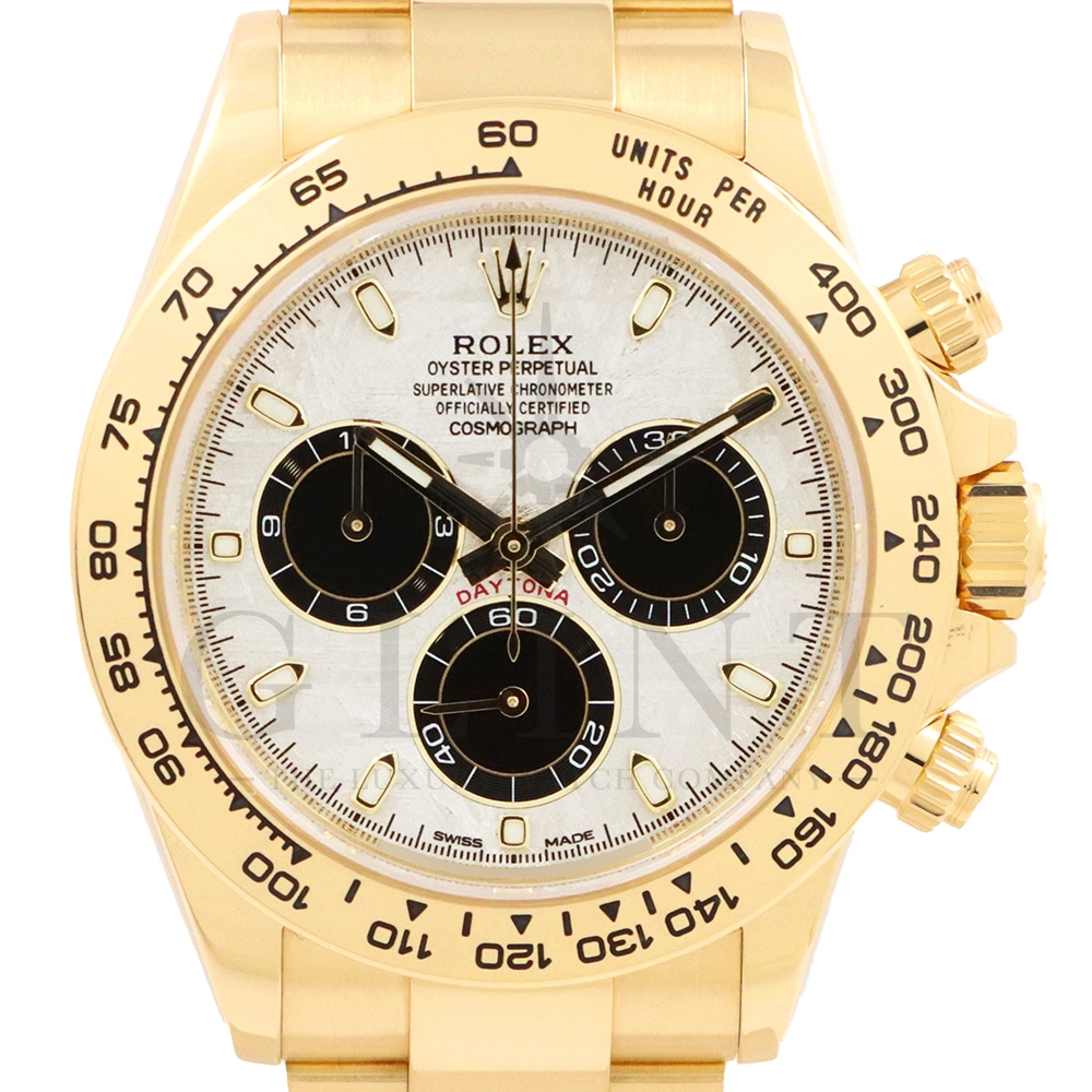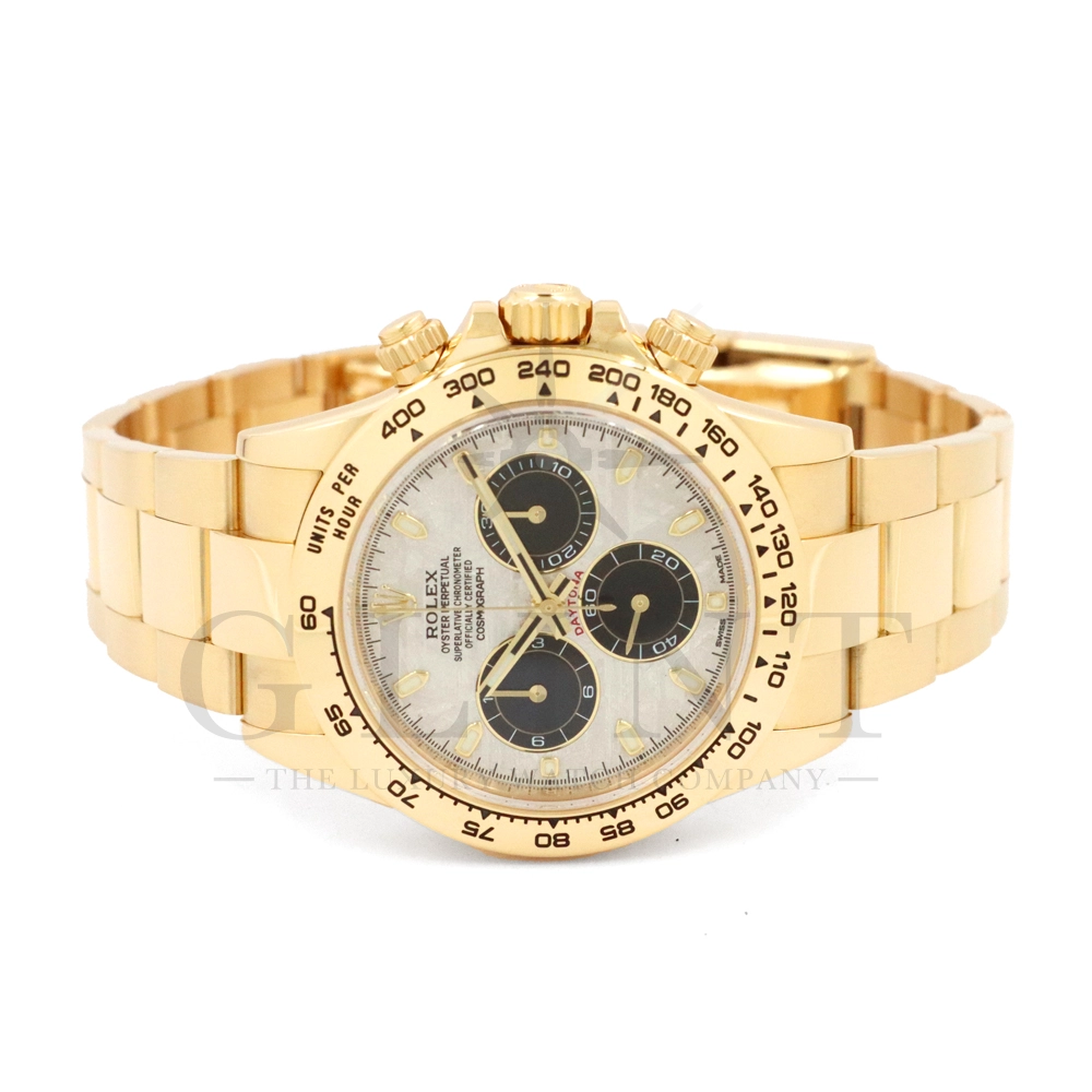 こちらはロレックス デイトナ 116508です。2021年の新作として登場したメテオライト、イエローゴールドモデル。こちらのダイヤルには数百~数十億年も前に爆発した小惑星が隕石となり、地球に飛来した物質を採用しております。惑星間を旅しながら、数百年ごとに摂氏数度ずつ冷やされて形成されるこの素材は、主に鉄とニッケルから成り、地球上では再現不可能な結晶構造。そしてこの大きな塊を薄片に切り分け、化学処理を施すことで独特な内部構造が姿を表し、こうして形成された模様は「ウィドマンシュテッテン構造」と呼ばれ、唯一無二の質感を表現してくれます。ブラックのサブダイヤルとの相性は見事で独特な高級感を感じさせてくれるでしょう。ラグジュアリースポーツウォッチと呼ぶにふさわしい風格を備えている極上の逸品です。