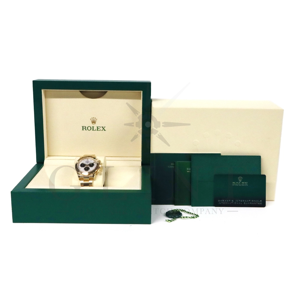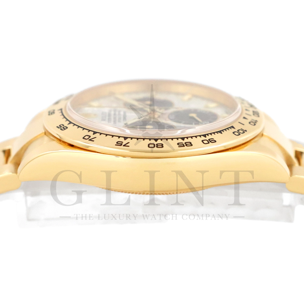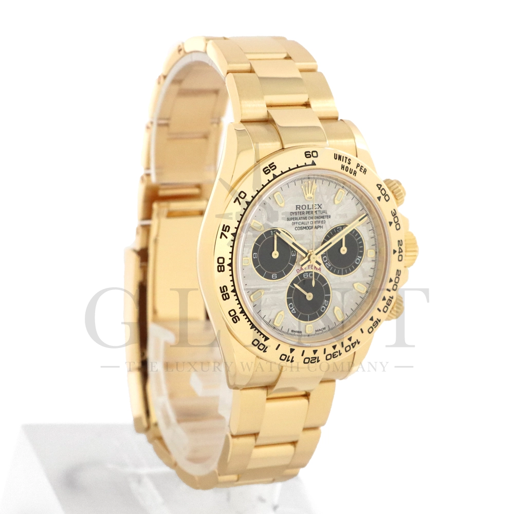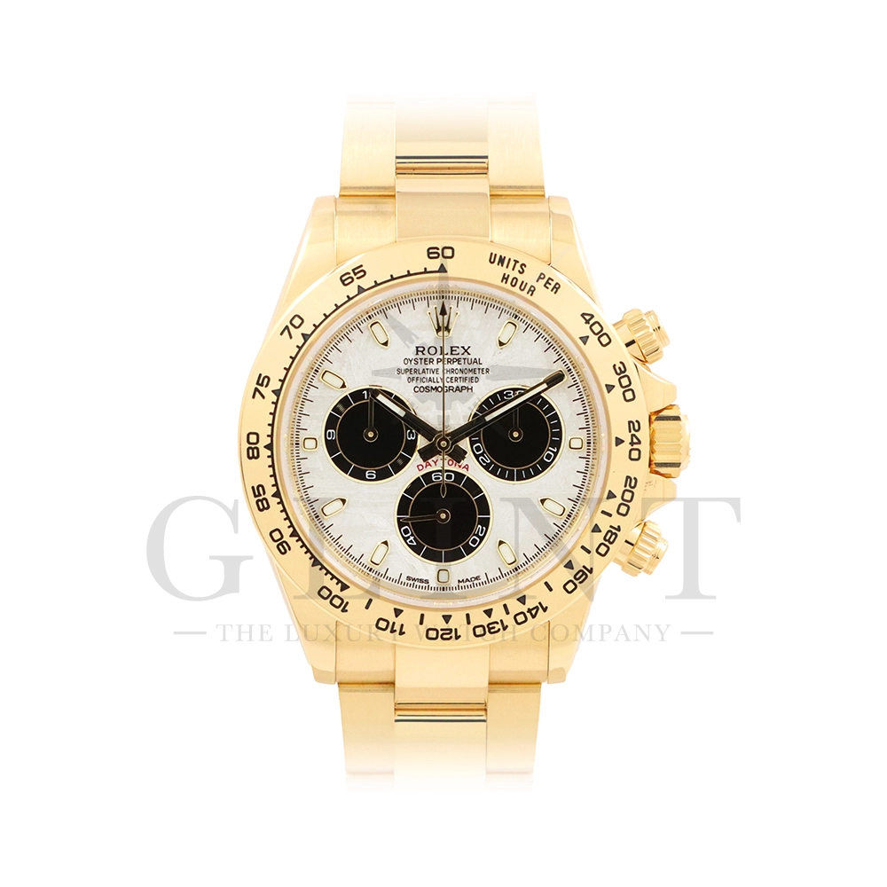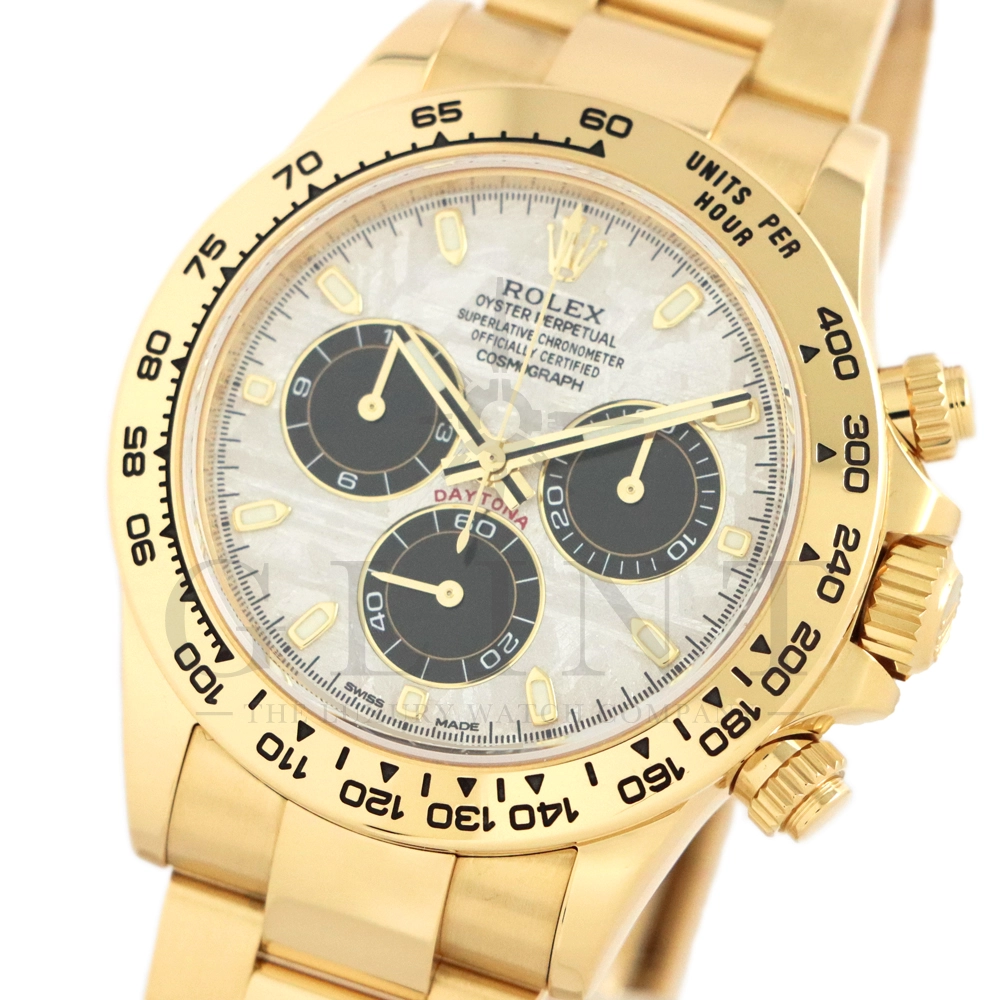 こちらはロレックス デイトナ 116508です。2021年の新作として登場したメテオライト、イエローゴールドモデル。こちらのダイヤルには数百~数十億年も前に爆発した小惑星が隕石となり、地球に飛来した物質を採用しております。惑星間を旅しながら、数百年ごとに摂氏数度ずつ冷やされて形成されるこの素材は、主に鉄とニッケルから成り、地球上では再現不可能な結晶構造。そしてこの大きな塊を薄片に切り分け、化学処理を施すことで独特な内部構造が姿を表し、こうして形成された模様は「ウィドマンシュテッテン構造」と呼ばれ、唯一無二の質感を表現してくれます。ブラックのサブダイヤルとの相性は見事で独特な高級感を感じさせてくれるでしょう。ラグジュアリースポーツウォッチと呼ぶにふさわしい風格を備えている極上の逸品です。