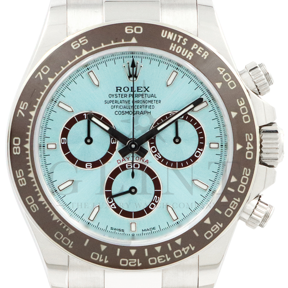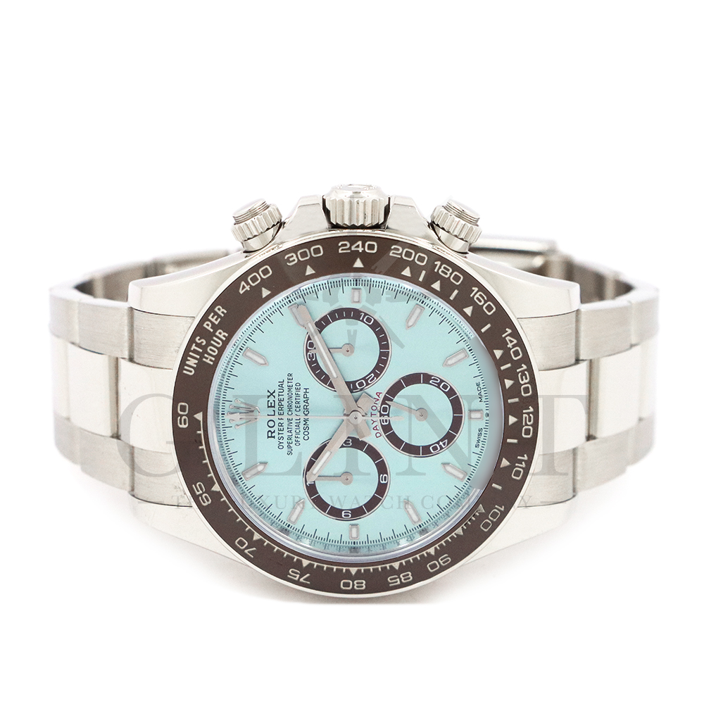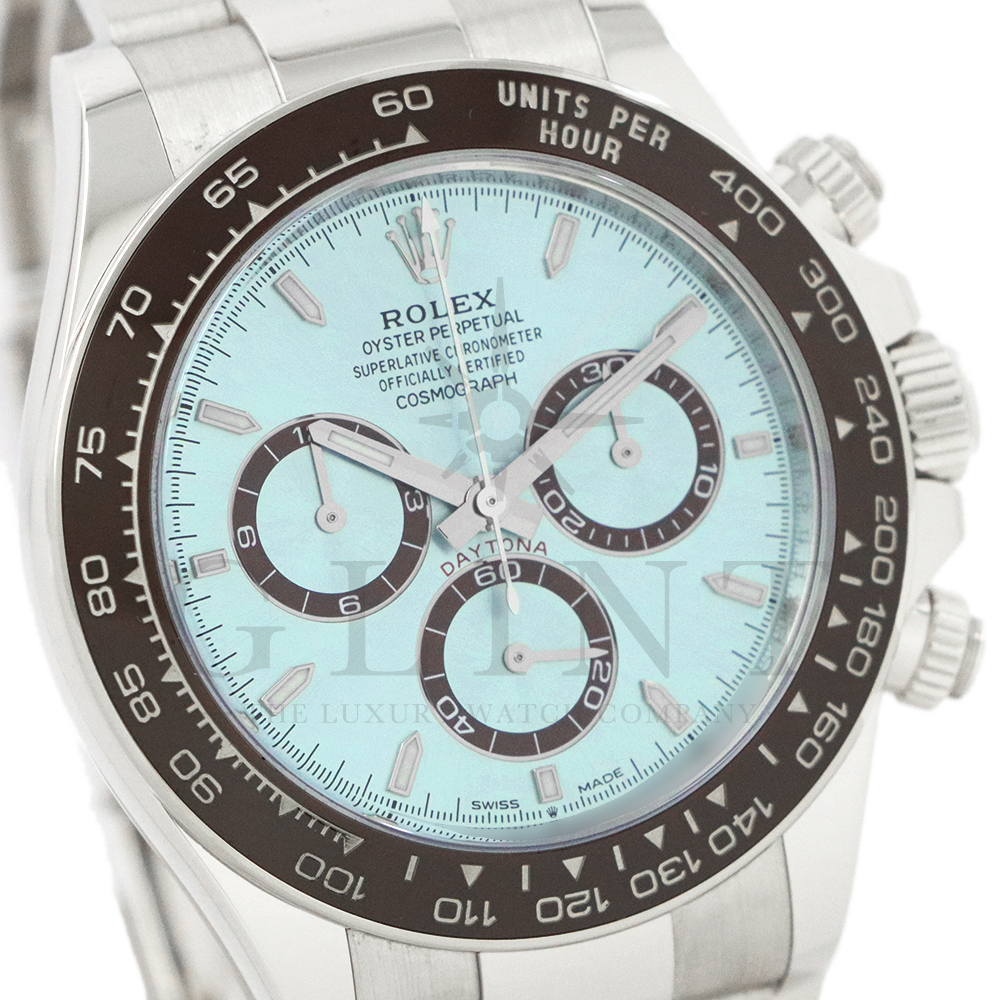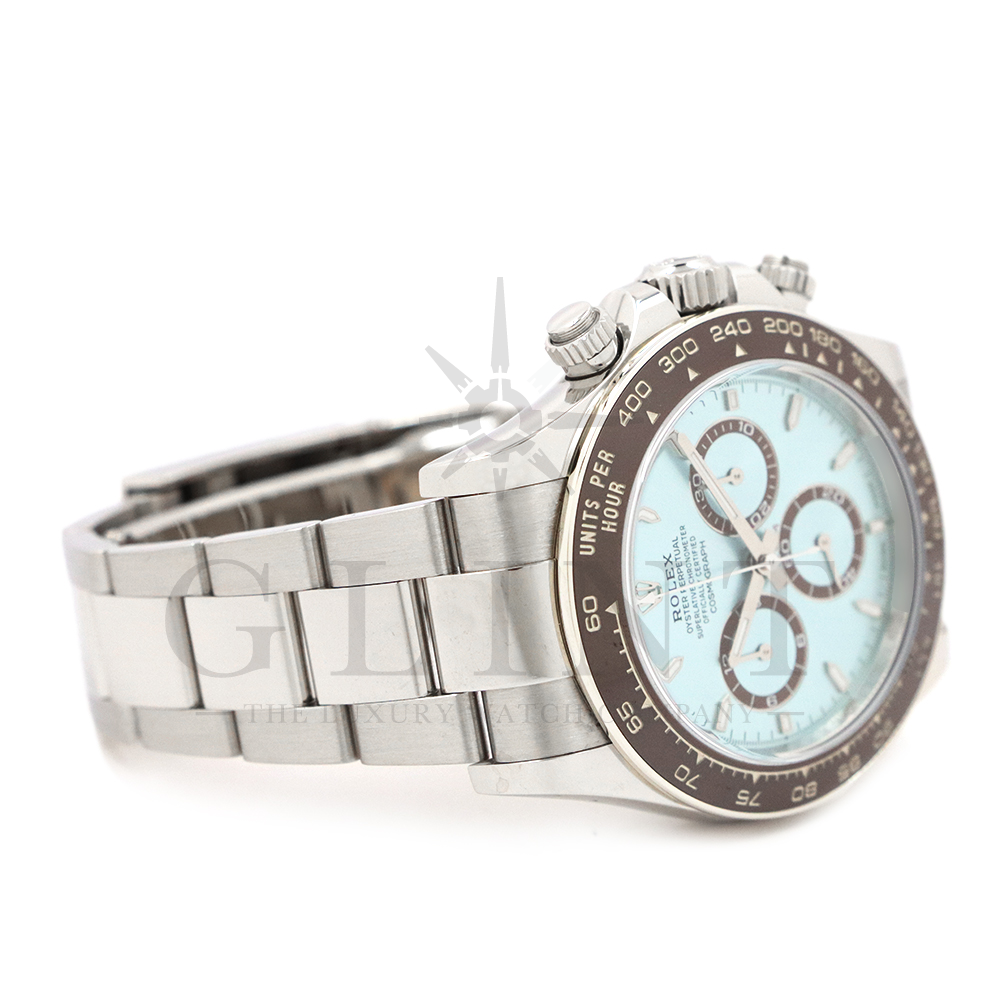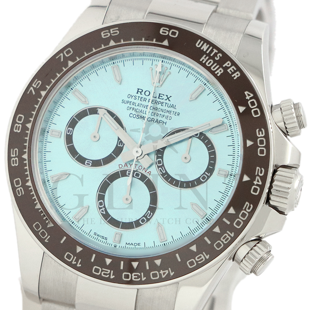 こちらはロレックス デイトナ プラチナモデルです。コスモグラフ デイトナ誕生60周年を迎えた2023年に新モデルとして生まれ変わりました。ダイアルのアワーマーカーとカウンター目盛り等のグラフィックバランスが一新され、自社開発・製造の新ムーブメントCal.4131を搭載。エネルギーロスを低減するクロナジー エスケープメント、耐衝撃性に優れるパラフレックス ショック・アブソーバ等の革新技術が採用されております。コレクション全体がアップデートされた中、プラチナのアイスブルーはムーブメントのローターが18Kイエローゴールド製、かつオイスター パーペチュアルコレクションでは初となるトランスパレントケースバック仕様。ブリッジには独自のロレックス コート・ド・ジュネーブ装飾が施され、クローズドケースが標準仕様のロレックスではムーブメントを視認できるレアなモデルです。進化したアイスブルーは必ずや所有者を満足させることは間違いありません。