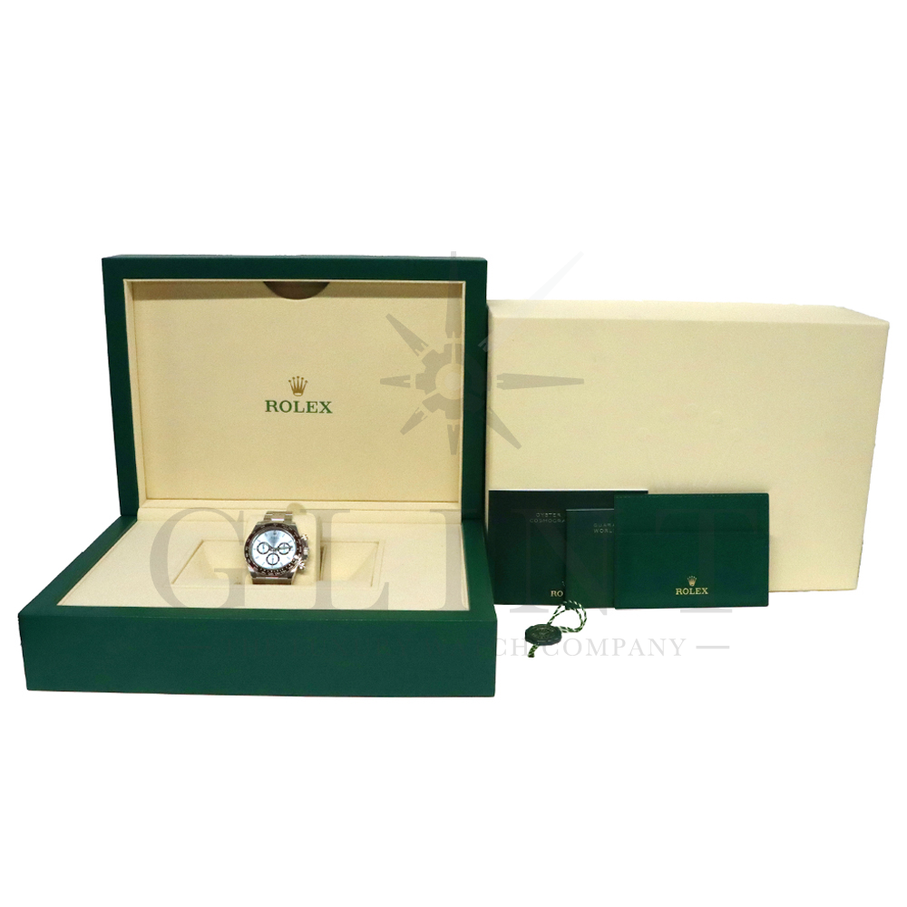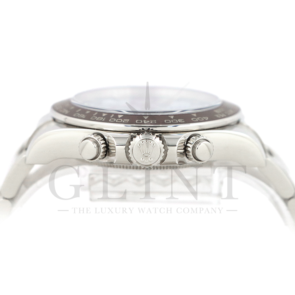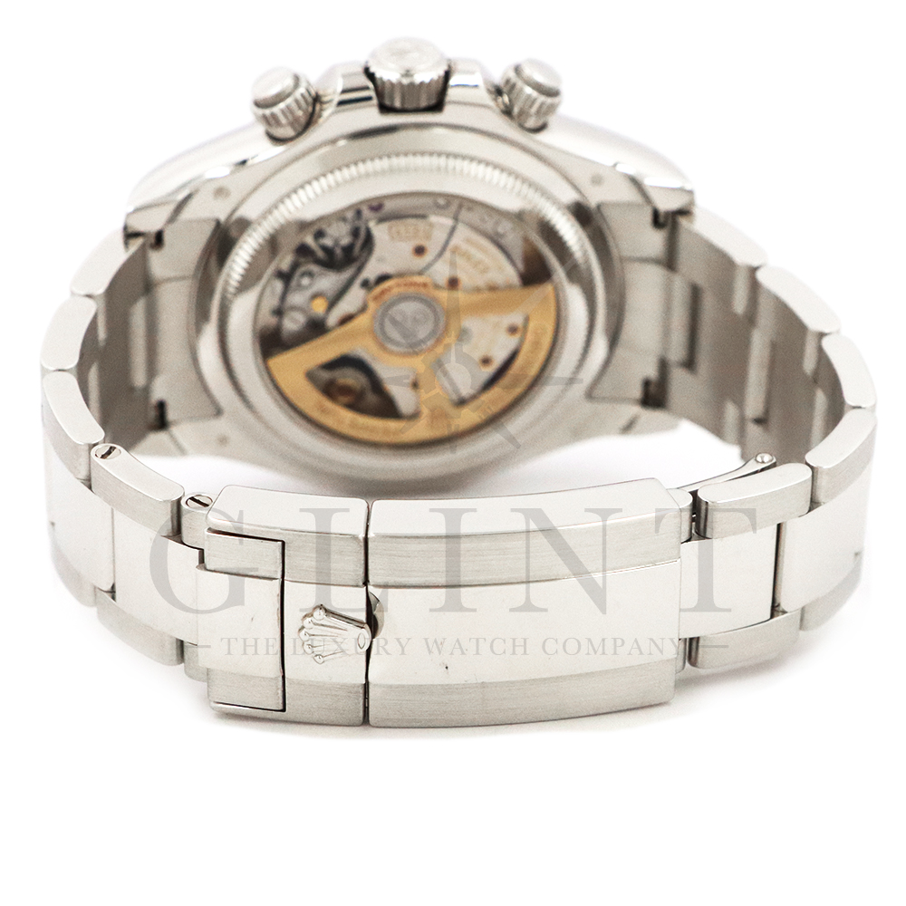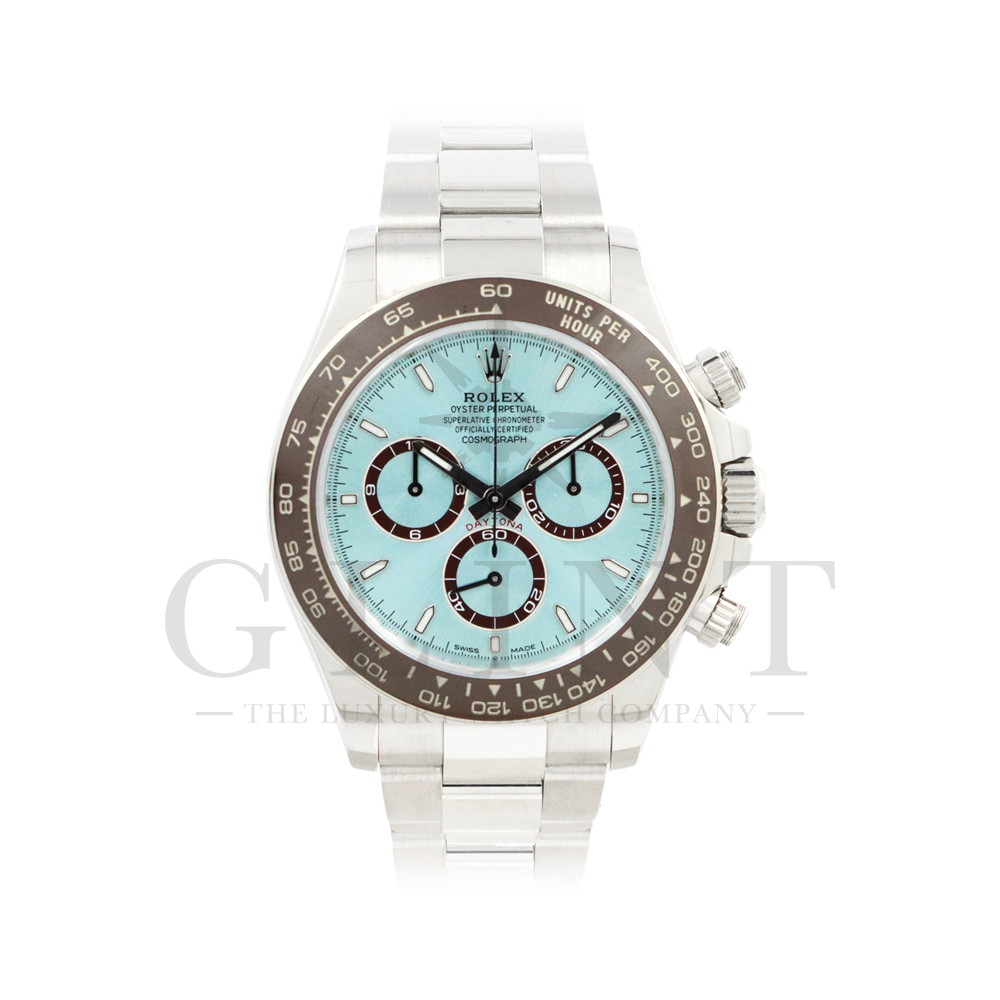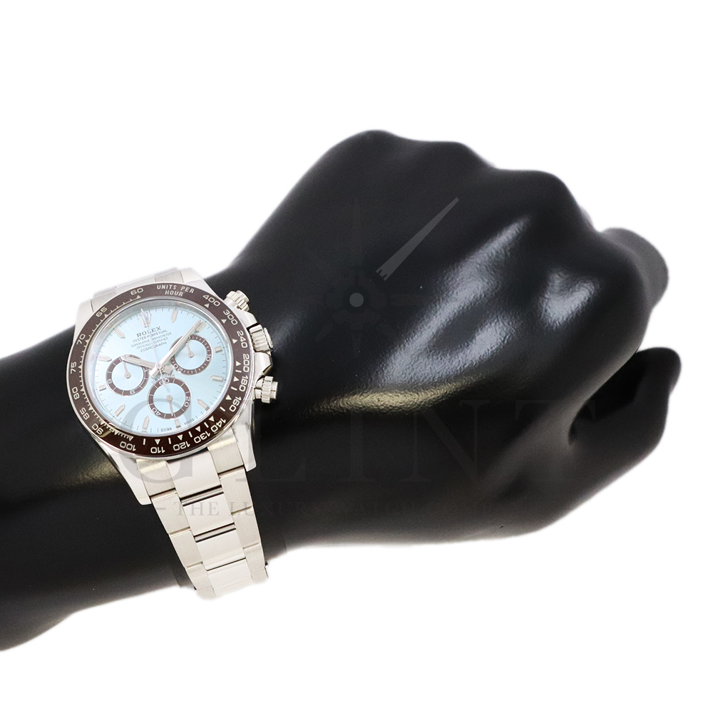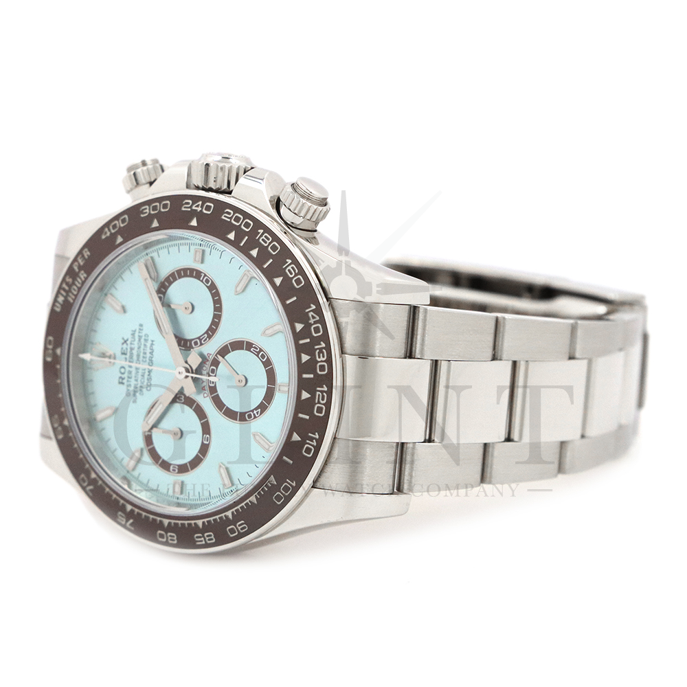 こちらはロレックス デイトナ プラチナモデルです。コスモグラフ デイトナ誕生60周年を迎えた2023年に新モデルとして生まれ変わりました。ダイアルのアワーマーカーとカウンター目盛り等のグラフィックバランスが一新され、自社開発・製造の新ムーブメントCal.4131を搭載。エネルギーロスを低減するクロナジー エスケープメント、耐衝撃性に優れるパラフレックス ショック・アブソーバ等の革新技術が採用されております。コレクション全体がアップデートされた中、プラチナのアイスブルーはムーブメントのローターが18Kイエローゴールド製、かつオイスター パーペチュアルコレクションでは初となるトランスパレントケースバック仕様。ブリッジには独自のロレックス コート・ド・ジュネーブ装飾が施され、クローズドケースが標準仕様のロレックスではムーブメントを視認できるレアなモデルです。進化したアイスブルーは必ずや所有者を満足させることは間違いありません。