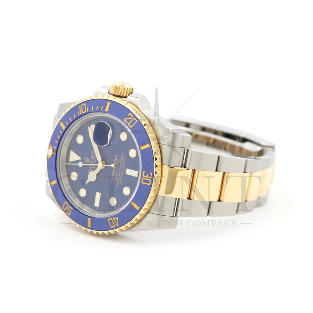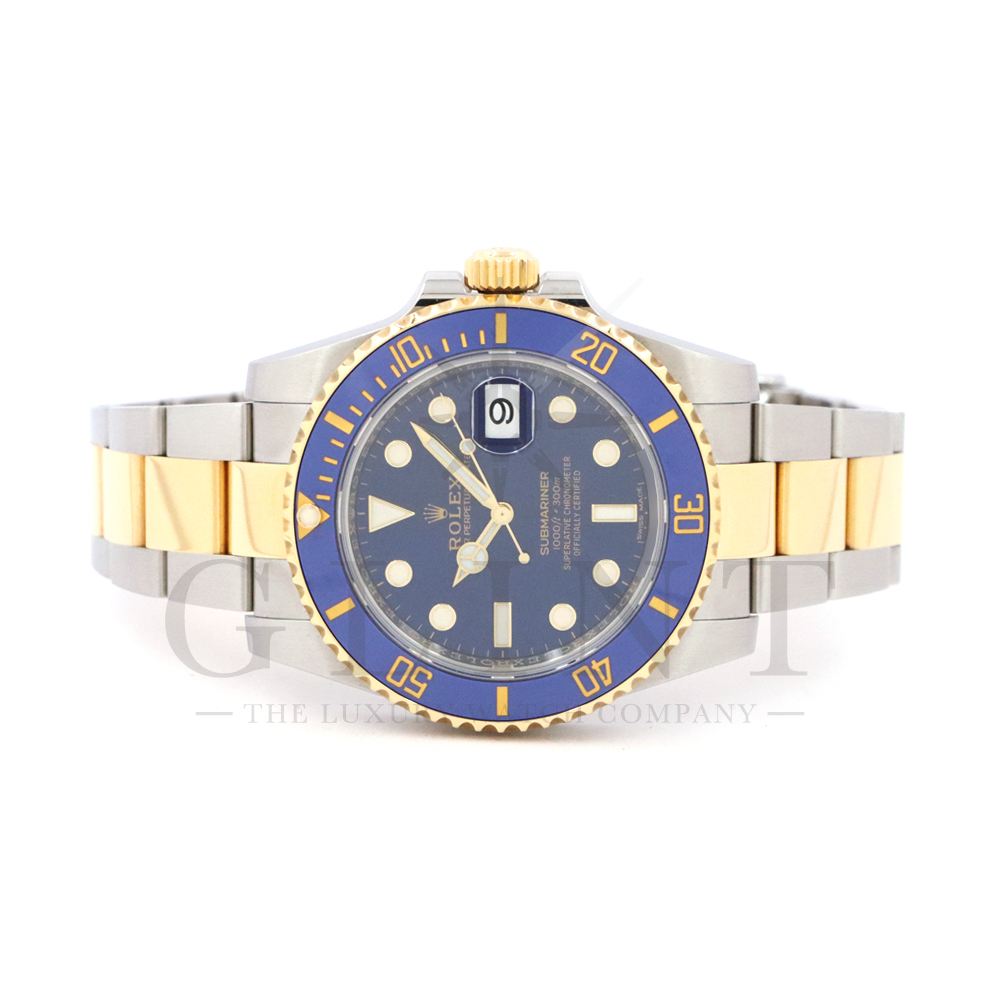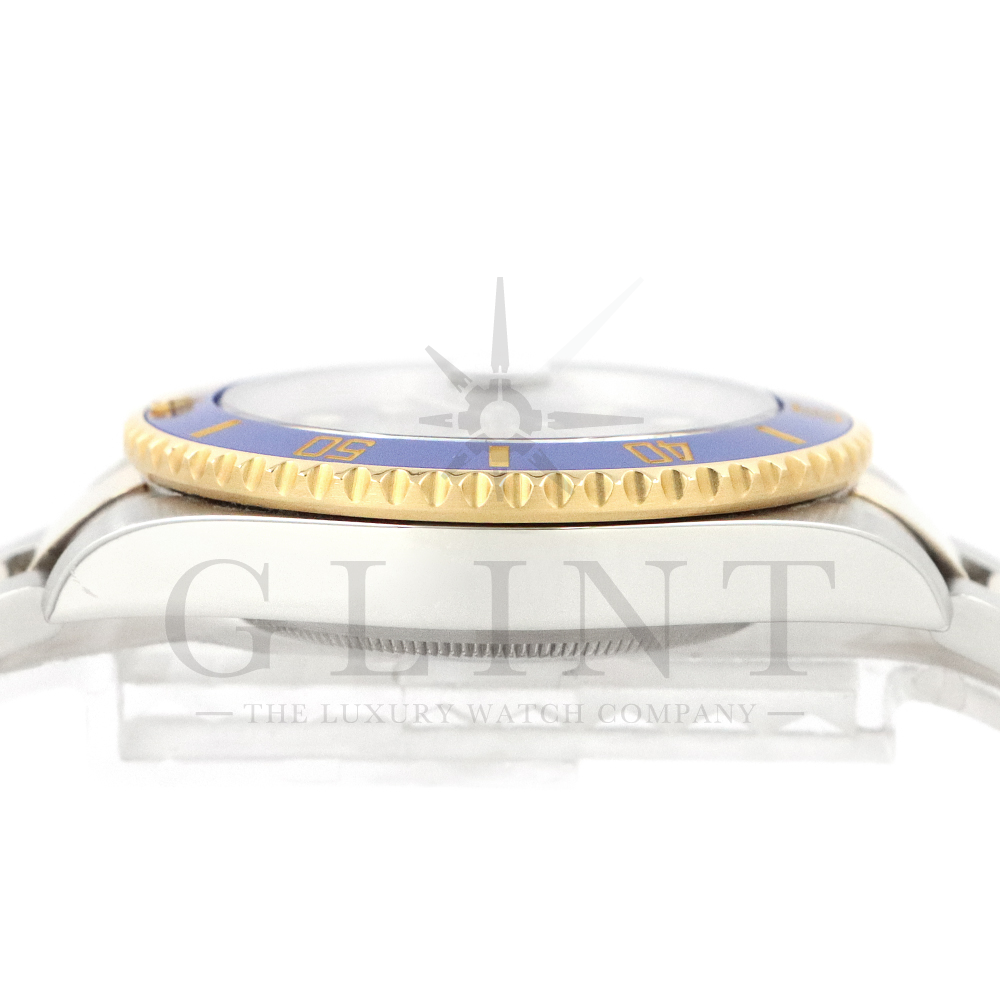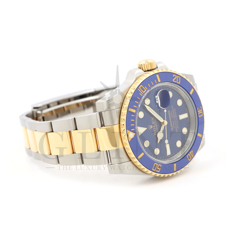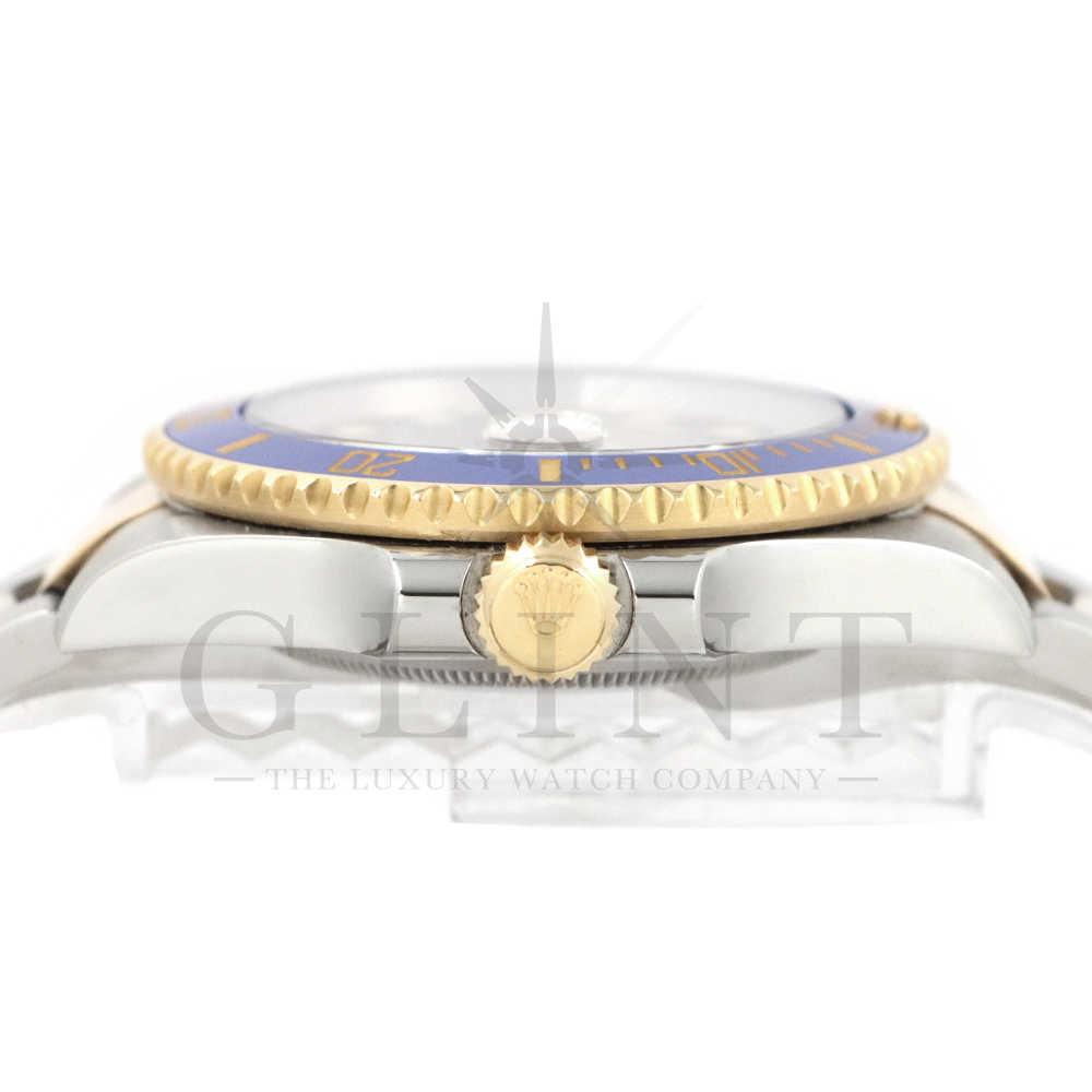 こちらはロレックス サブマリーナー デイト ロレゾールモデルです。通称“青サブ”と呼ばれるモデルは、サブマリーナー・コンビ史上、最も高級感の溢れるデザインと耐久性で確固たる人気を誇ります。オイスタースチール、18Kイエローゴールドの間を取り持つ、ベゼルと文字盤に配された艶有りのブルーカラーが筆舌に尽くしがたい美しさを表現してくれるでしょう。青く発光するクロマライトの夜光との相性も抜群です。今もなお進化し続けるダイバーウオッチは必ずやユーザーの思いに応えてくれる最高の一本です。