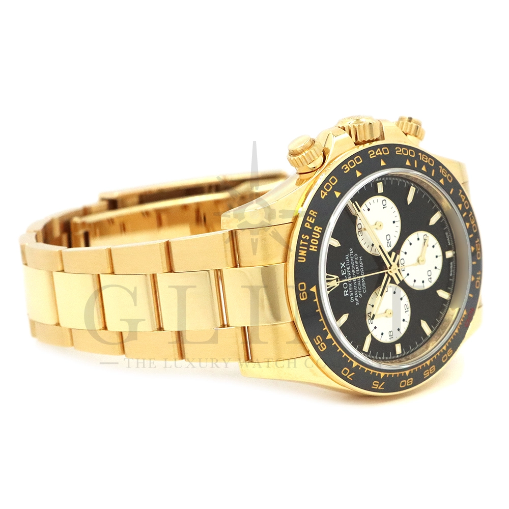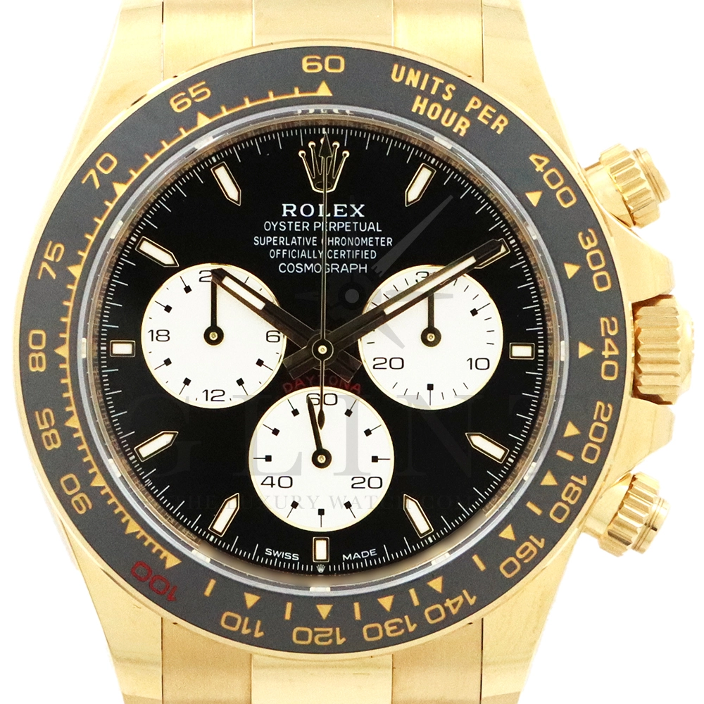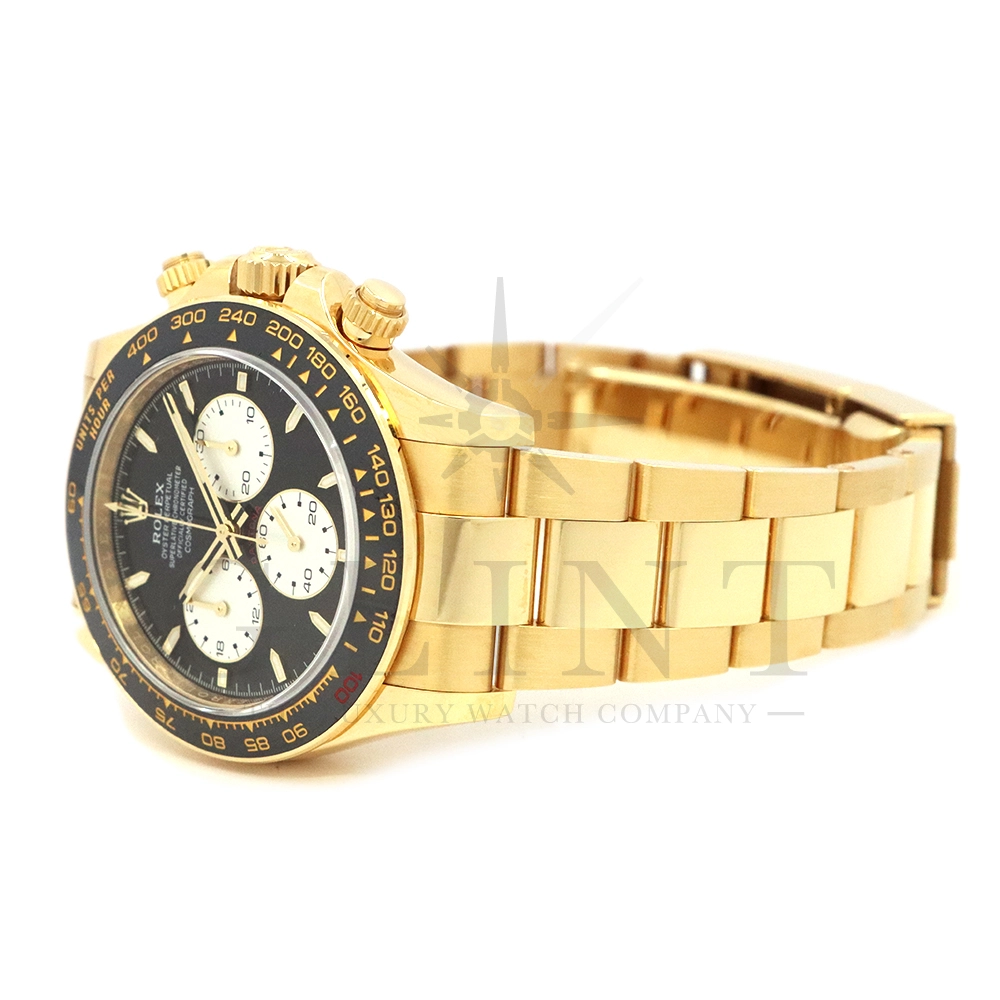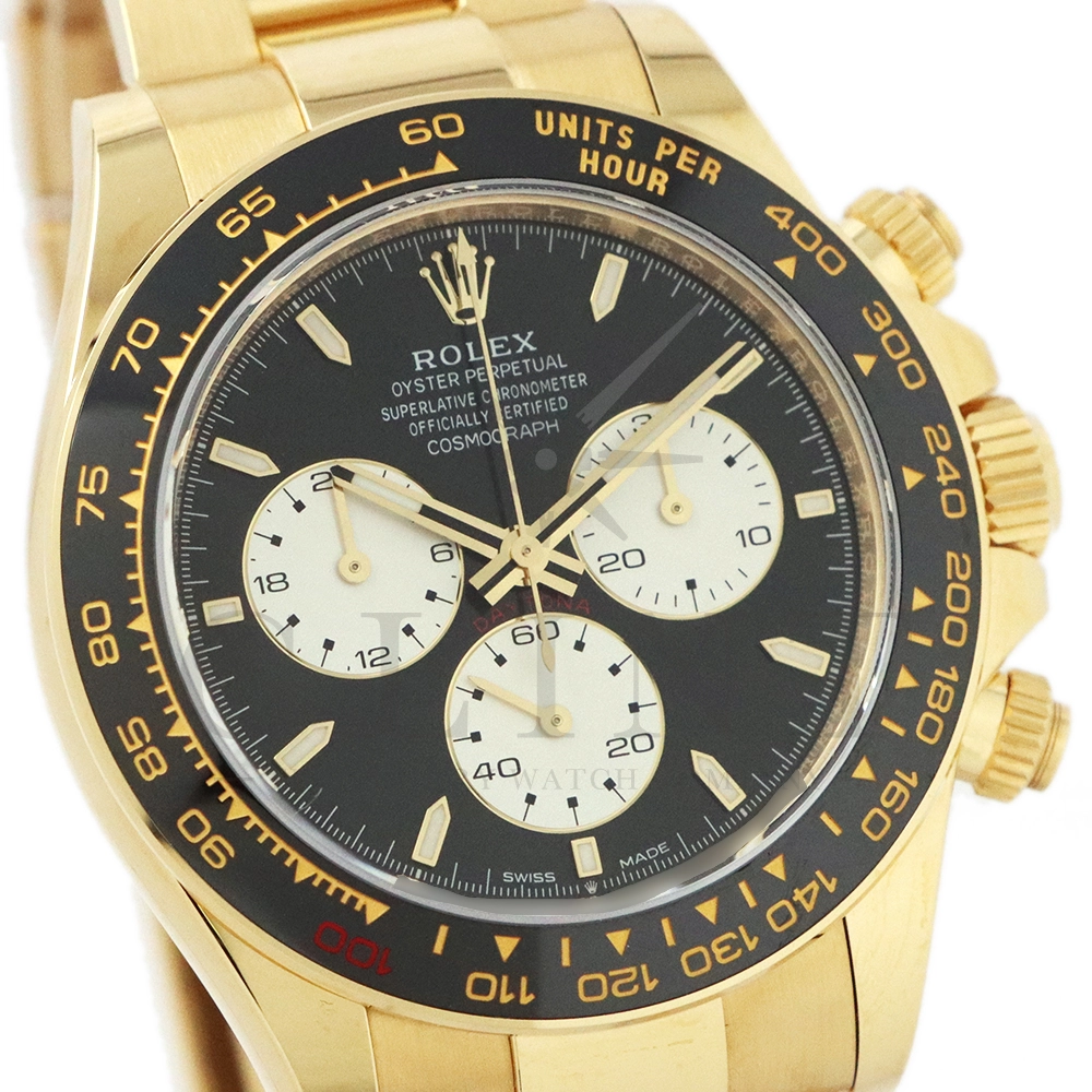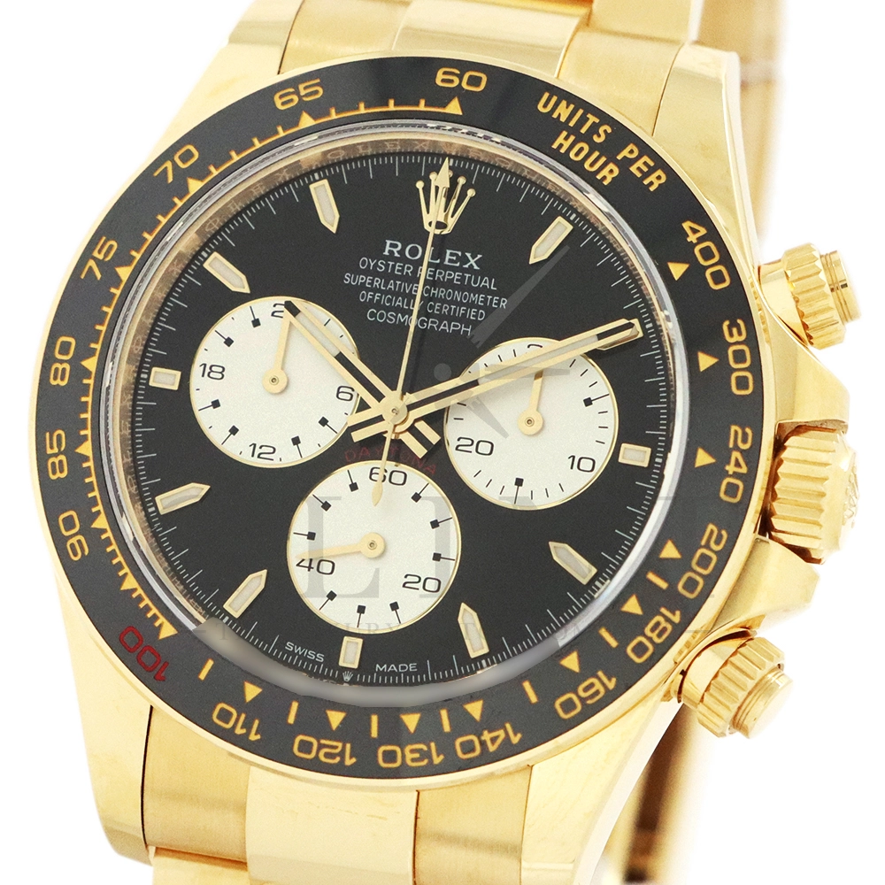 こちらはロレックス デイトナ 126528LNです。2023年のル・マン24時間レース第100回を記念して発表された126529LNのイエローゴールドモデルが登場。同様に文字盤には往年のヴィンテージモデルに見受けられたモチーフ、エキゾチックダイアル(ポール・ニューマンダイアル)を再現しており、イエローゴールドで縁取られたブラックのセラミック製ベゼルには、メーターの「100」がレッドセラミックでコーティング。ムーブメントは126529LNと同じく9時位置の積算計がル・マン24時間レースに因んで12時間から24時間に変更されたことに伴い、Cal.4131をブラッシュアップしたCal.4132を搭載しております。更にケースバックはシースルー化されたことによって、Cal.4132を堪能することができるでしょう。デイトナ60周年、ル・マン24時間レース100周年に相応しい比類なき魅力が存分に詰まった非常に豪華な逸品となっております。