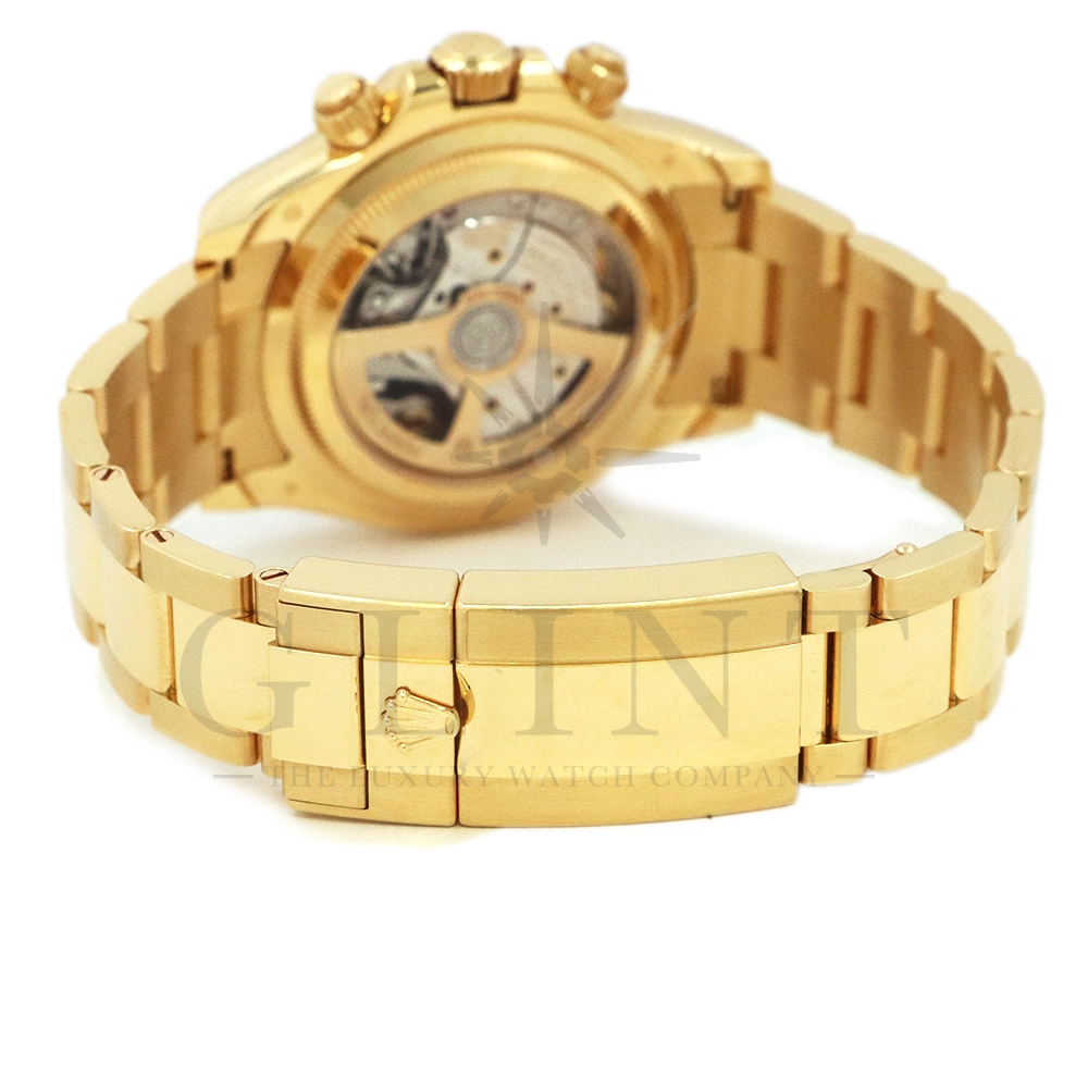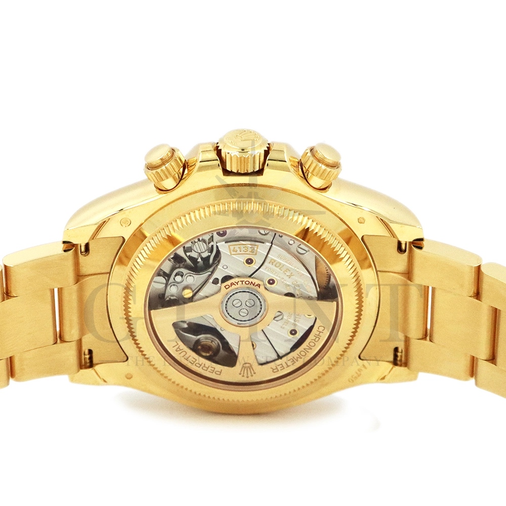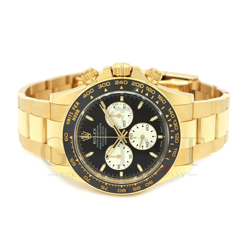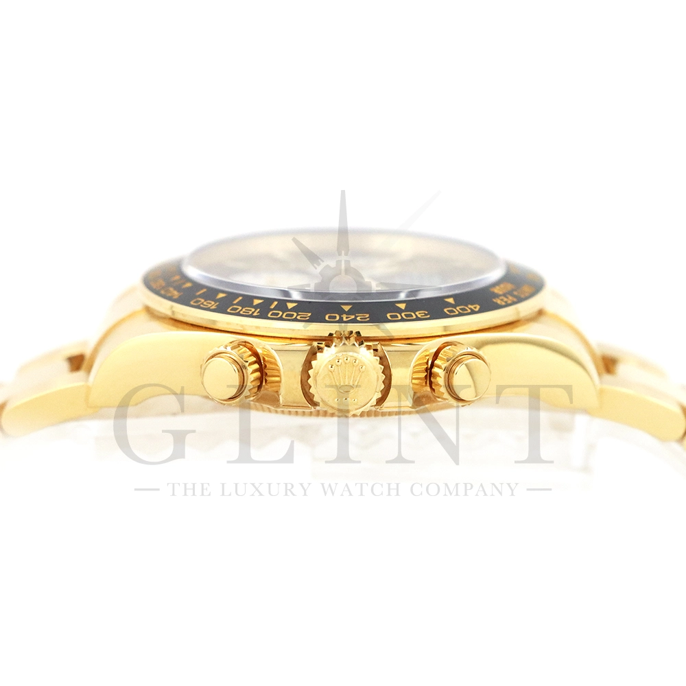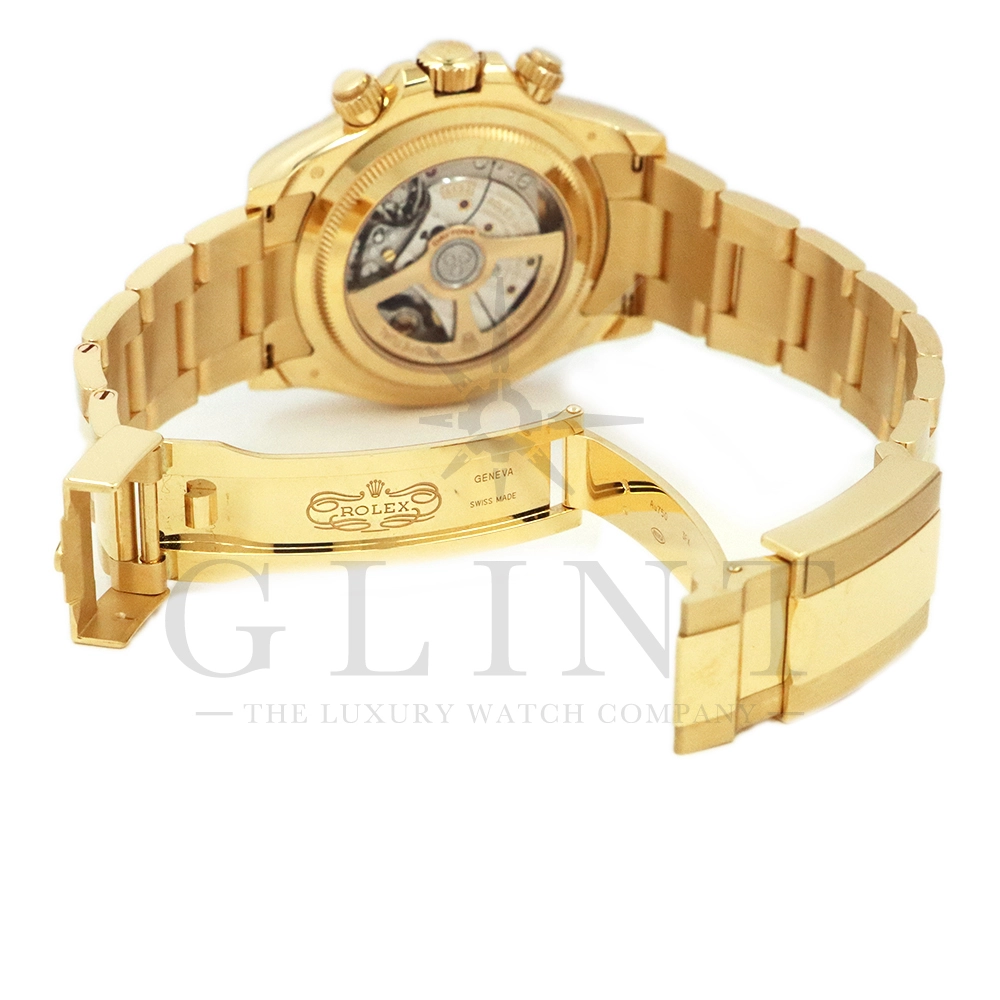 こちらはロレックス デイトナ 126528LNです。2023年のル・マン24時間レース第100回を記念して発表された126529LNのイエローゴールドモデルが登場。同様に文字盤には往年のヴィンテージモデルに見受けられたモチーフ、エキゾチックダイアル(ポール・ニューマンダイアル)を再現しており、イエローゴールドで縁取られたブラックのセラミック製ベゼルには、メーターの「100」がレッドセラミックでコーティング。ムーブメントは126529LNと同じく9時位置の積算計がル・マン24時間レースに因んで12時間から24時間に変更されたことに伴い、Cal.4131をブラッシュアップしたCal.4132を搭載しております。更にケースバックはシースルー化されたことによって、Cal.4132を堪能することができるでしょう。デイトナ60周年、ル・マン24時間レース100周年に相応しい比類なき魅力が存分に詰まった非常に豪華な逸品となっております。