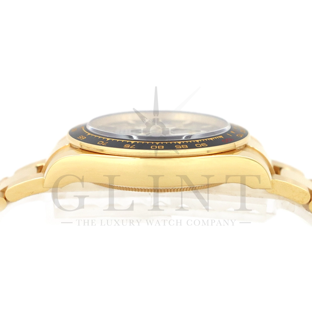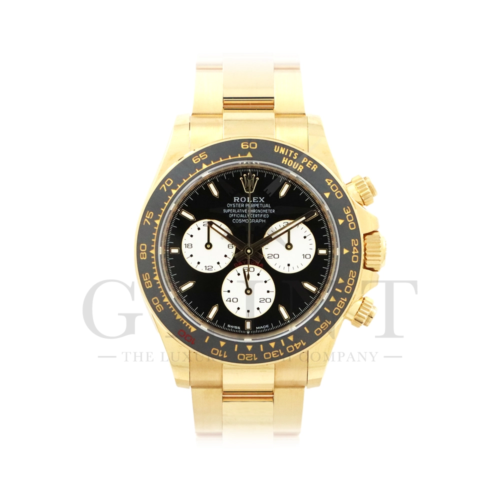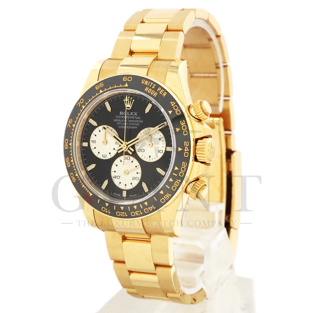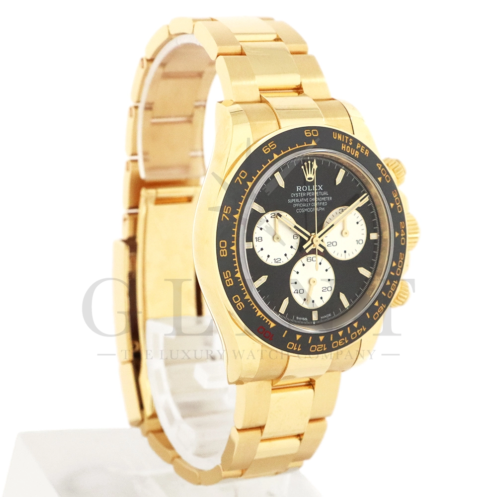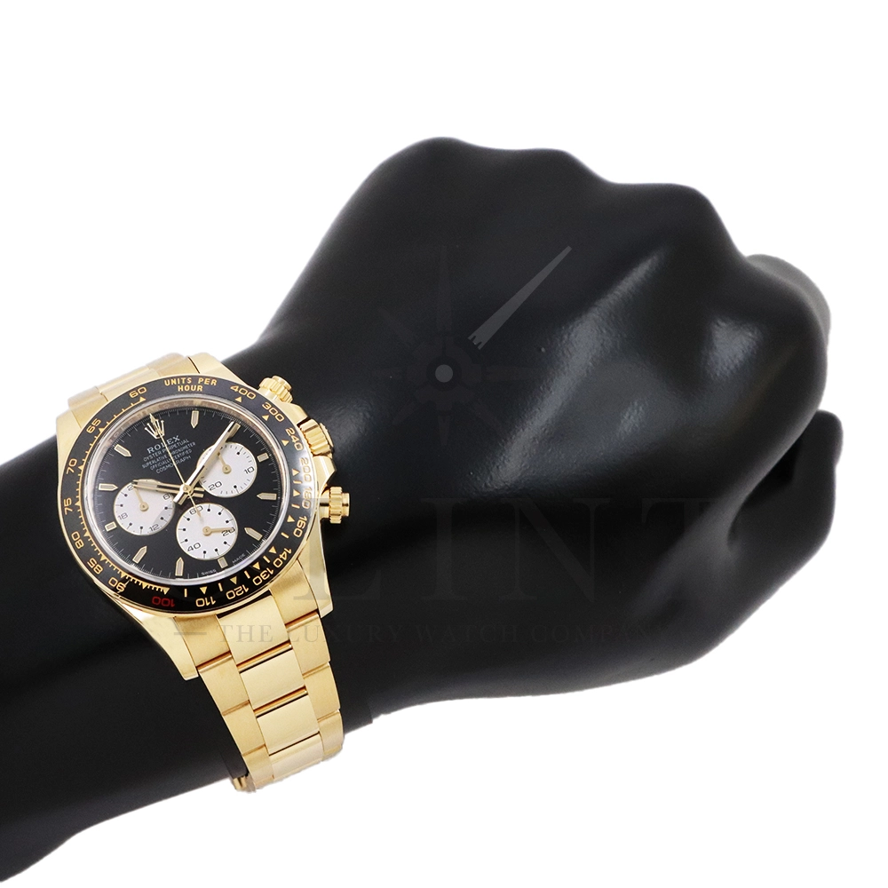 こちらはロレックス デイトナ 126528LNです。2023年のル・マン24時間レース第100回を記念して発表された126529LNのイエローゴールドモデルが登場。同様に文字盤には往年のヴィンテージモデルに見受けられたモチーフ、エキゾチックダイアル(ポール・ニューマンダイアル)を再現しており、イエローゴールドで縁取られたブラックのセラミック製ベゼルには、メーターの「100」がレッドセラミックでコーティング。ムーブメントは126529LNと同じく9時位置の積算計がル・マン24時間レースに因んで12時間から24時間に変更されたことに伴い、Cal.4131をブラッシュアップしたCal.4132を搭載しております。更にケースバックはシースルー化されたことによって、Cal.4132を堪能することができるでしょう。デイトナ60周年、ル・マン24時間レース100周年に相応しい比類なき魅力が存分に詰まった非常に豪華な逸品となっております。