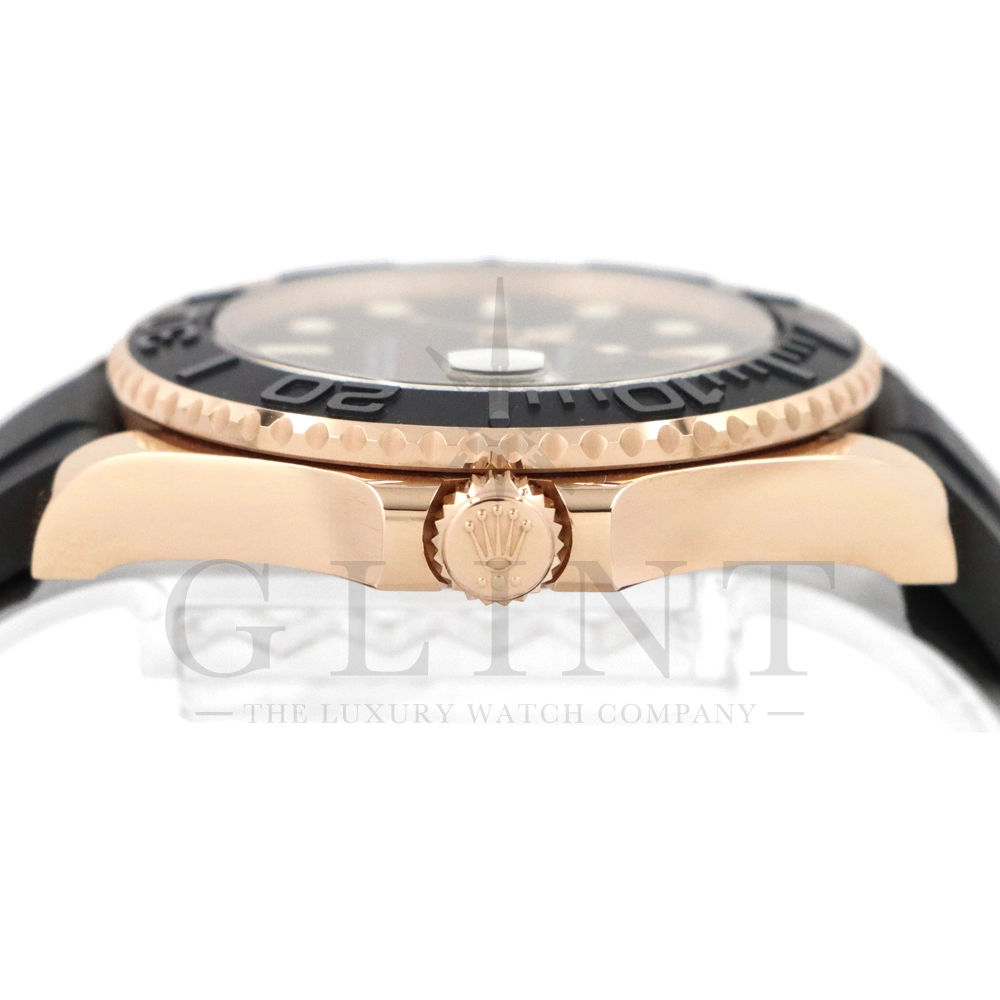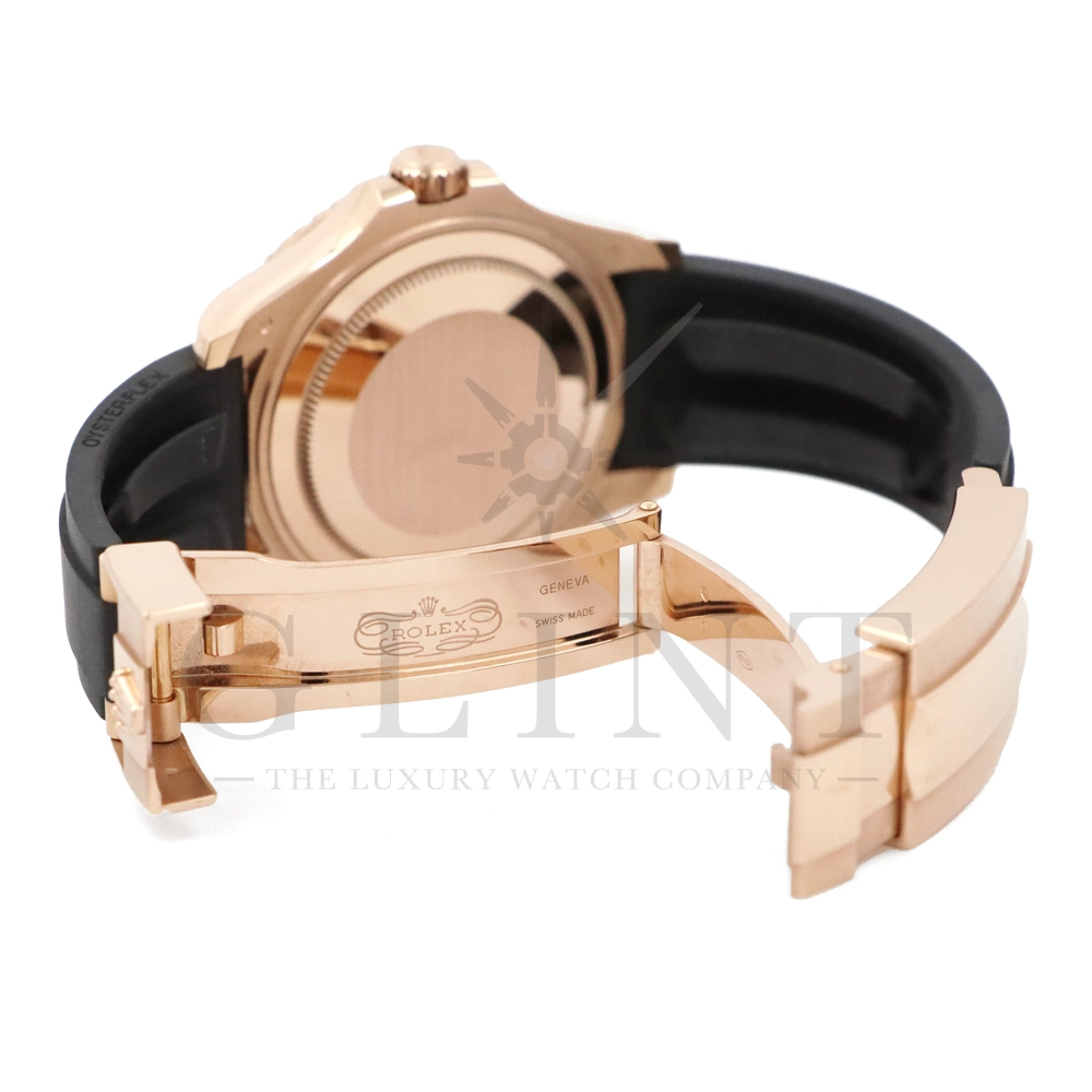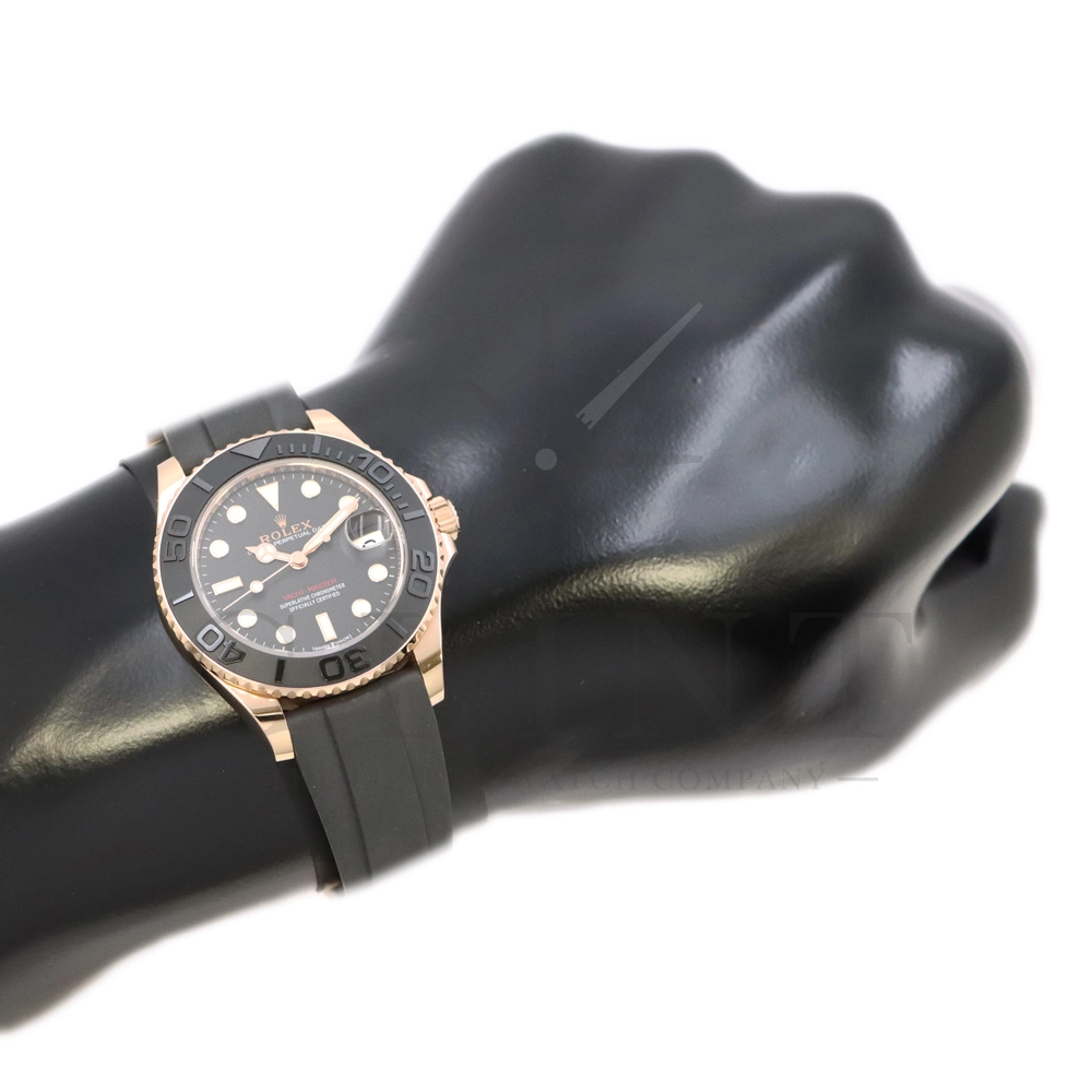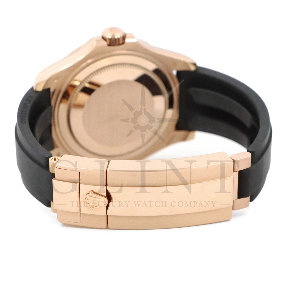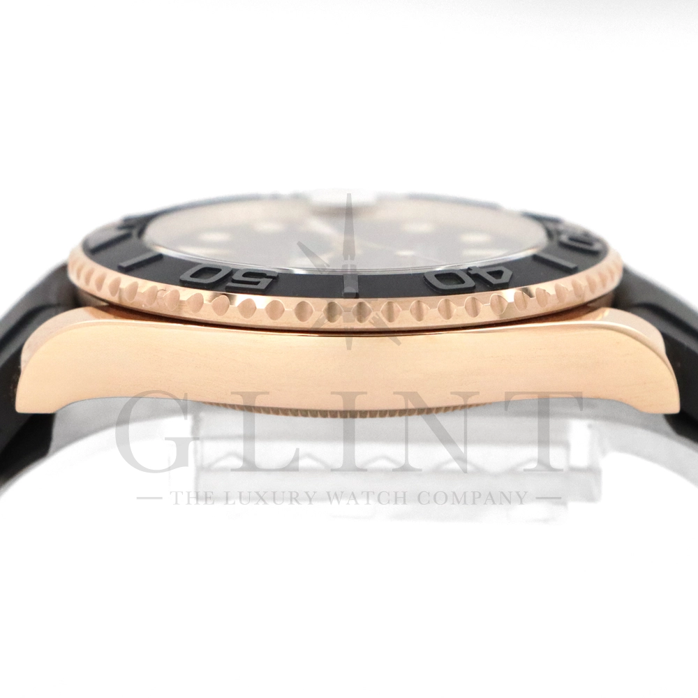 こちらはヨットマスター37 268655です。2015年に発表されたエバーローズゴールドモデルのヨットマスター。以前のモデルからは6時位置に王冠マークが足され、キャリバーがCal.2236に変更。また、バックルにはサブマリーナーなどで採用されているグライドロックシステムが搭載され、ブレスレットの調整が容易になりました。ブレスレットにはオイスターフレックスを採用し、軟性のあるチタン・ニッケル合金製ブレードを、しなやかで装着感に優れるエラストマー(人工ラバー)で覆っており、極めて高い耐久性と装着感を実現しております。従来のヨットマスターとは一線を画した高級感を味わえる一本です。